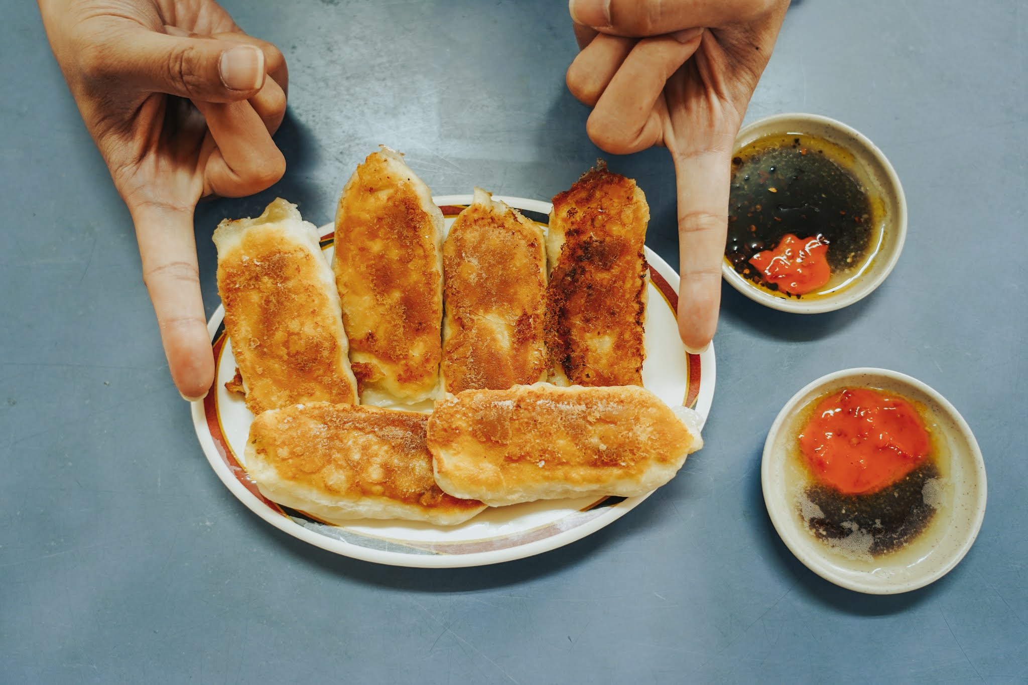 點單時呆呆很保守,嘗試性地點了一籠湯包和蒸餃,但最招牌的鍋貼竟然只點了六個?!我說這也太少了吧,騎這麼久的車,一個人吃十個鍋貼不為過吧?轉頭看看其他客人,每個人面前都是一大盤整整十個鍋貼配酸辣湯或玉米濃湯啊!