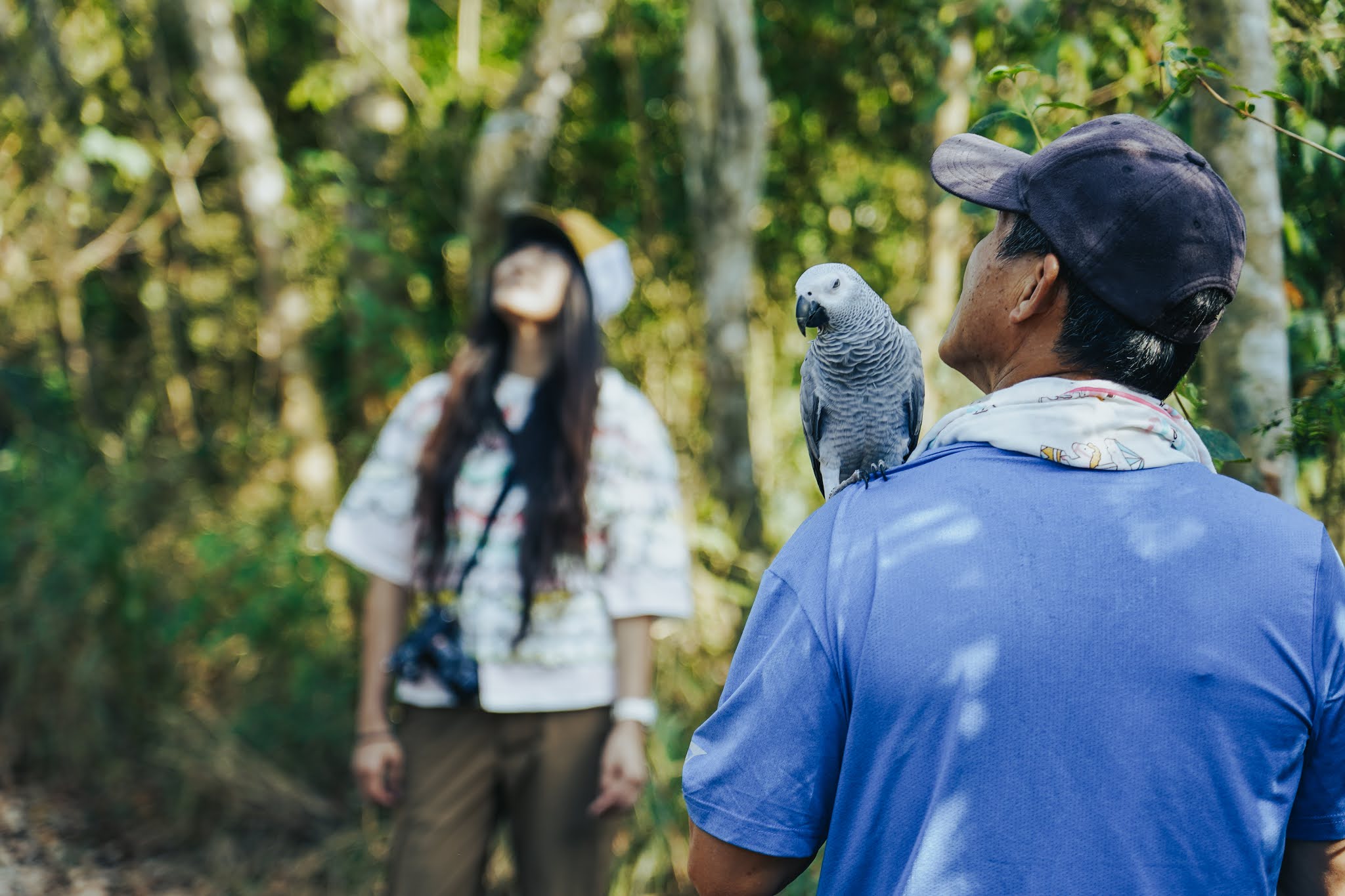 走進十八彎挑鹽古道前,遇見一位帶灰鸚鵡爬山的大叔,聊了幾句後他的朋友和妻子陸續到齊,身後還跟了兩隻小狗,黑的名字叫可可,吉娃娃是麻吉,都是老狗。喔對了,那隻鸚鵡名叫阿妞,可愛極了,一伸手過去就輕輕咬你,跟我家的三花貓一樣⋯⋯