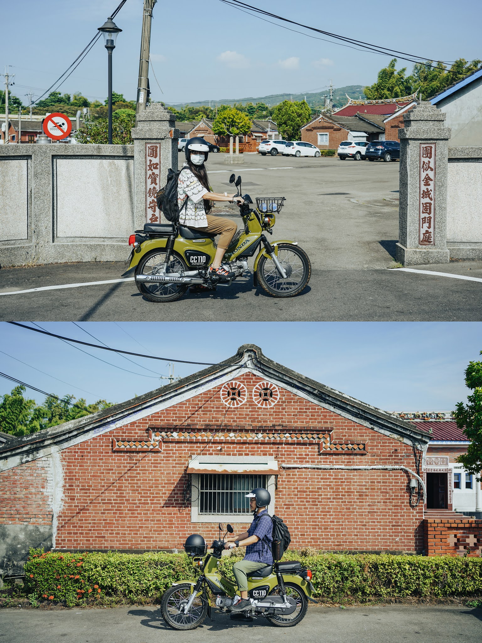 抵達古厝!其實呆呆不會騎車,只是讓她跨坐上去過過癮,真正的駕駛是阿泰啦。