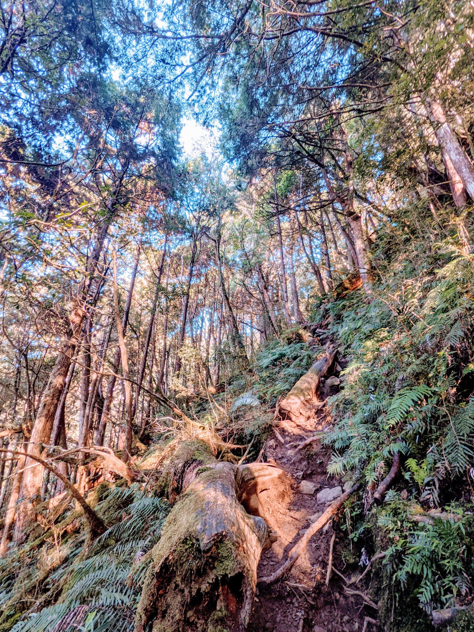 巨木登山口這裡有很多持續陡上的路段,沿途都是樹枝盤根錯節交織而成的路,走的時候需要特別注意踩點,踩到樹枝的話有時容易滑倒或是拐到腳。