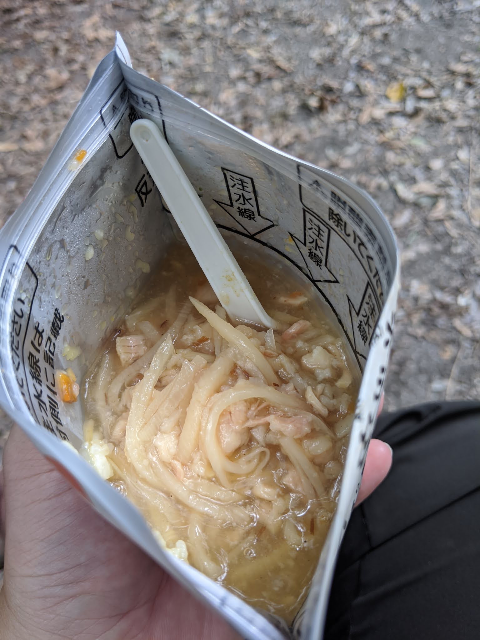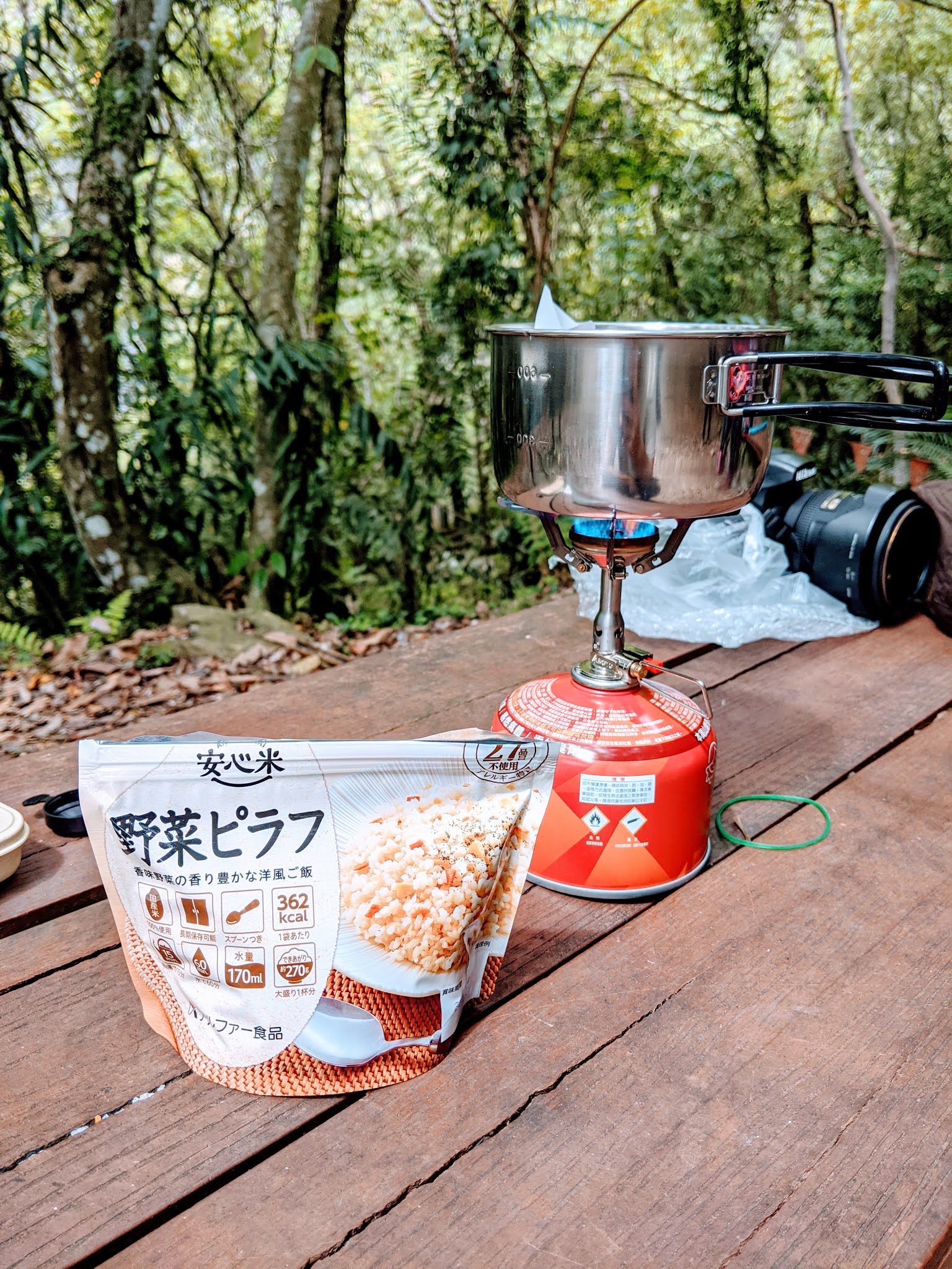 今天的午餐是野菜口味的乾燥飯+香菇肉羹調理包,能夠在山上吃到熱食是一件很棒的事情。