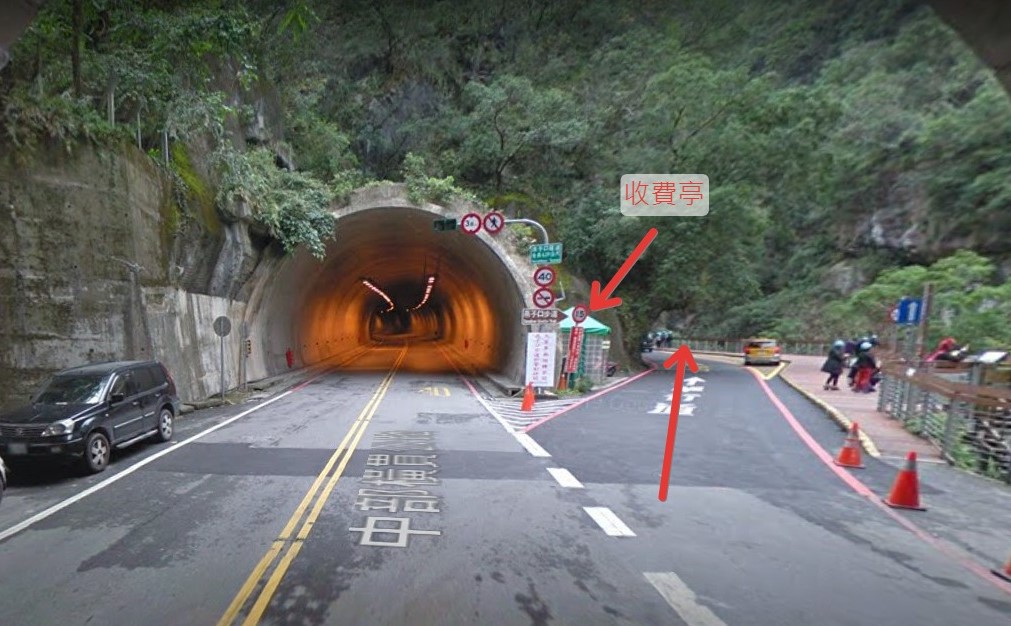 自行開車: 導航至錐麓古道即可,主要停車地方有兩個,一個是在燕子口收費亭對面馬路的白線位置,只能停幾輛汽車而已,需很早到才停的到,要不然就得從收費亭右手邊的路進去(圖下),往前600公尺,在溪畔安全帽發放處附近看到道路旁的白線內即可停車,再往回走步行至燕子口步道東端錐麓吊橋進入