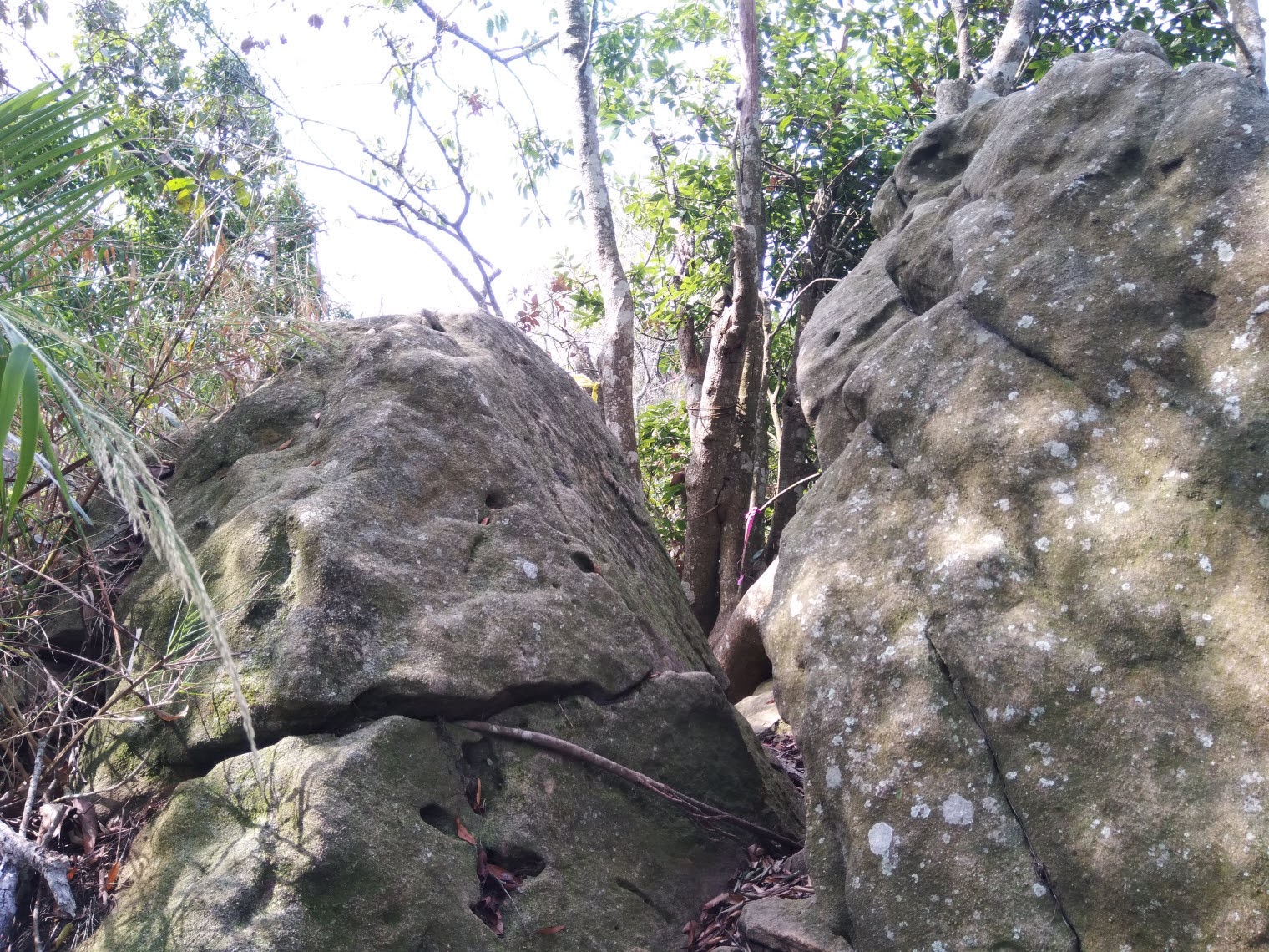 由於眼前兩顆巨石擋道,只能鑽中間縫隙