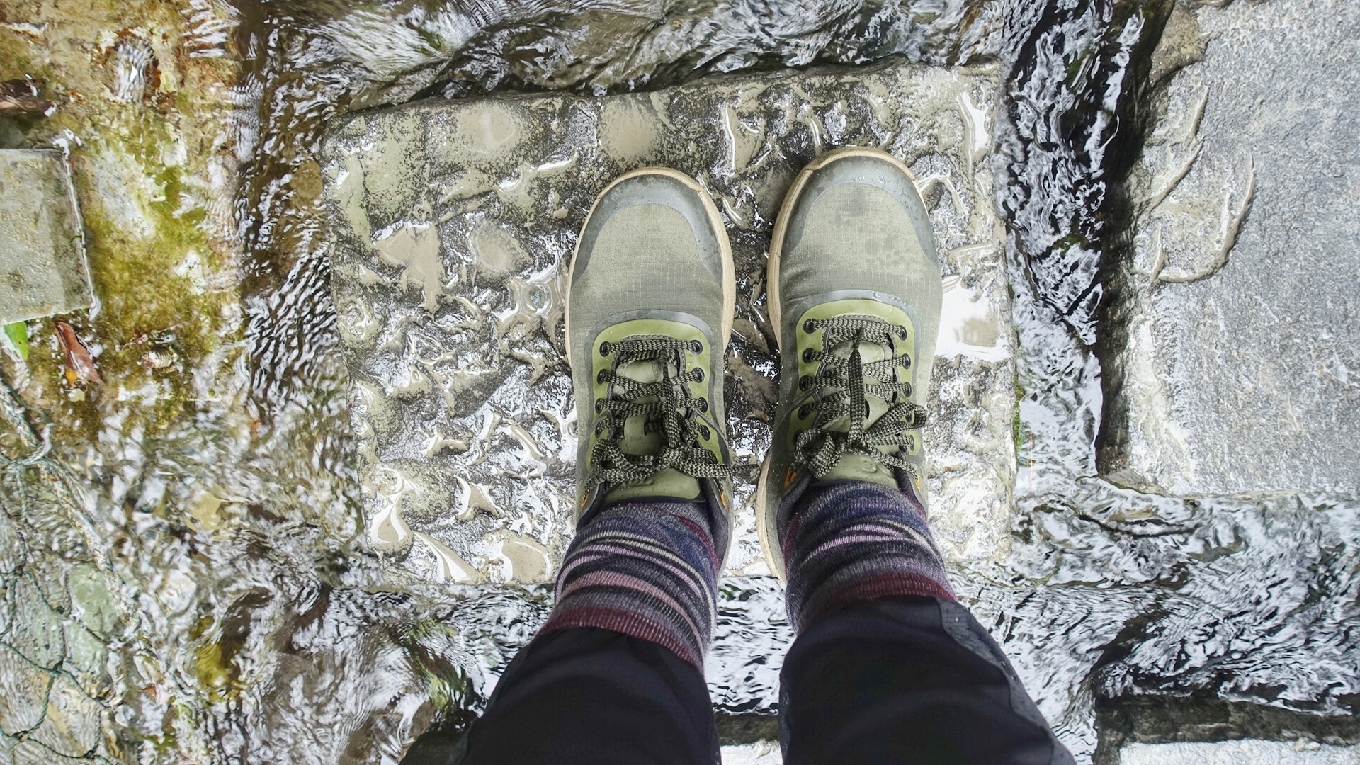 試著踩在淺水區的溪流上,只要不淹過中底,都不會進水,依然保持鞋內的乾燥,表面布料沾濕了,也很快就乾。