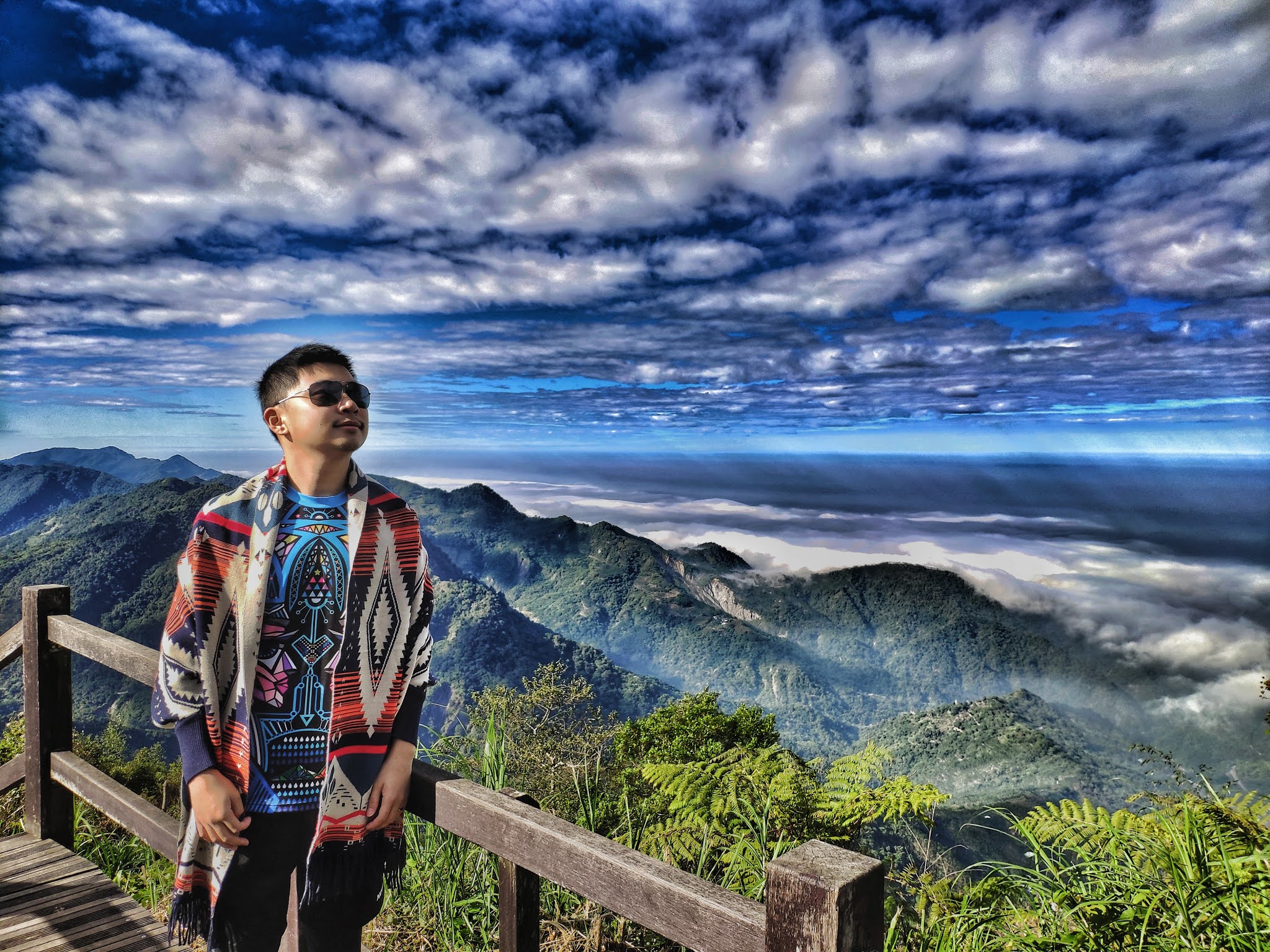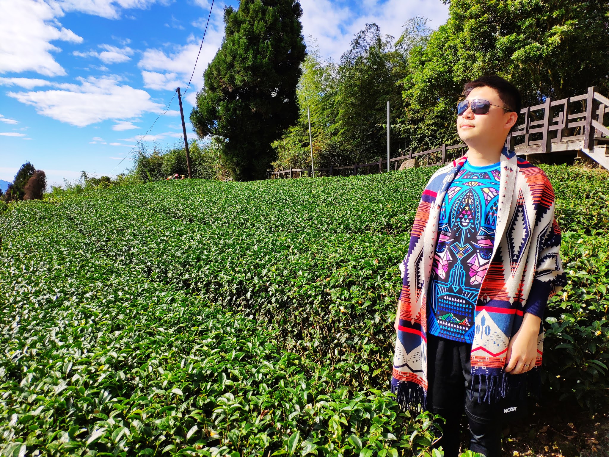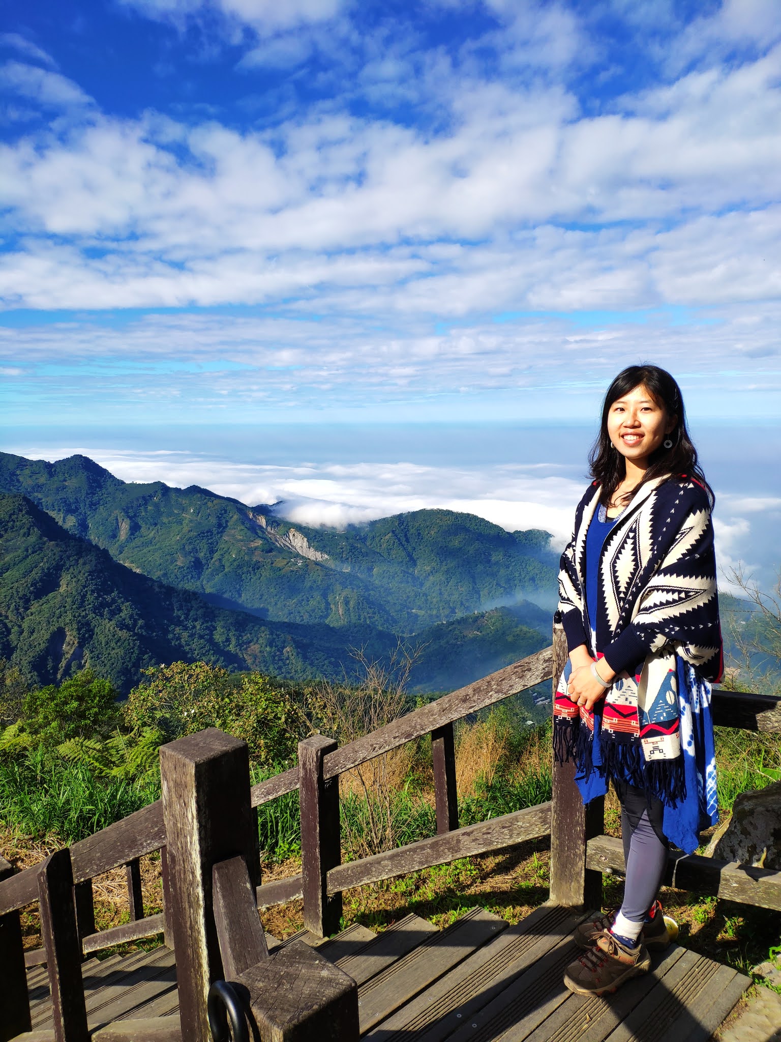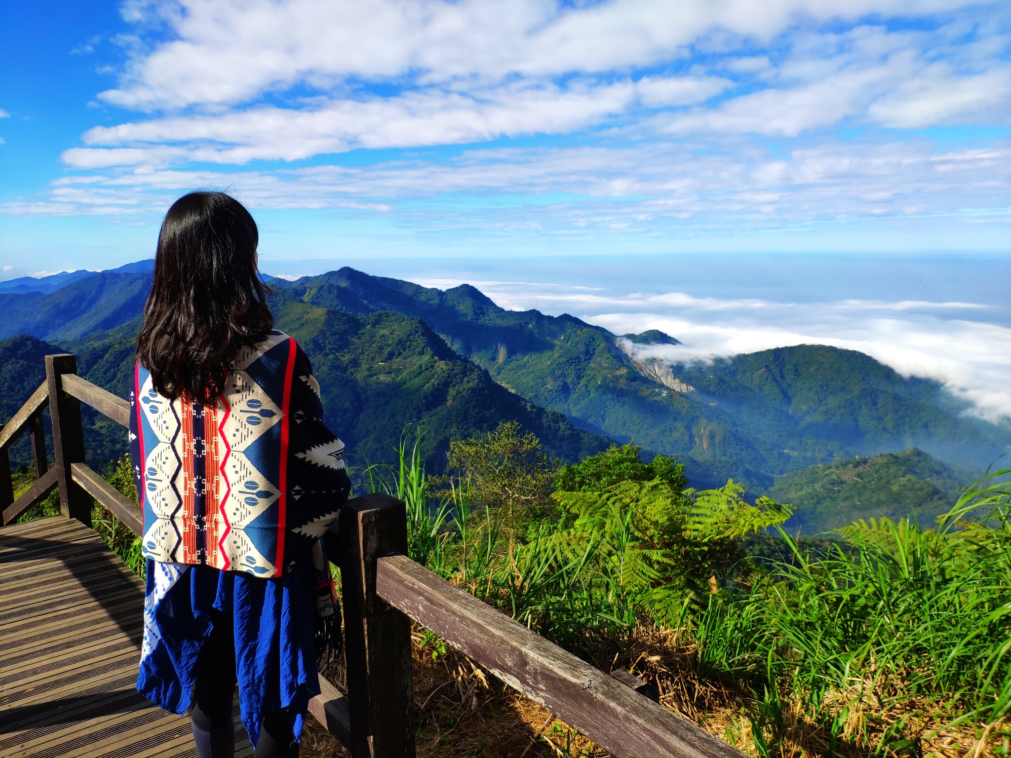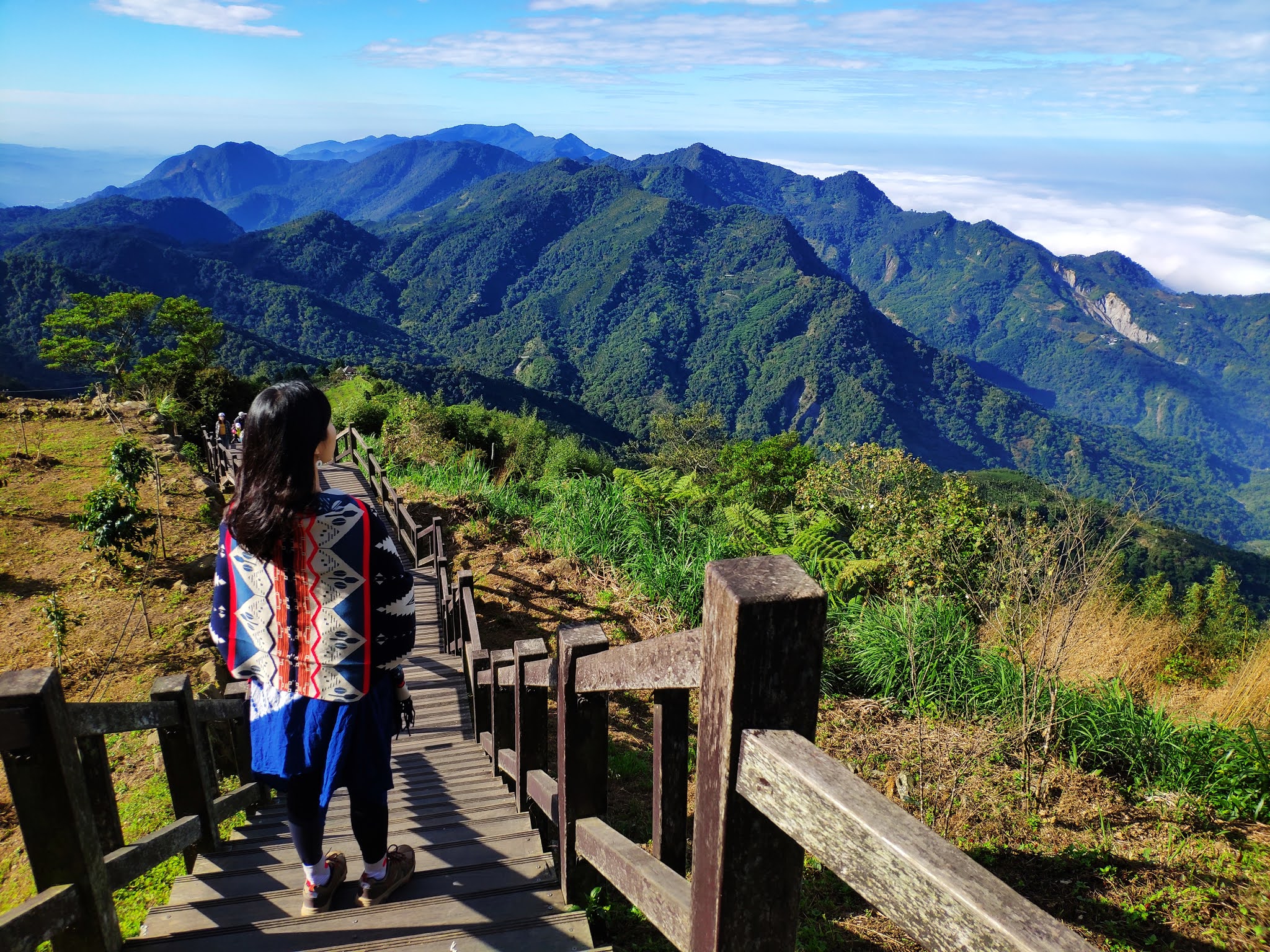 頂端的視野遼闊,可以直接觀賞層巒疊嶂與雲海相互依偎的景象,數不清的山脈交織在一起,步道的延伸感也替照片添增趣味。在阿里山有買色彩繽紛的罩衫外套當作紀念品,這次搭配綠油油的茶園以及藍湛湛的天空,顯得格外亮眼。