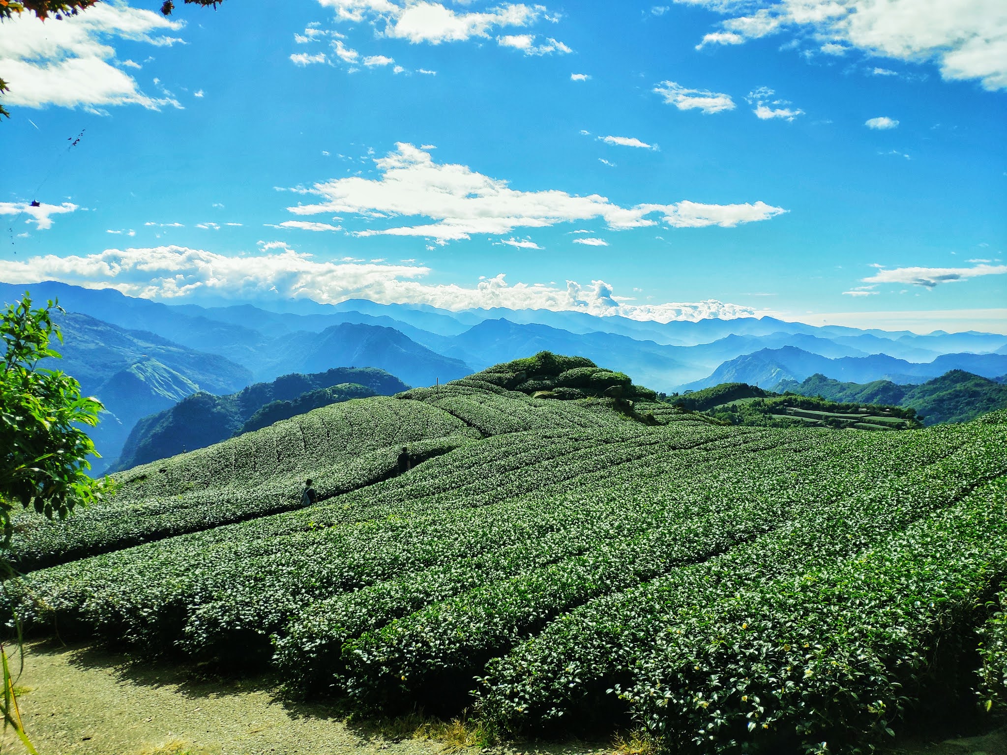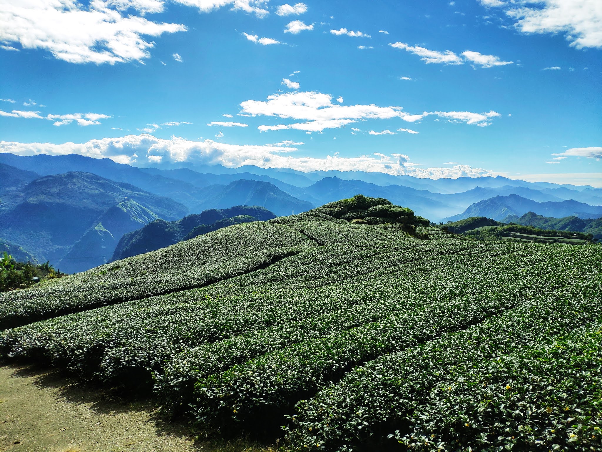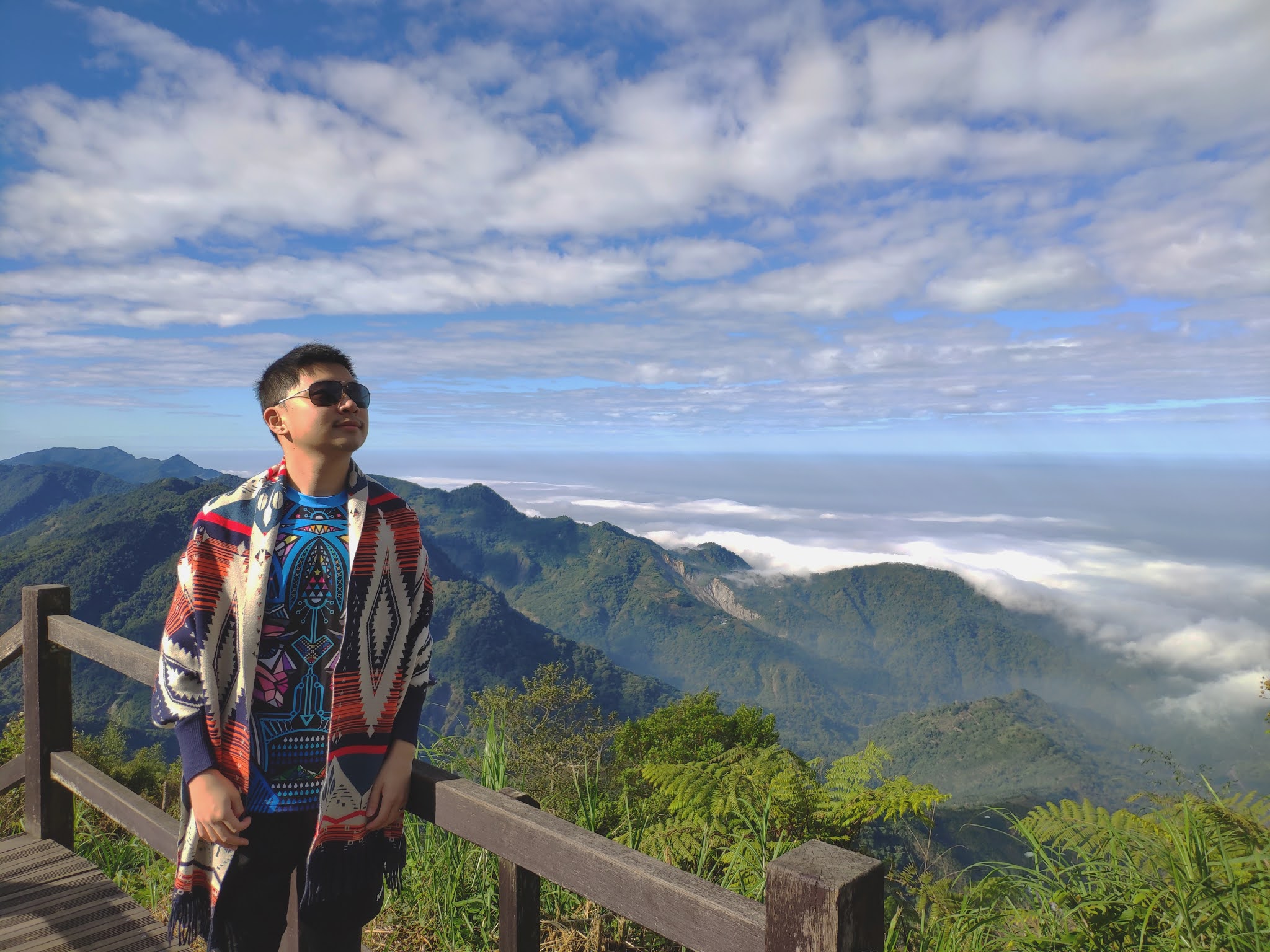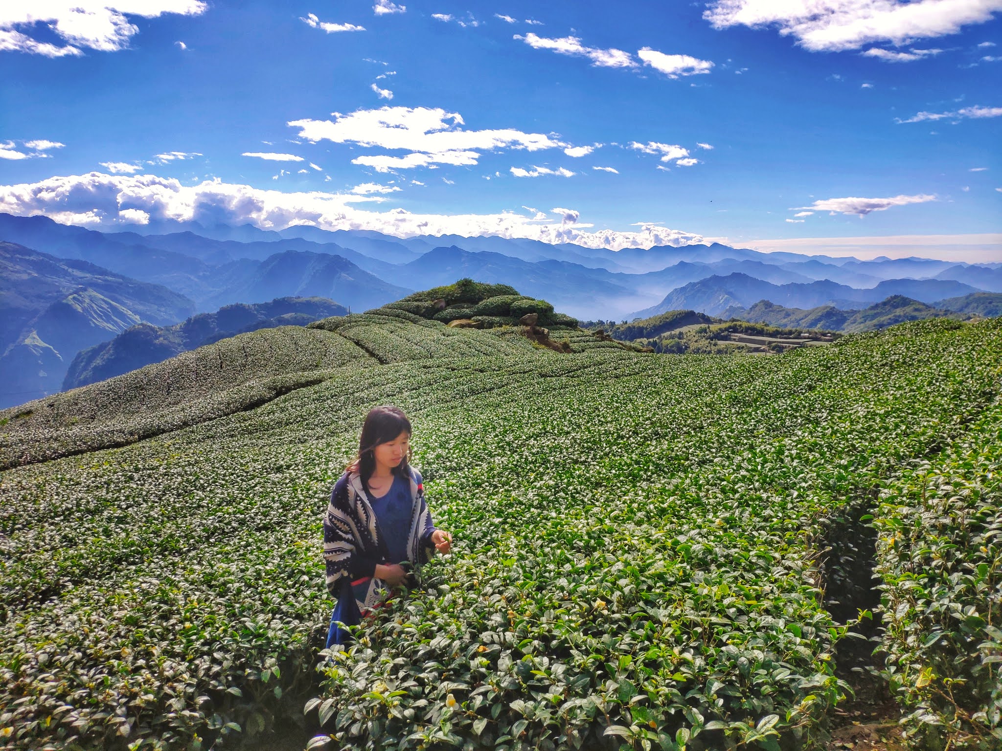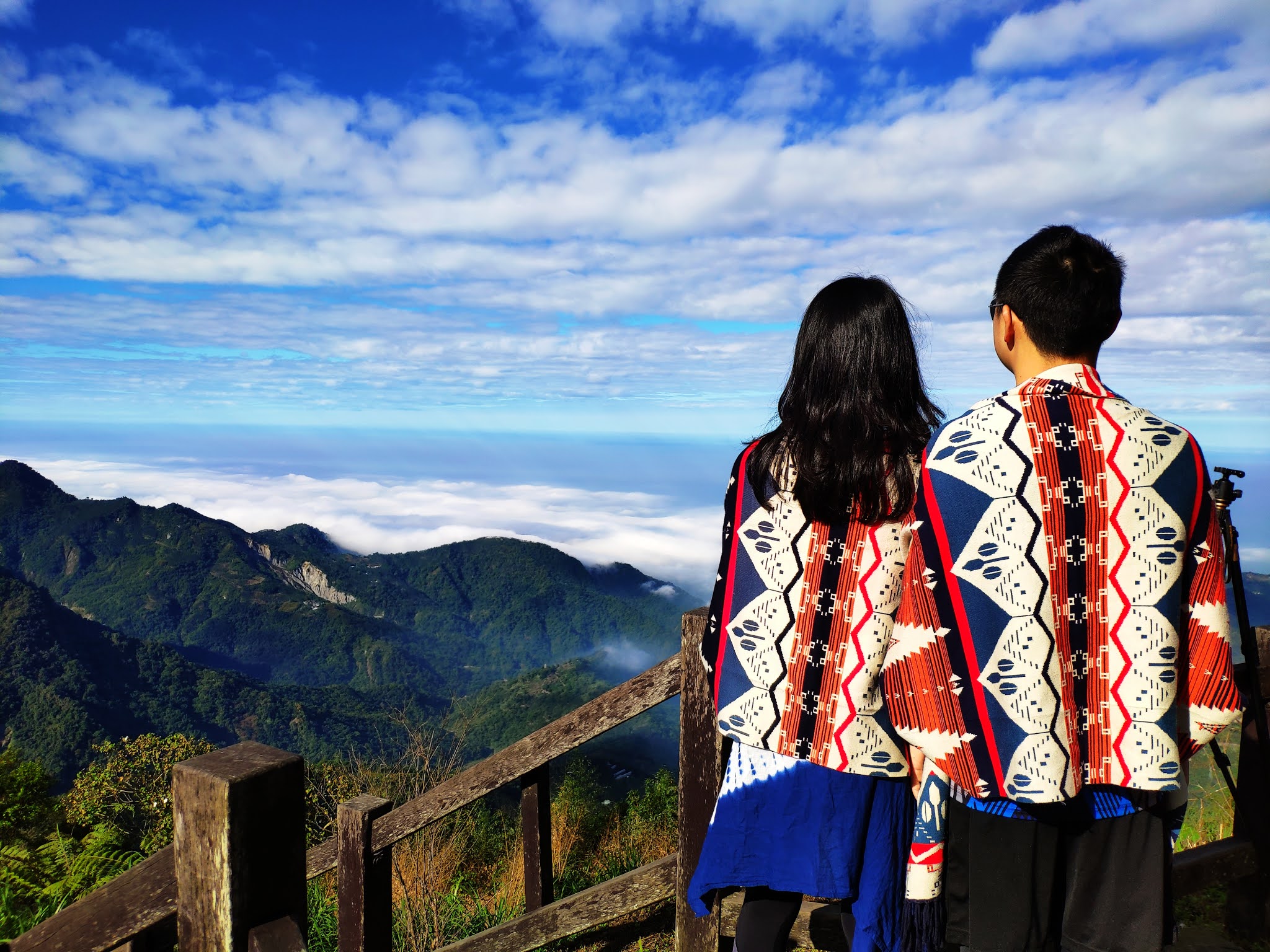 頂端的視野遼闊,可以直接觀賞層巒疊嶂與雲海相互依偎的景象,數不清的山脈交織在一起,步道的延伸感也替照片添增趣味。在阿里山有買色彩繽紛的罩衫外套當作紀念品,這次搭配綠油油的茶園以及藍湛湛的天空,顯得格外亮眼。
