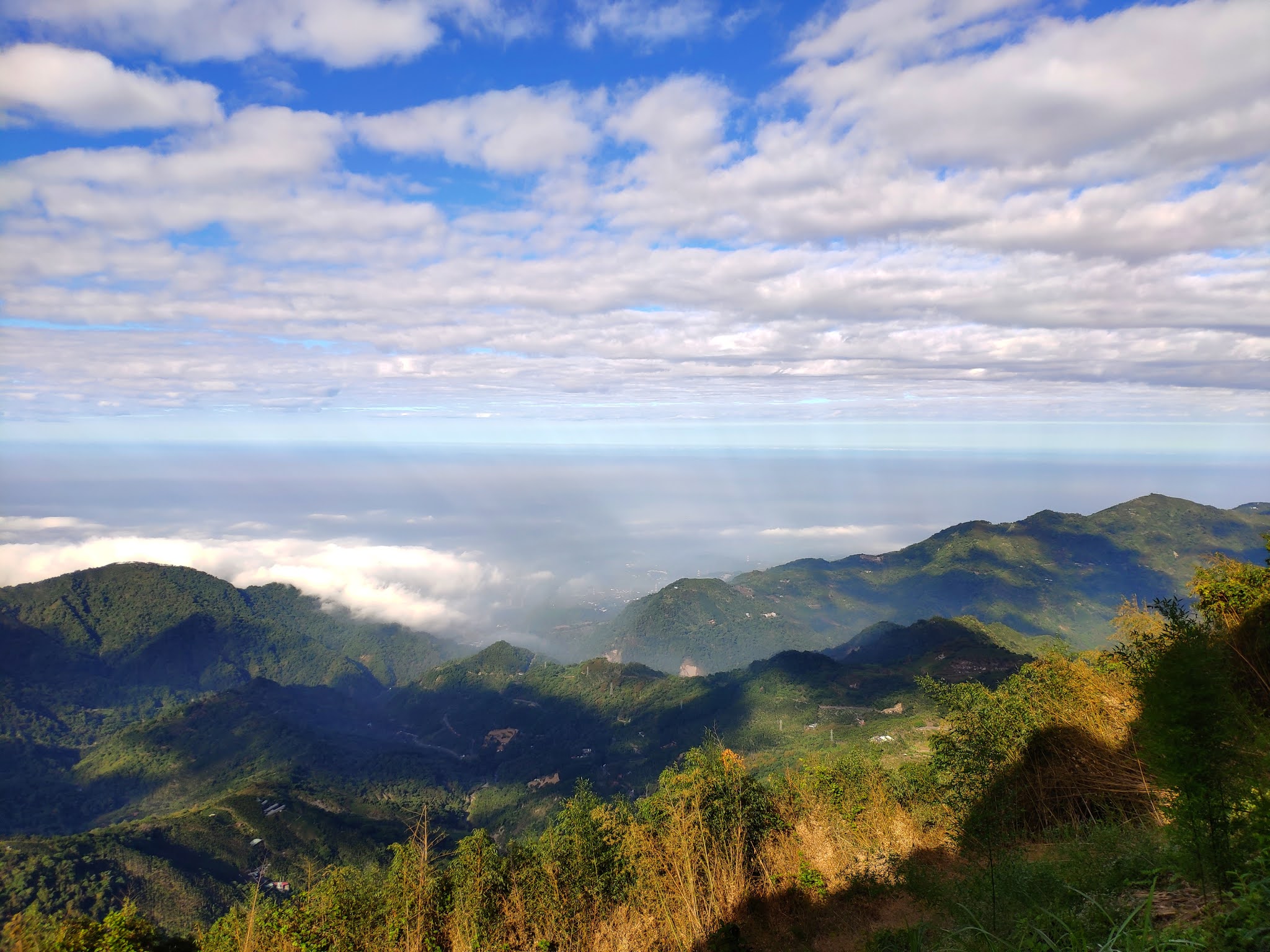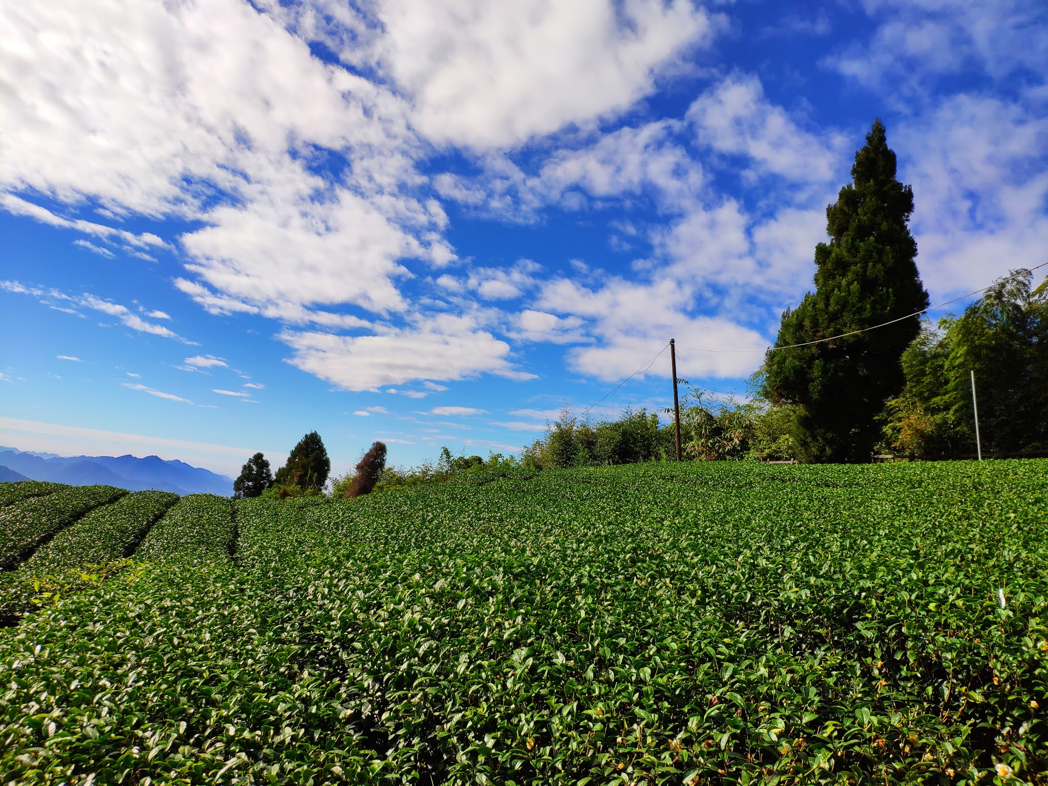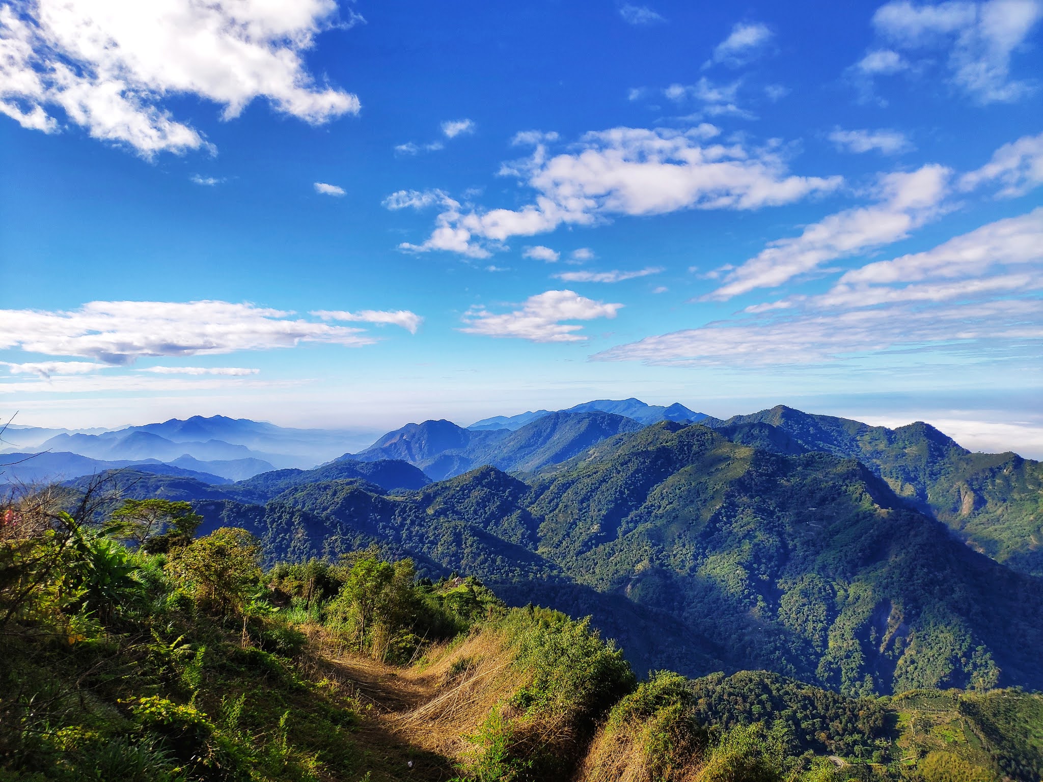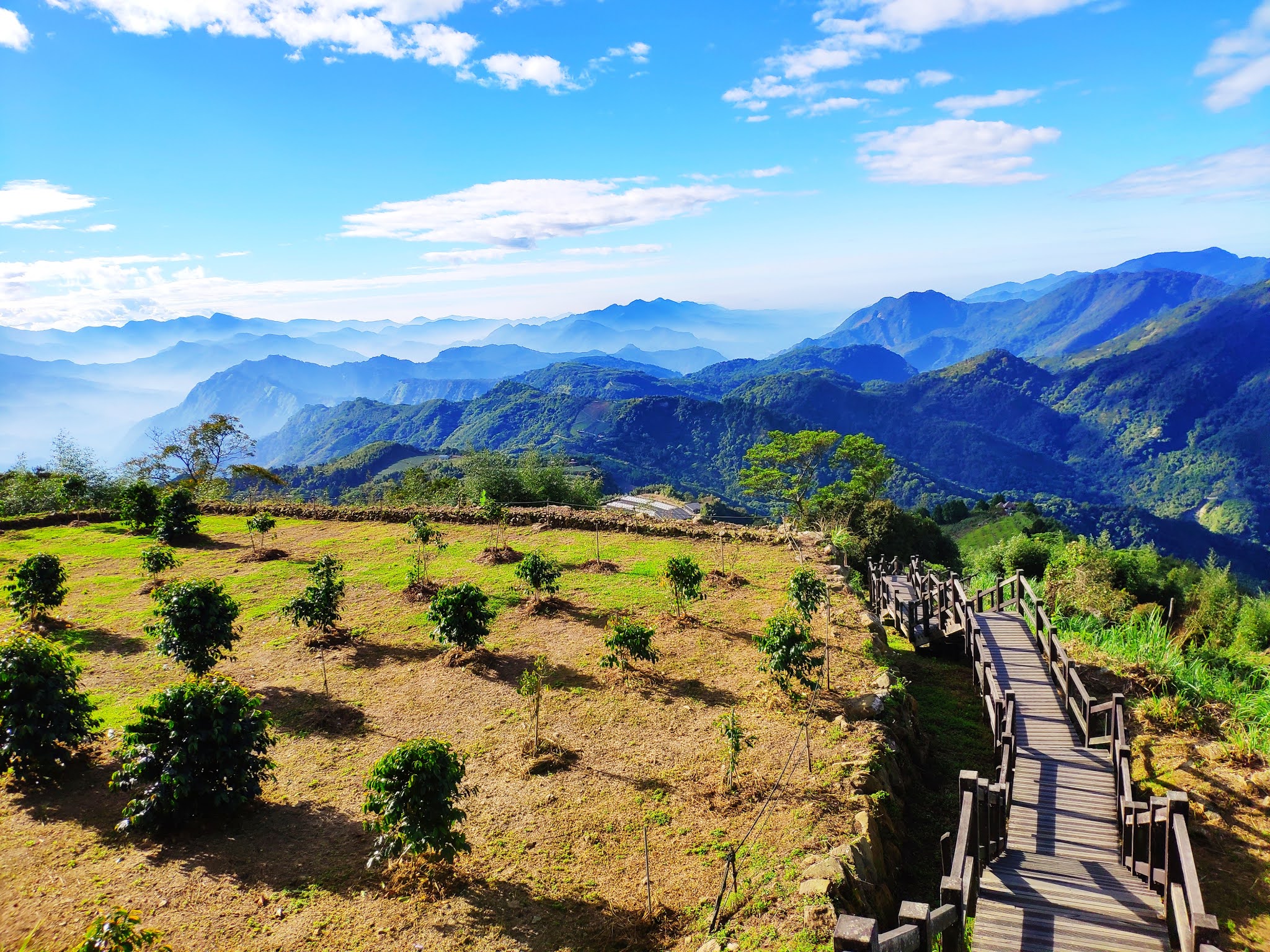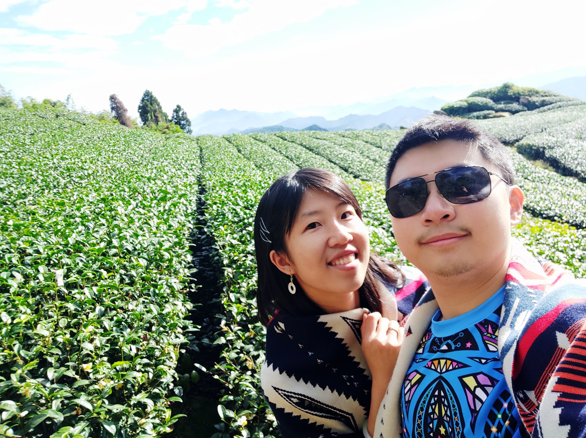 頂端的視野遼闊,可以直接觀賞層巒疊嶂與雲海相互依偎的景象,數不清的山脈交織在一起,步道的延伸感也替照片添增趣味。在阿里山有買色彩繽紛的罩衫外套當作紀念品,這次搭配綠油油的茶園以及藍湛湛的天空,顯得格外亮眼。