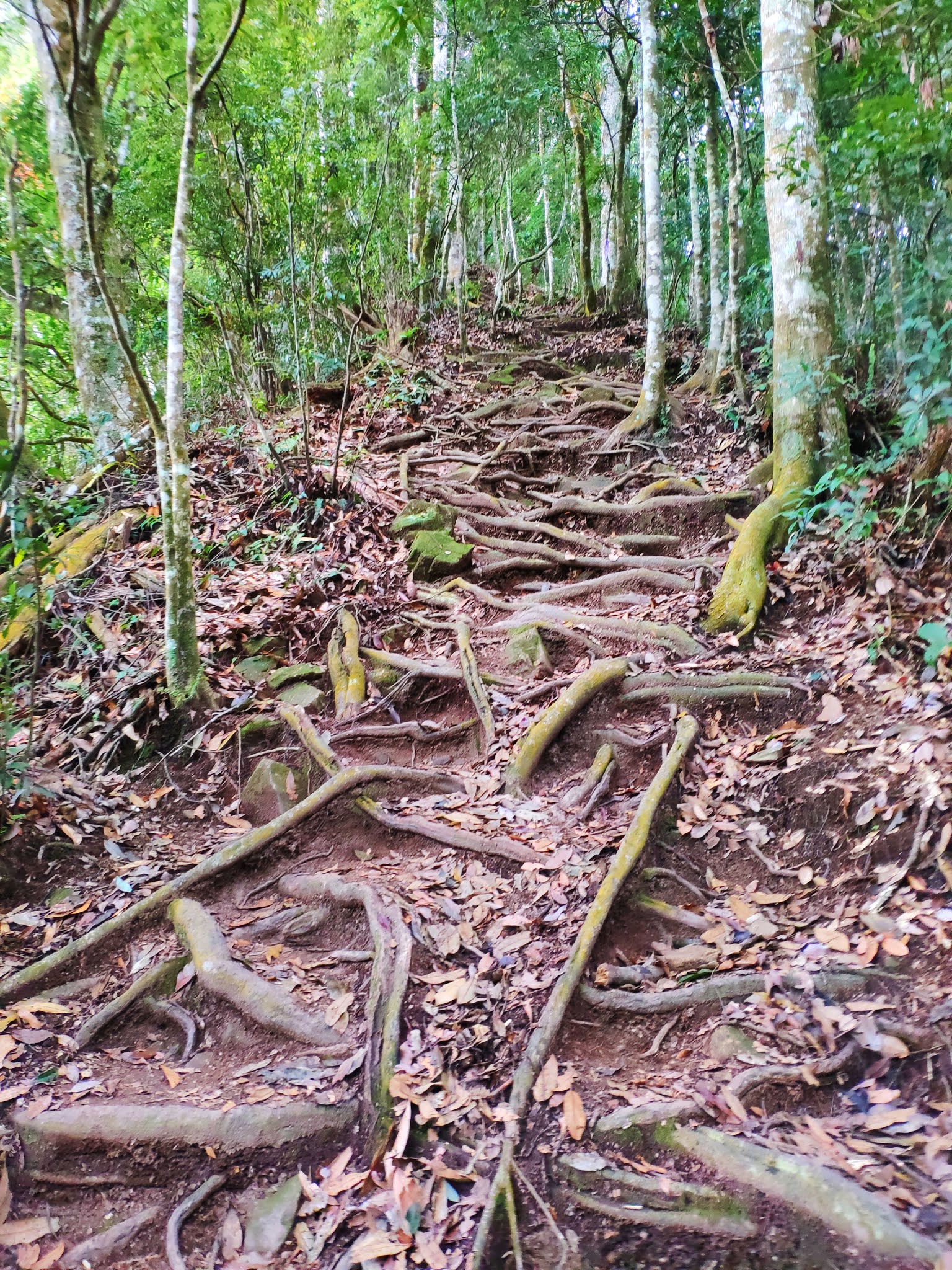 剛開始的步道微陡峭,但是慢慢行走應該不至於太困難。和虎山相比坡度較緩,部分的路段需要攀岩拉繩,建議大家一定要戴手套。這次爬到一半遇到雨神降臨,幸好有戴手套,才能避免雙手濕滑的窘境。去程走走停停,耗費約3小時,回程耗費約2小時,總共花了5個小時。是個值得大家細細品味山林的景點!