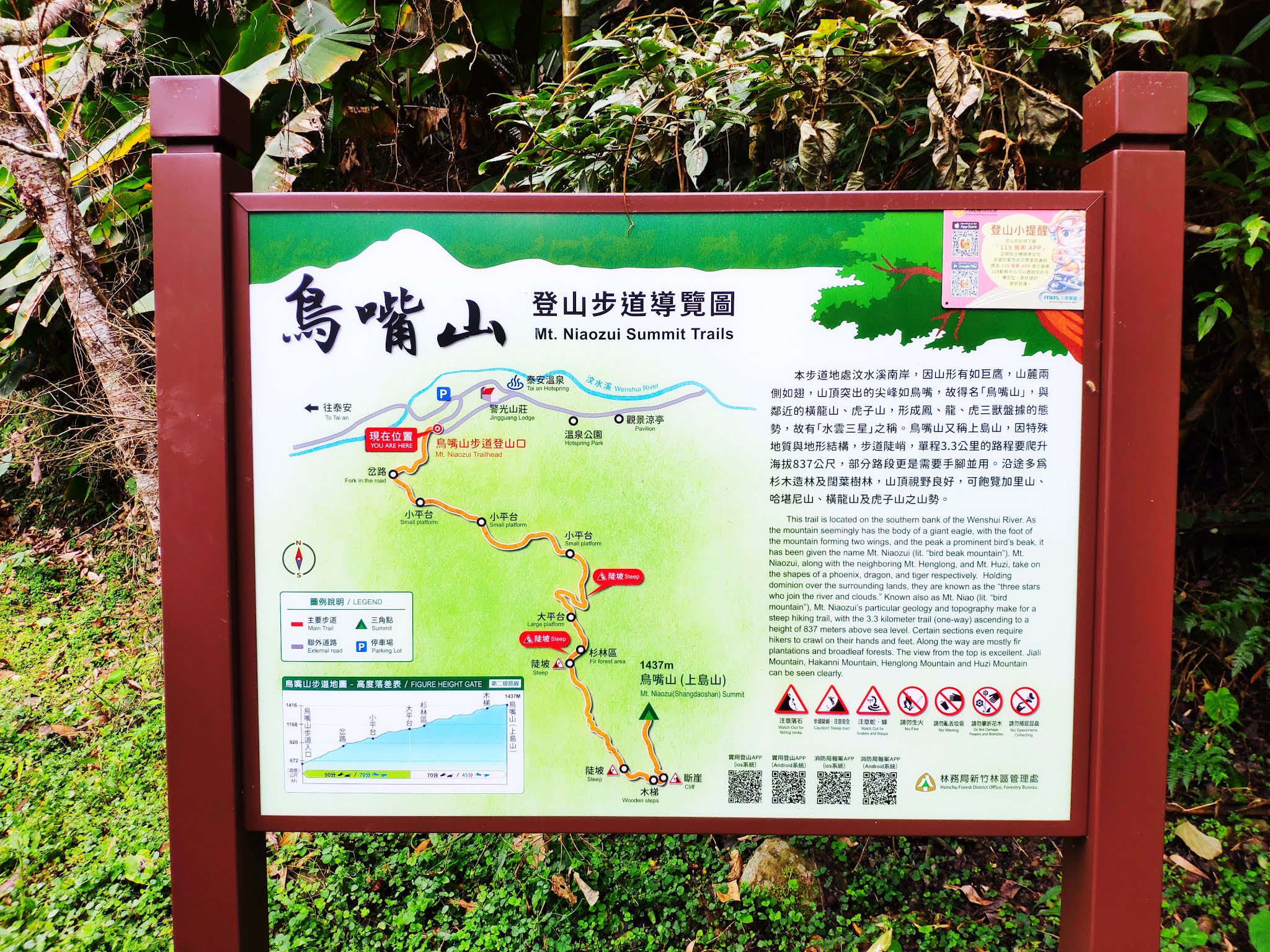 步道在泰安溫泉停車場往警光山莊的方向走,經過一段小斜坡之後,即可看到鳥嘴山的步道告示牌,算是滿隱密的。