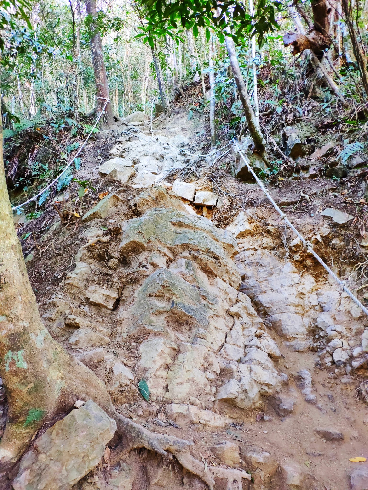 到達登山口後,剛開始一路陡上,讓人懷疑0.5公里的標示牌是不是放錯了。最後快到山頂時,有一段裸露岩壁路段,展望相當良好。
