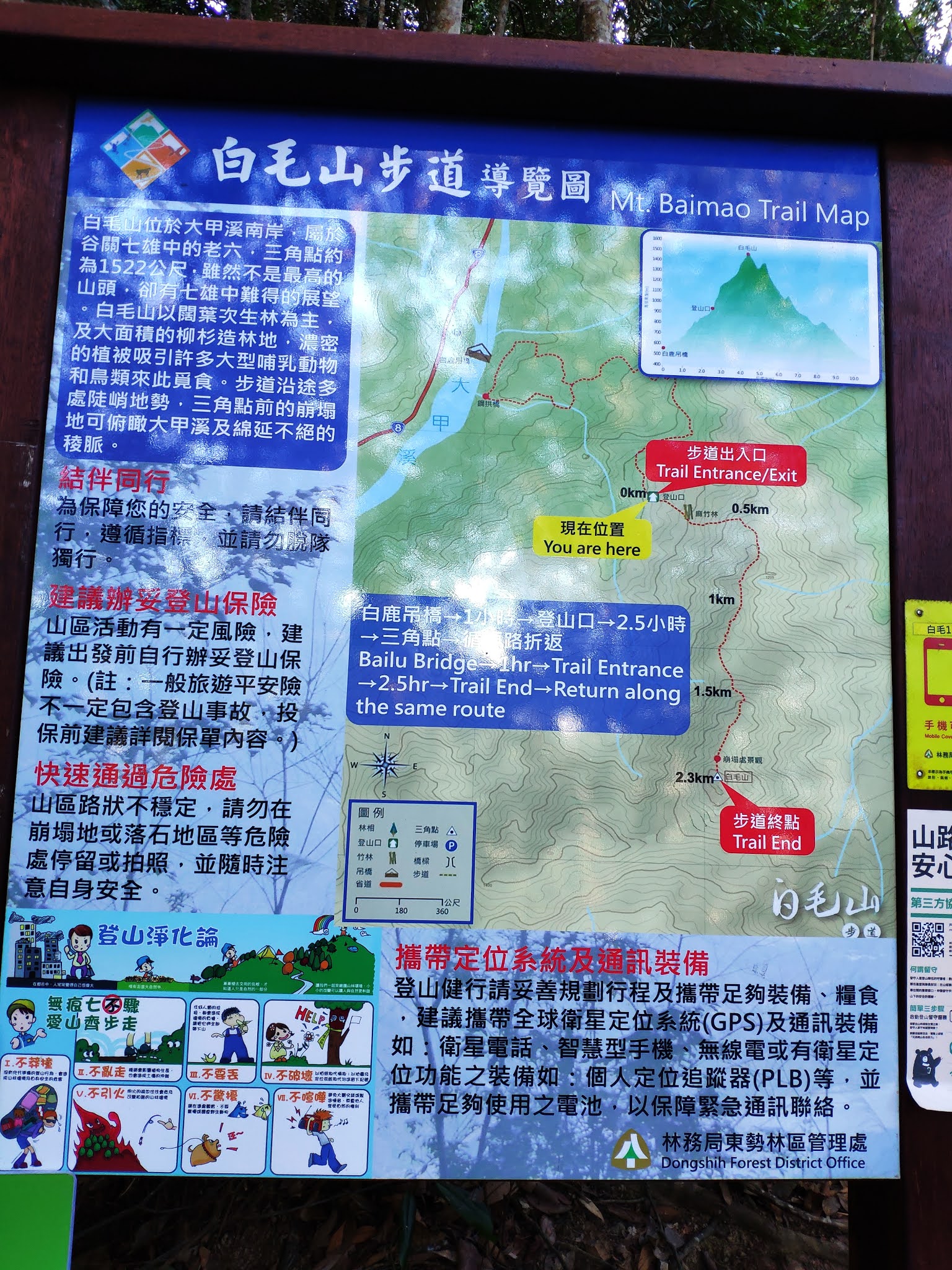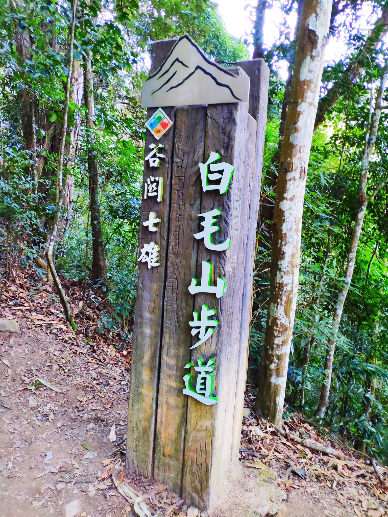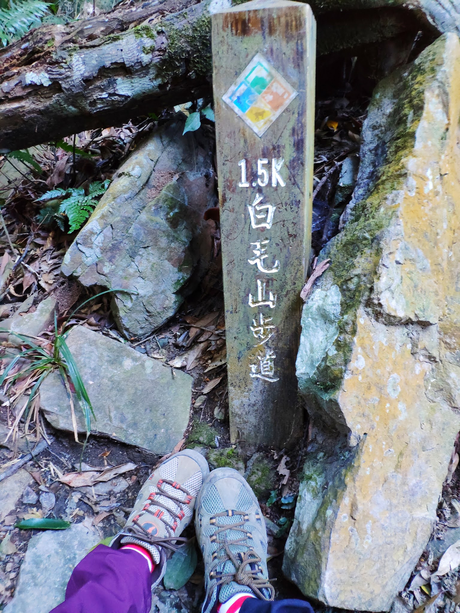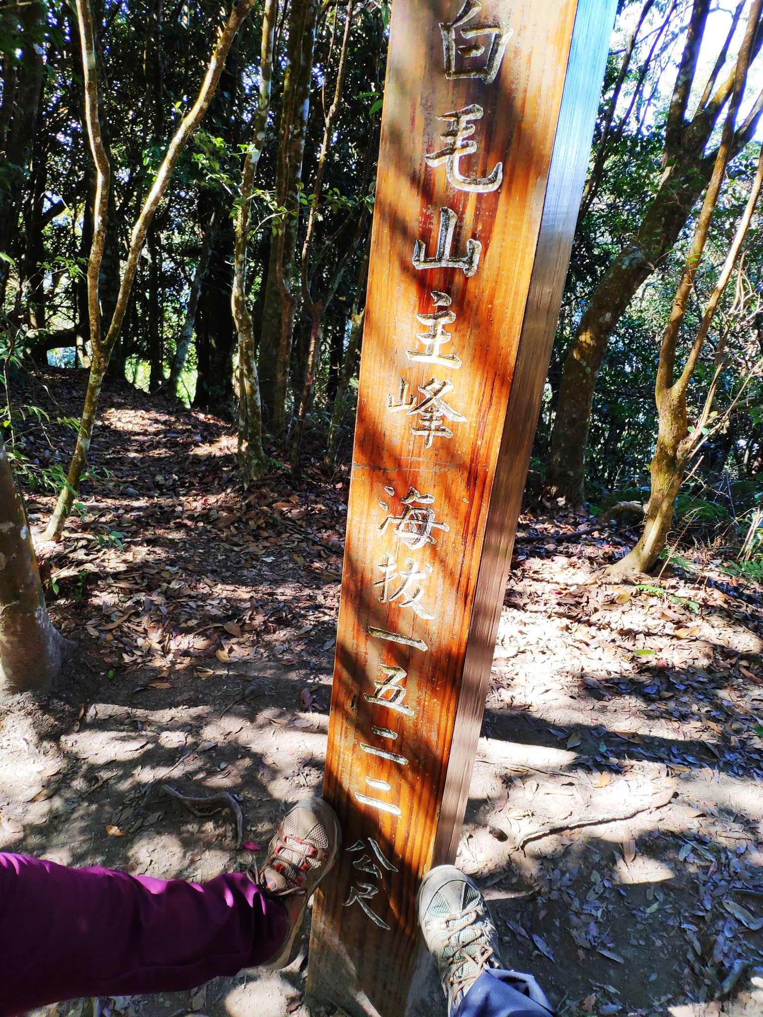 依照海拔排名,白毛山雖然是排行第六,但是抵達山頂卻不是件容易的事。從白鹿吊橋停車場到登山口必須先走2.7公里,爬升400公尺,抵達登山口後,再攀登2.3公里,爬升700公尺。計算下來,來回一共10公里,爬升1100公尺,耗時5.5小時左右。