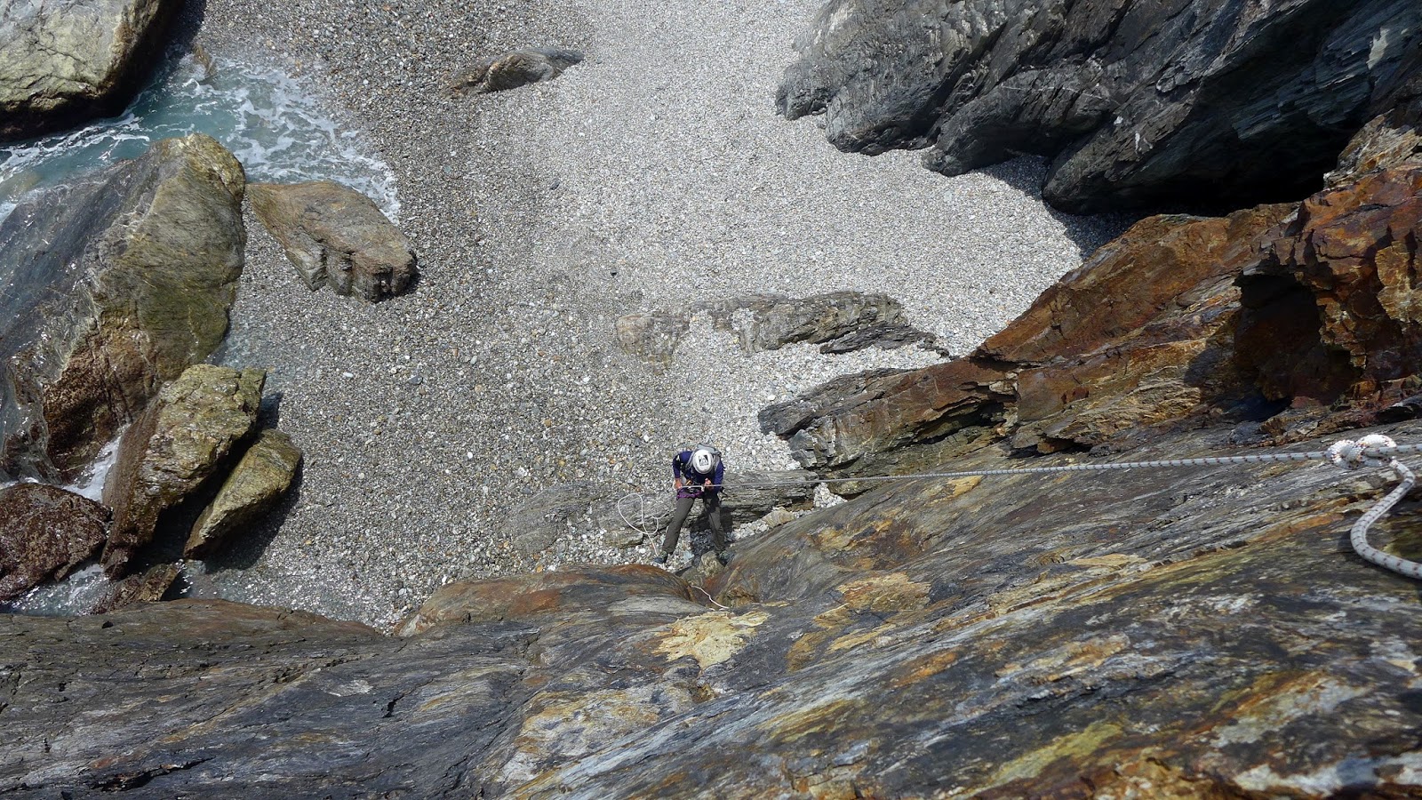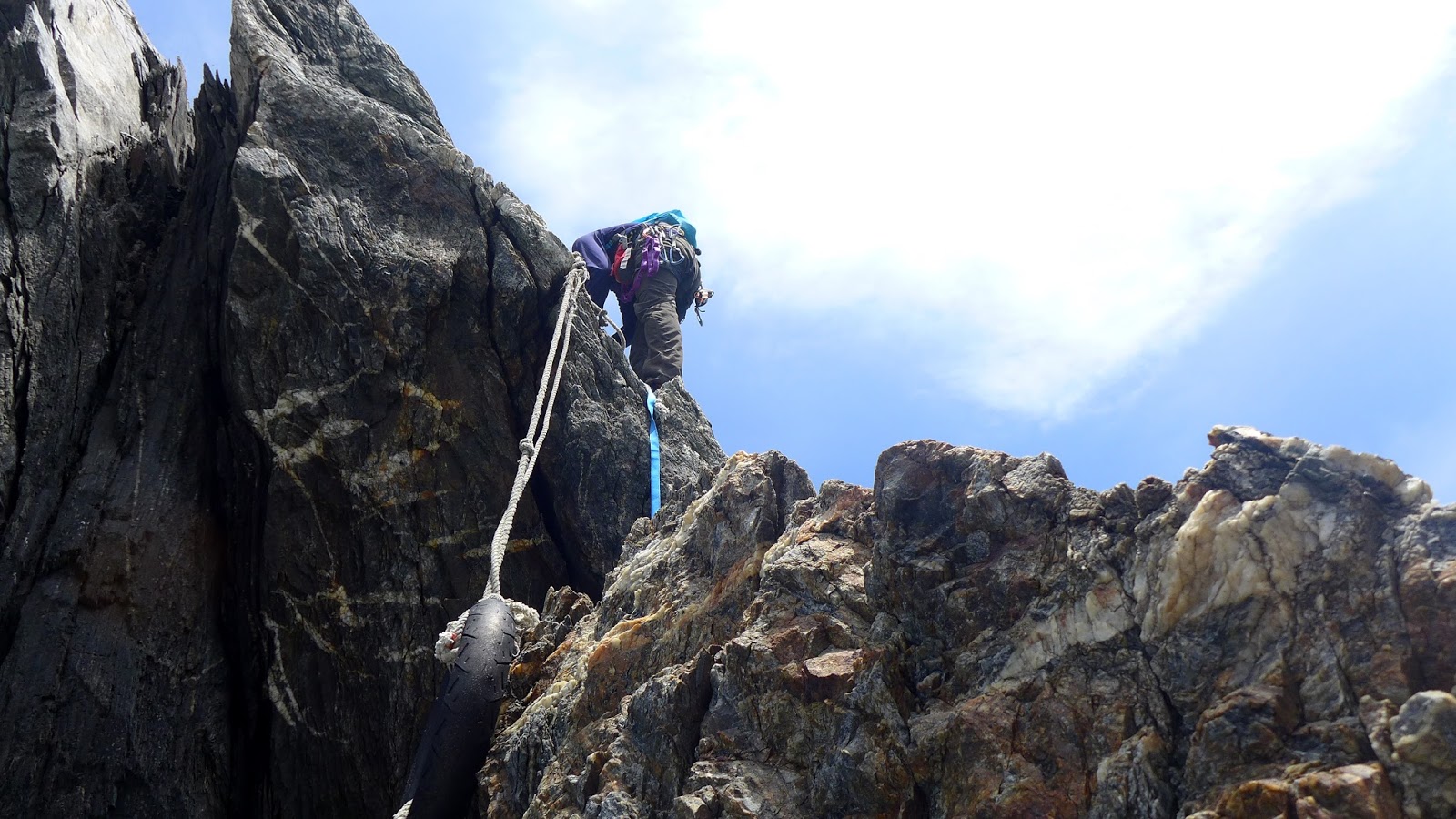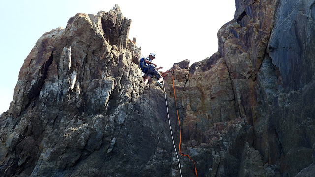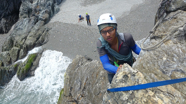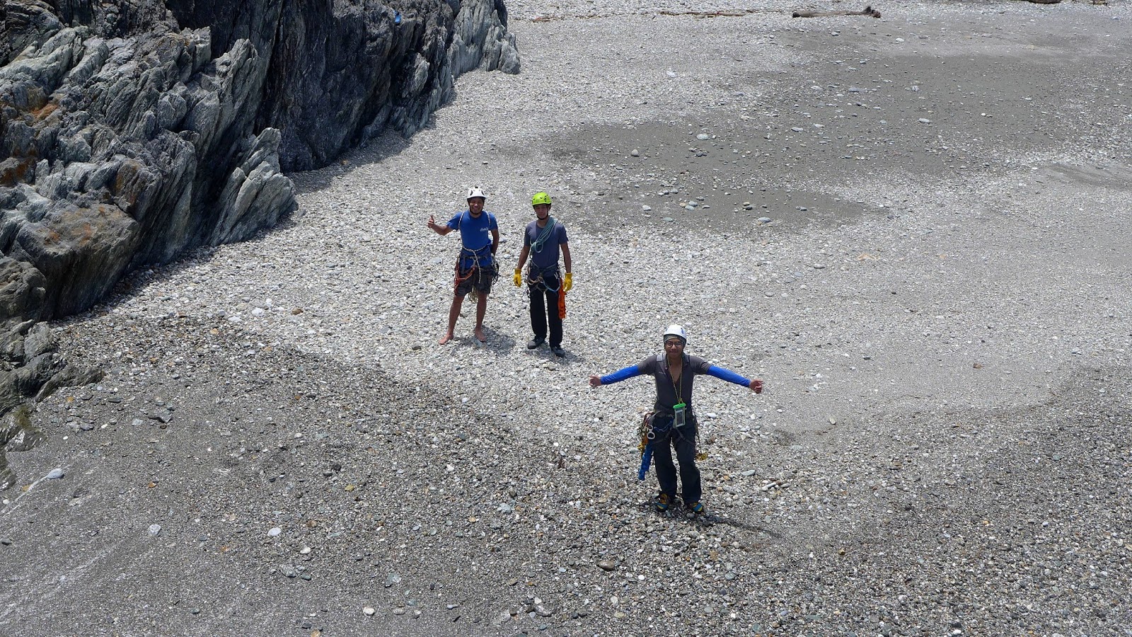 還是垂降好了,留繩避免下午漲潮腰繞路無法走,上攀撤退用