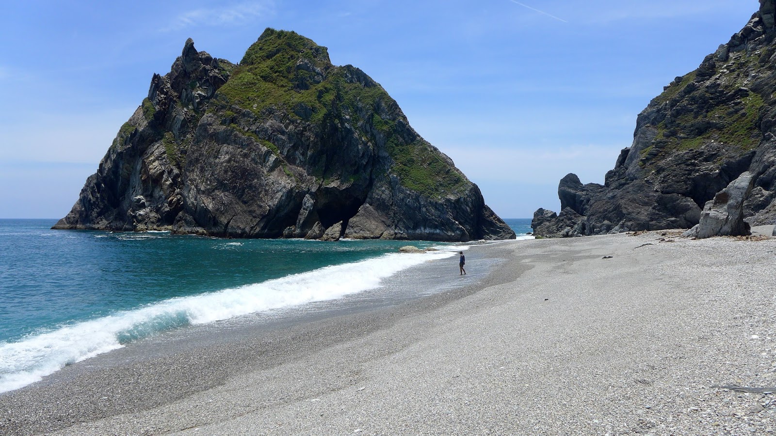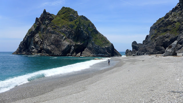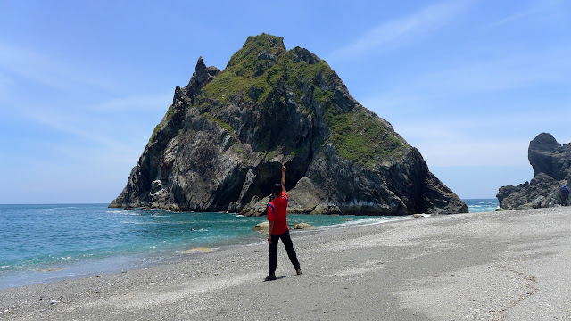 下到沙灘,真正貼近烏岩角了,上攀前先去海蝕洞大休一會,太陽太強了,有點招架不住。