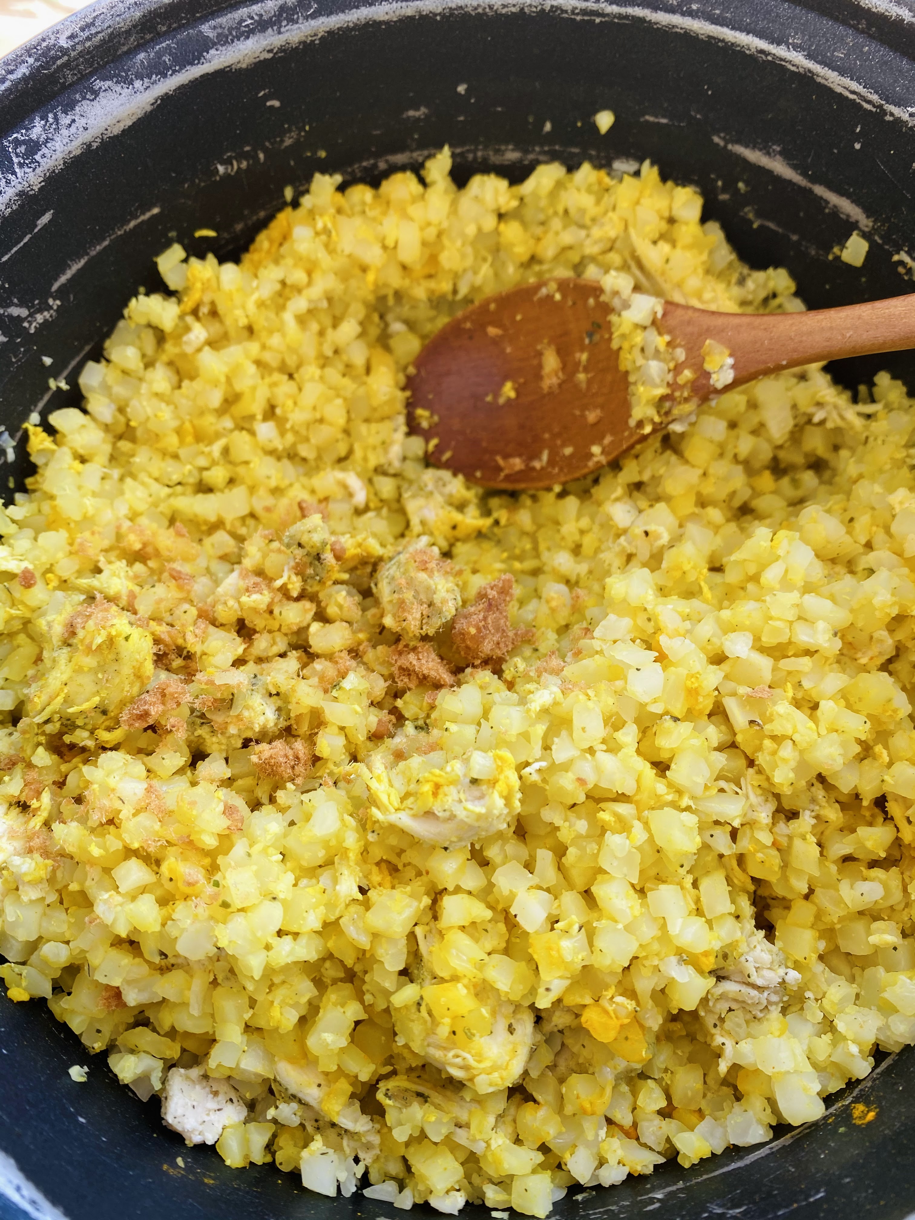 花椰菜米用無糖草飼奶油加AOP酥油加上薑黃粉炒,再拌入捏碎碎的羅勒舒肥雞胸肉