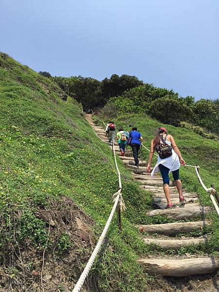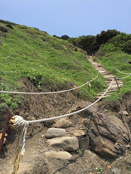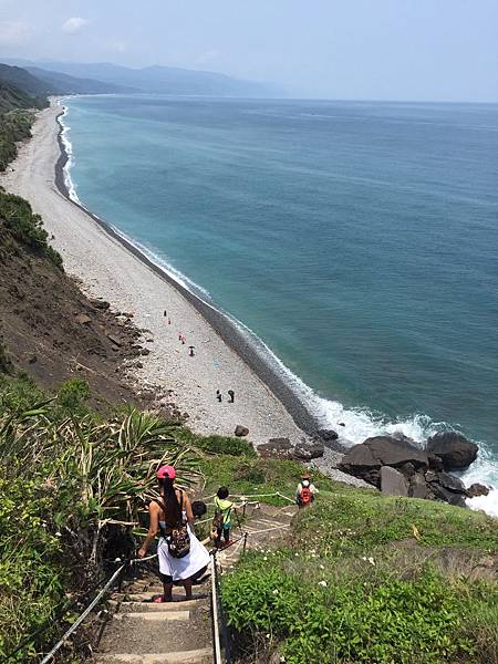 觀音鼻後就一路往下,這邊的樓梯滿陡的(所以可以想像走上很熱又很累),照片中右下角有兩個大石頭,是不是很像烏龜要游進海中? 雖然這邊一直沿著海岸線走,但離海岸線還是有點距離,高度也有點落差,難以想像浪有多大,可以把健行的遊客捲入海中呢?