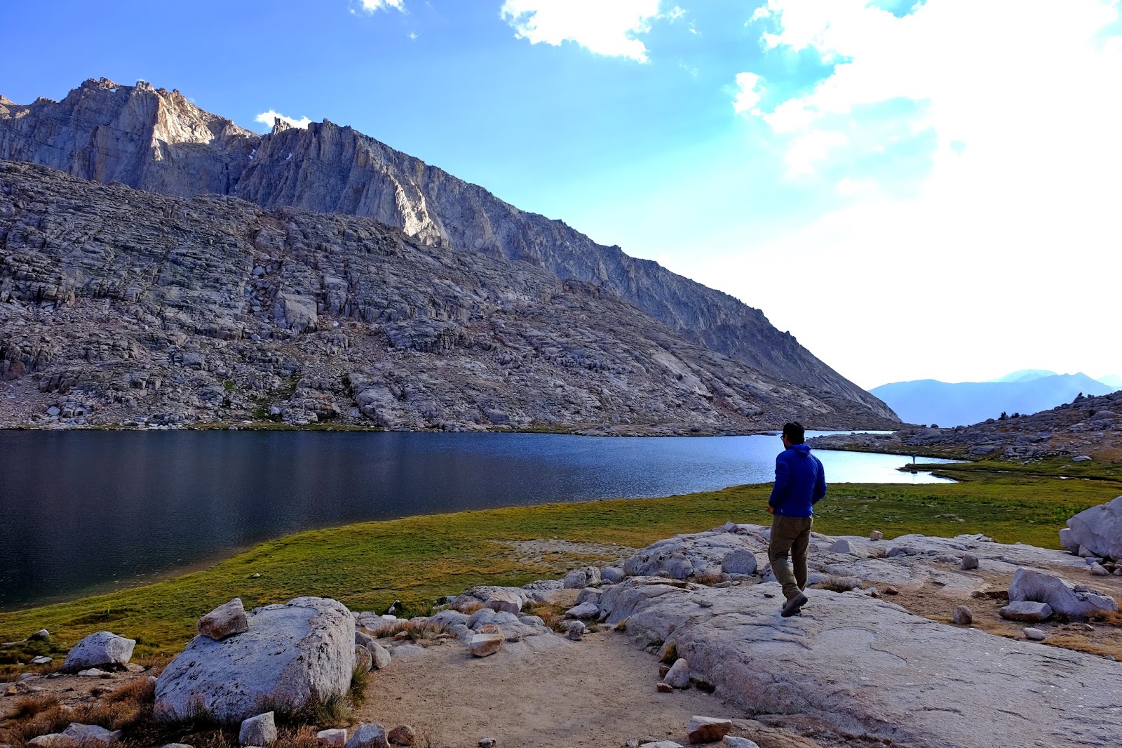 狹長的湖岸有近三公里長,在湖的南邊有一座半島將進化湖一分為二,僅留一道細長的通道,四周都是巍然聳立的山峰,極高的落差有一種山壁就要塌下來的錯覺。被山谷圍繞的湖面,光影變化之快速和豐富,可說是整段JMT之最。
