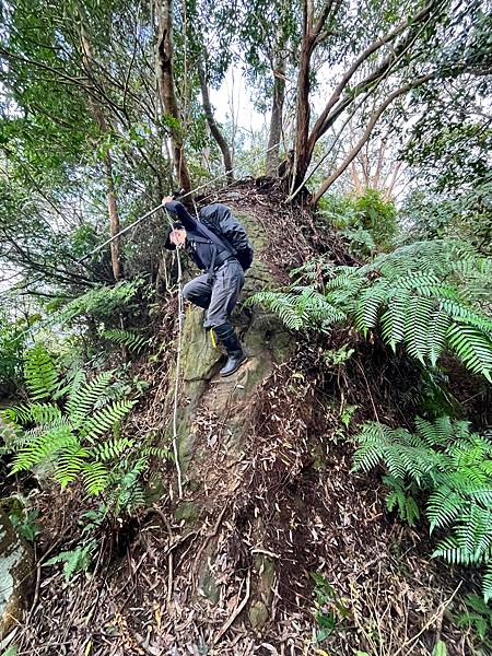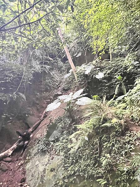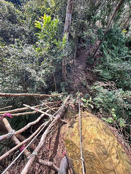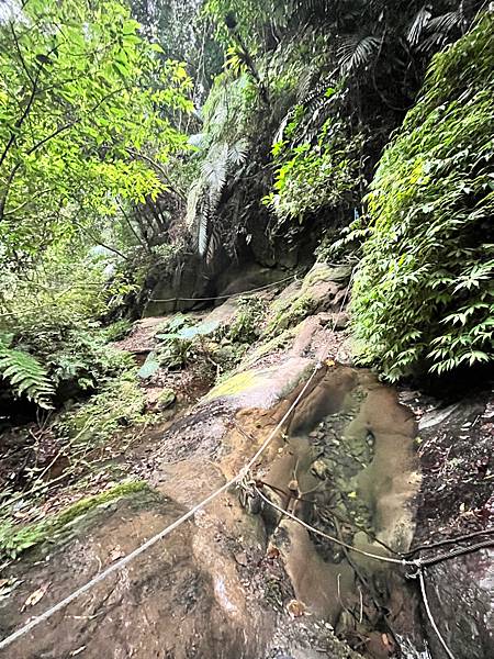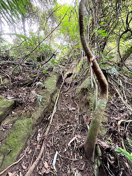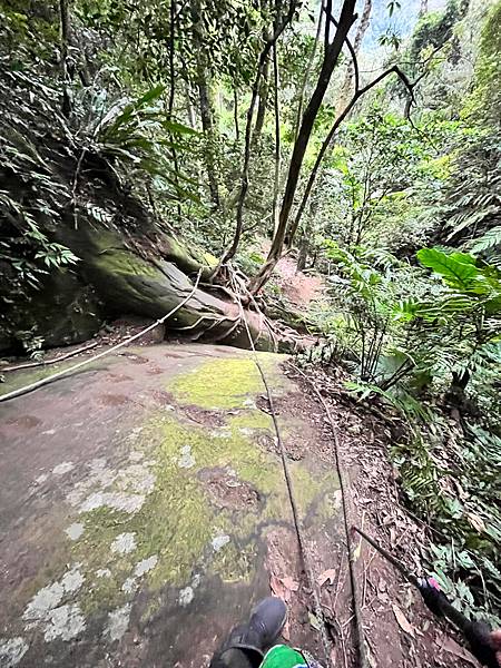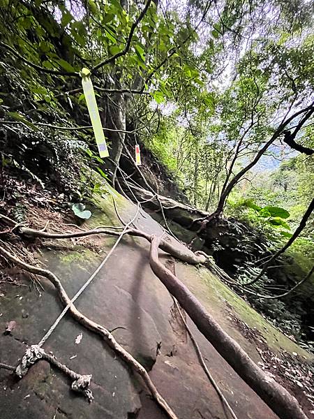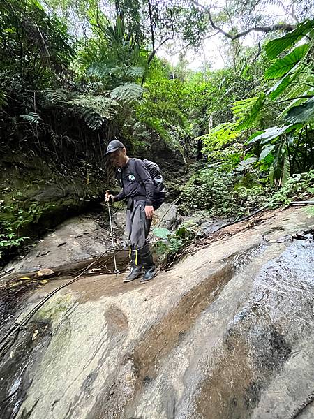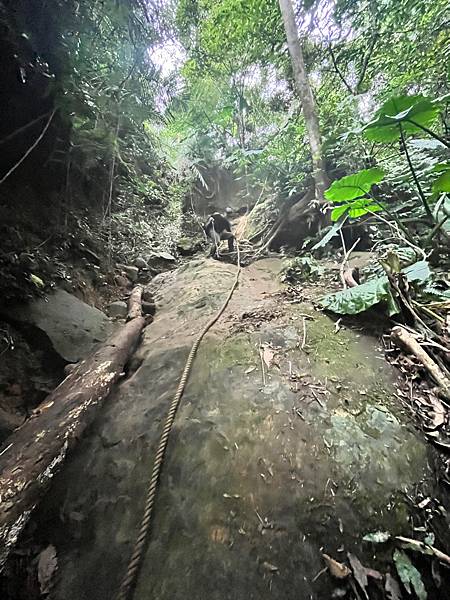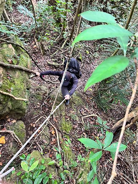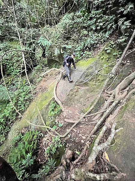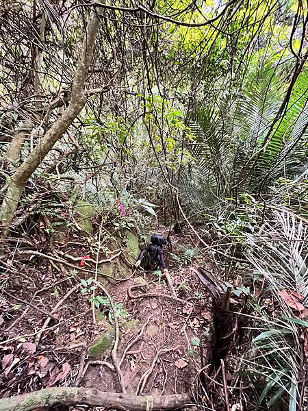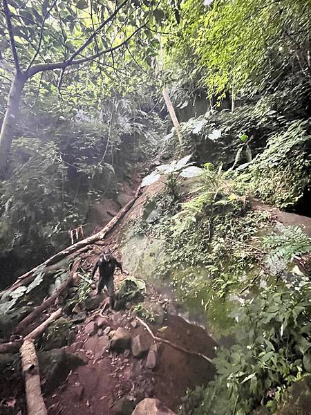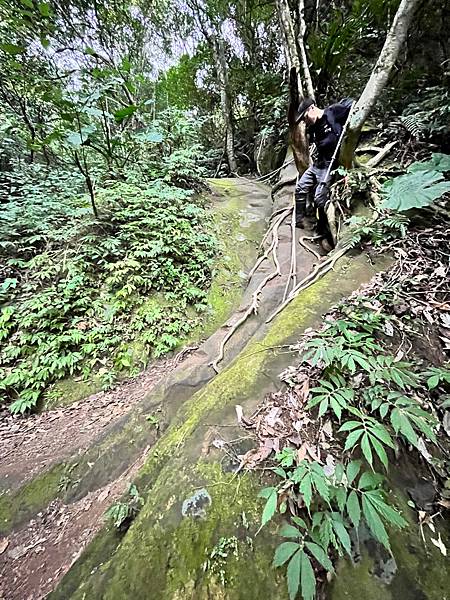 石牛山後往溪溝路線下山,路徑都是濕滑的土壤,有前輩們架設的輔助設施,但前段也因地形落差較大非常的有趣,好像溯溪抱石一樣