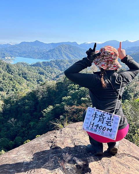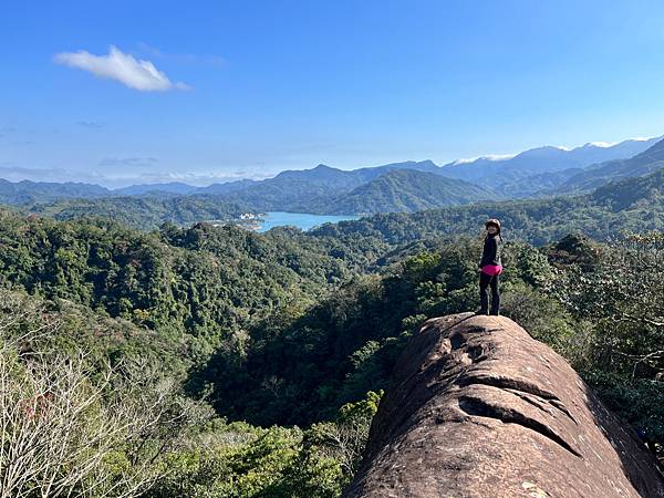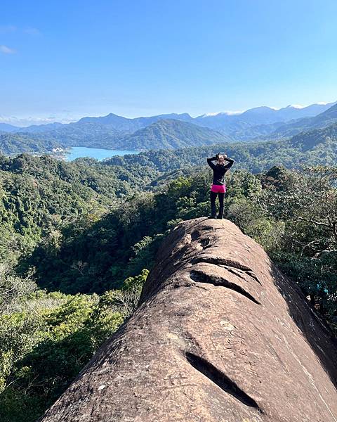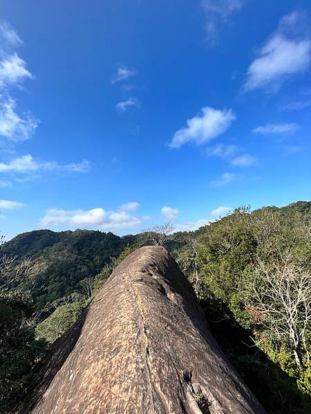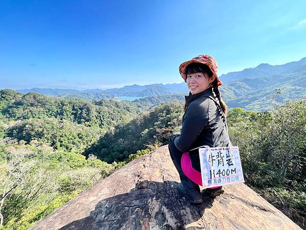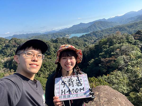 牛背岩,此路線最有漂釀的點!老天很賞臉,初次到訪便可以眺望到石門水庫,美麗的景緻在藍天白雲陽光的搭配下像在不一樣的仙境;在這邊遇到另一隊大哥大姊來這裡煎牛排,我們也在這裡玩了一會兒才離開。爬上來後真的會驚呼連連,真的太美了,超推薦大家可以來走,不過爬上爬下岩塊時要注意不要踩滑,腳點縫並沒有到很深
