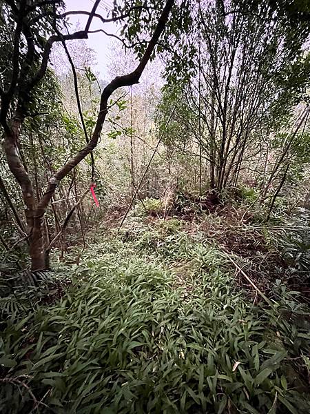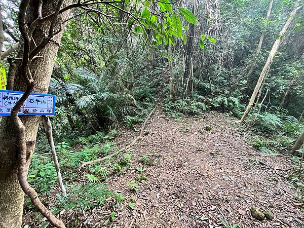 來到了石牛山頭前的鞍部,之後我們會往左邊的溪溝線下山繞一個O,不走石福宮、不走稜線原路折返a點