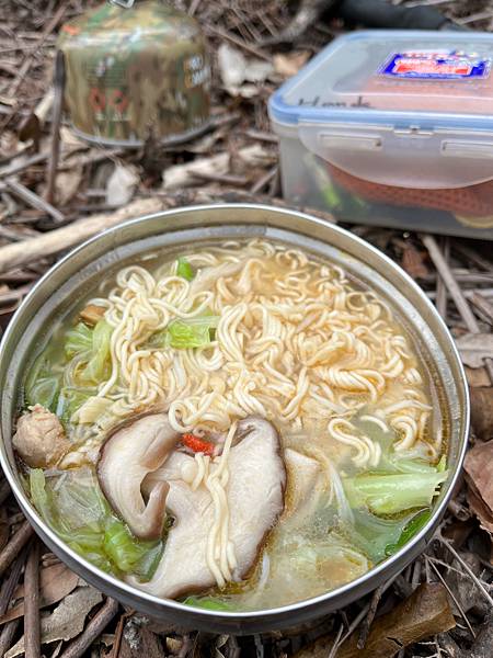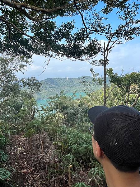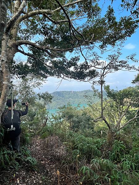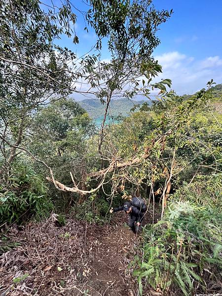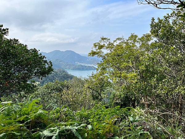 午餐時間差不多快到了,上到460M稜線山頭後開始午餐,不過此處的石門水庫剛好被植物擋住,可以再往前下到梯子後用午餐,有水庫展望且如果是在夏天來走的話更適合遮陰