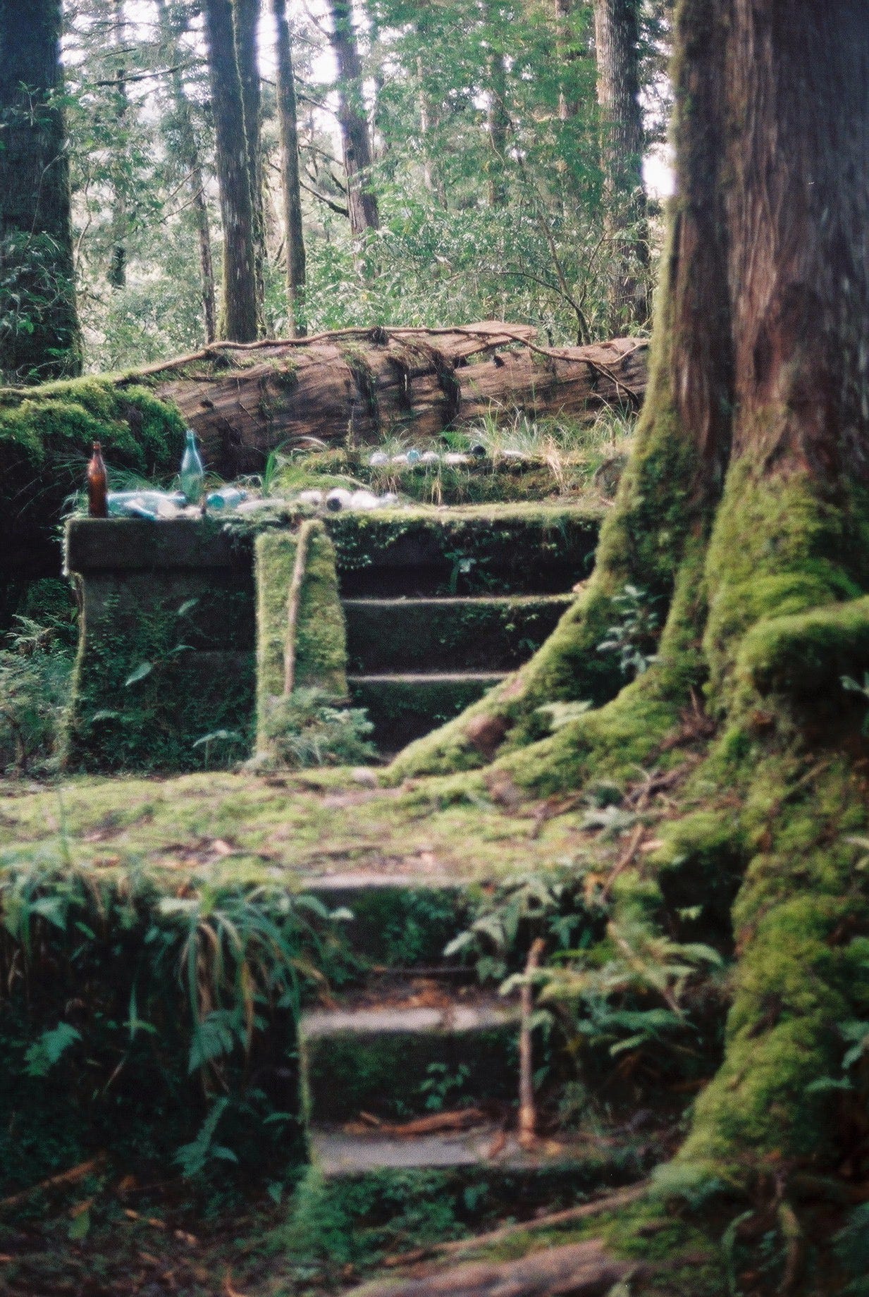 在真正進到加羅神社之前,路徑上橫著一段巨大倒木,其下矮矮的空間如同時光隧道,鑽過他,便會忽然掉入歷史當中。我們以瓶蓋斟了一小杯酒敬曾在這裡生活的人們,並告知今日我們會在此借宿打擾一晚。
