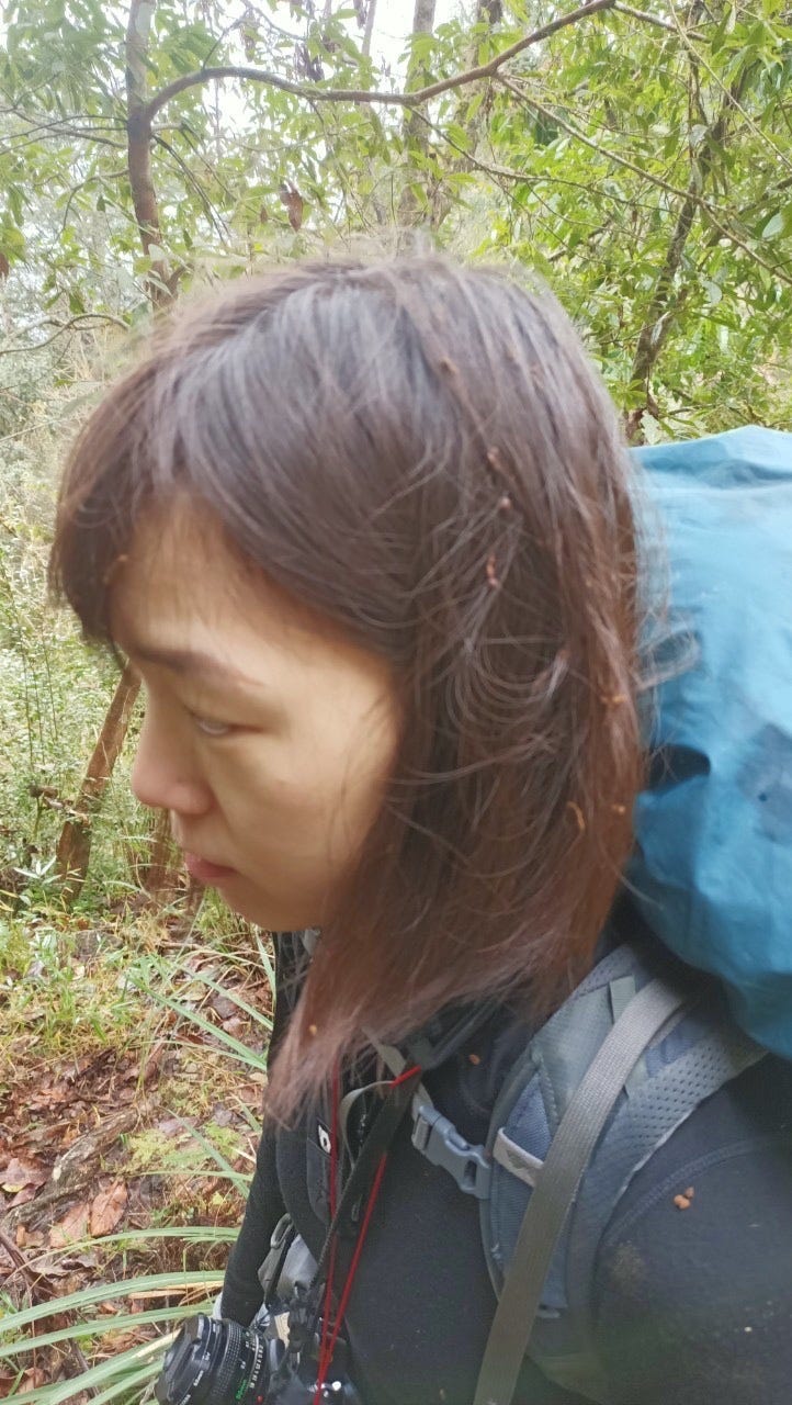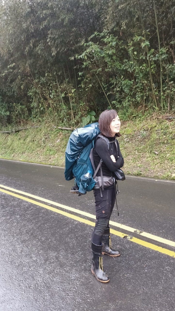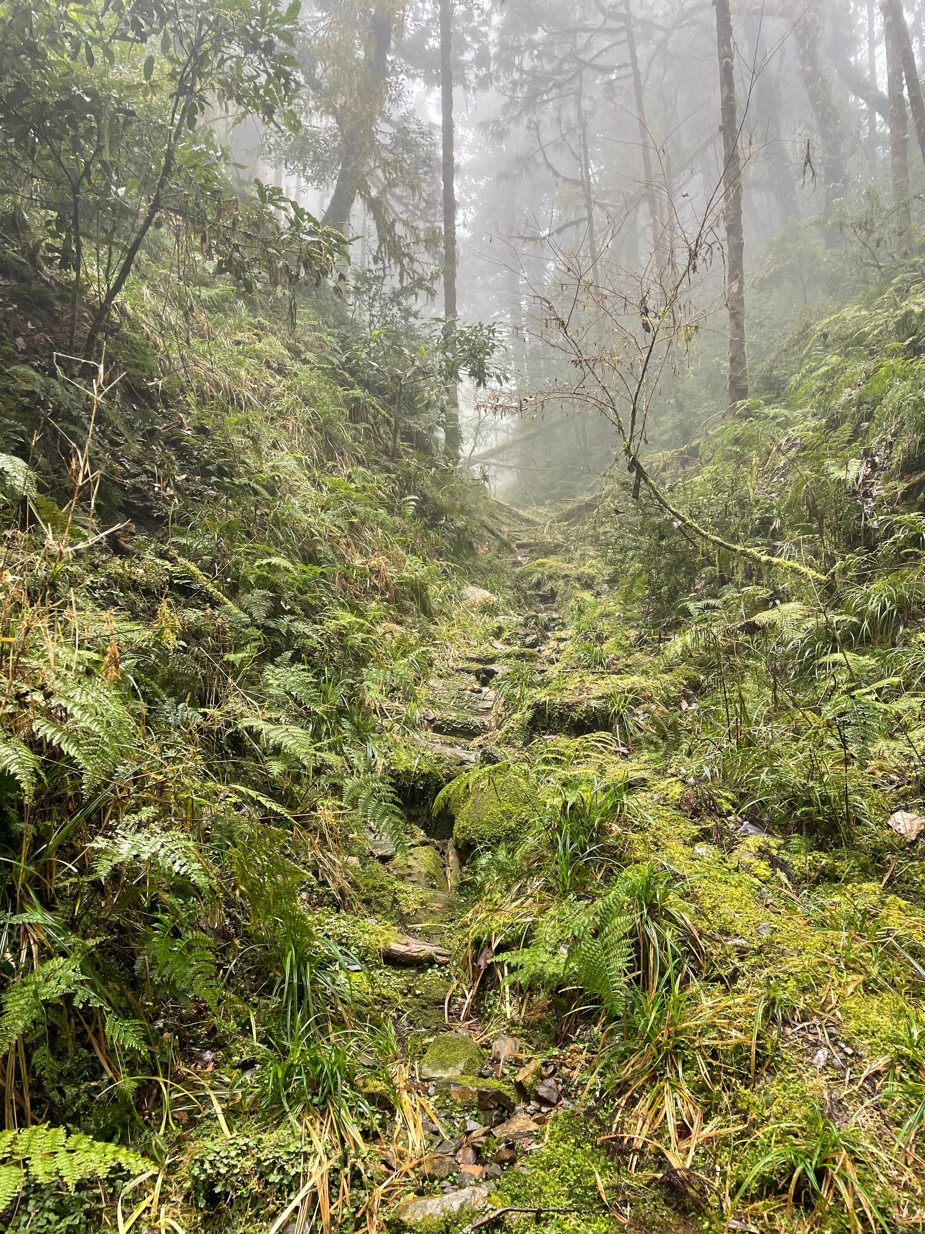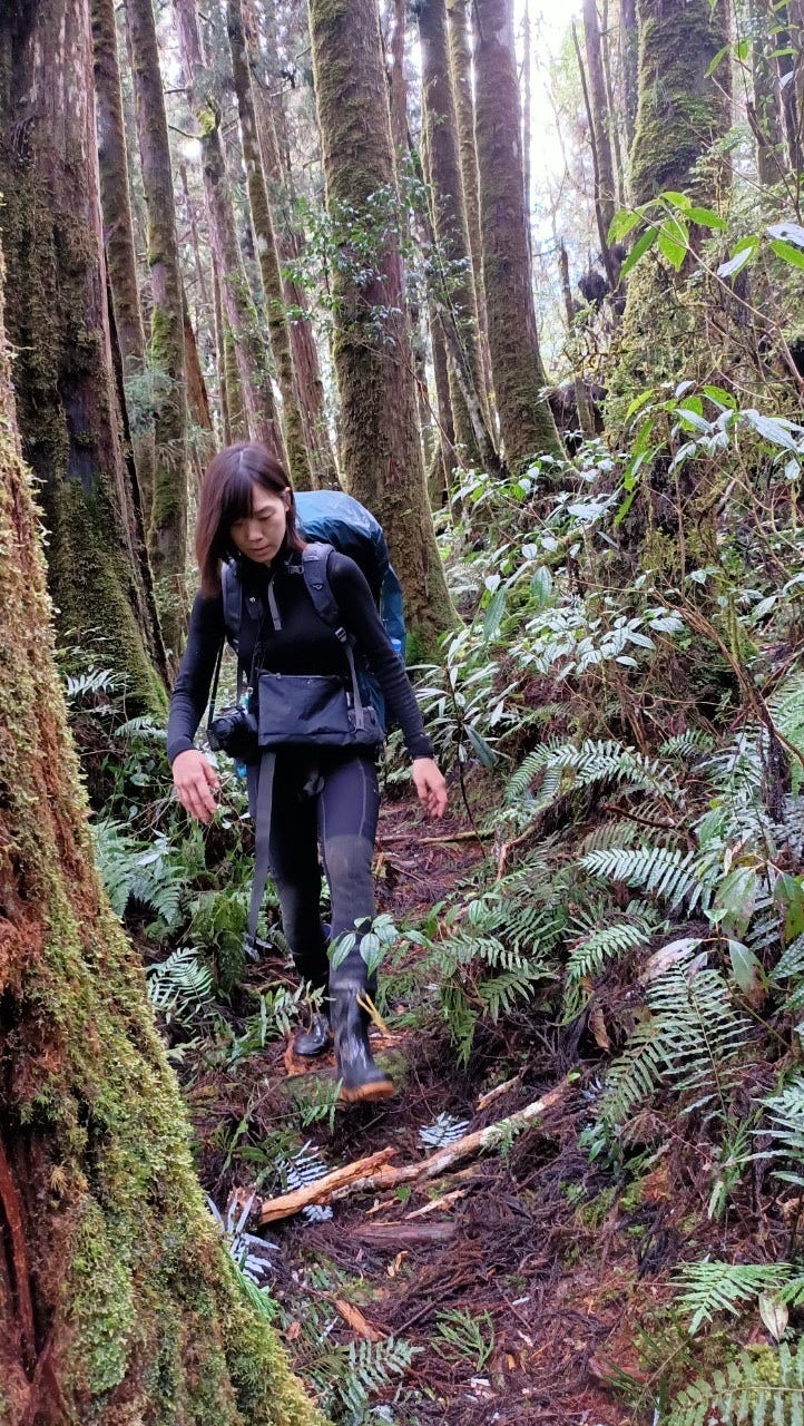 不太熟悉穿雨鞋下坡的我煞車煞到心累,最後大拇趾和小趾都又熱又痛,眼看雨勢越來越大,陷在樹叢裡感覺天色又暗得特別快,便一路心想:到底是要到了沒啊⋯