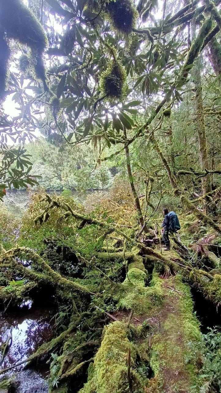 10:55 抵達給給池,相較於嘉蘭池還有一片可讓人踩著接近的水草,給給池畔的樹木更加茂密,且有許多倒木橫亙其間,樹幹上附著厚厚的松羅、蕨類和苔蘚,因此行走時便得更小心。