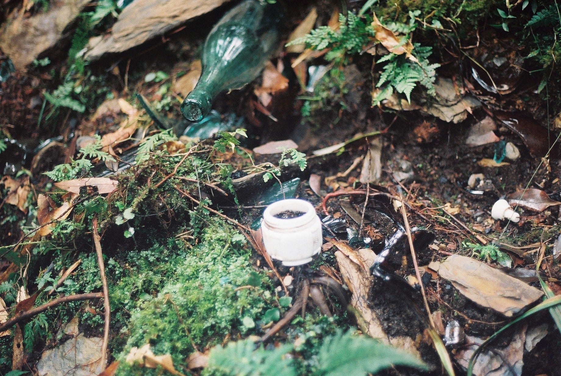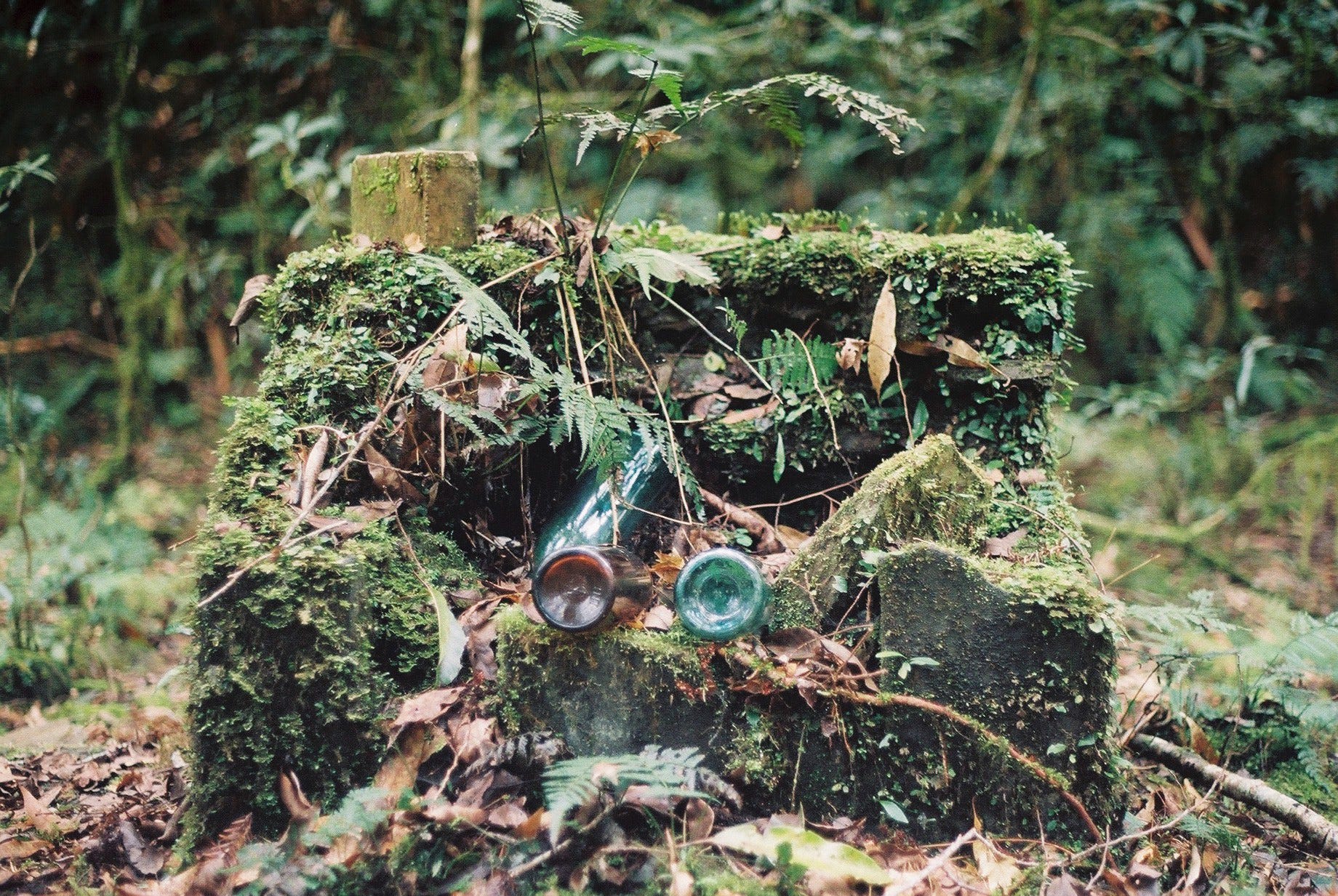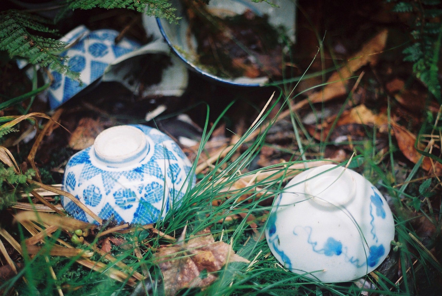 走下長階梯紮營後,便開始四處探索,我們從神社往下走了5層平台,每一層以石梯或者斜坡連接,除了瓷碗、玻璃瓶、鐵盆等器具,也可見到爐灶、地基、便座等,有些地方甚至可依稀看出當時的建築格局。