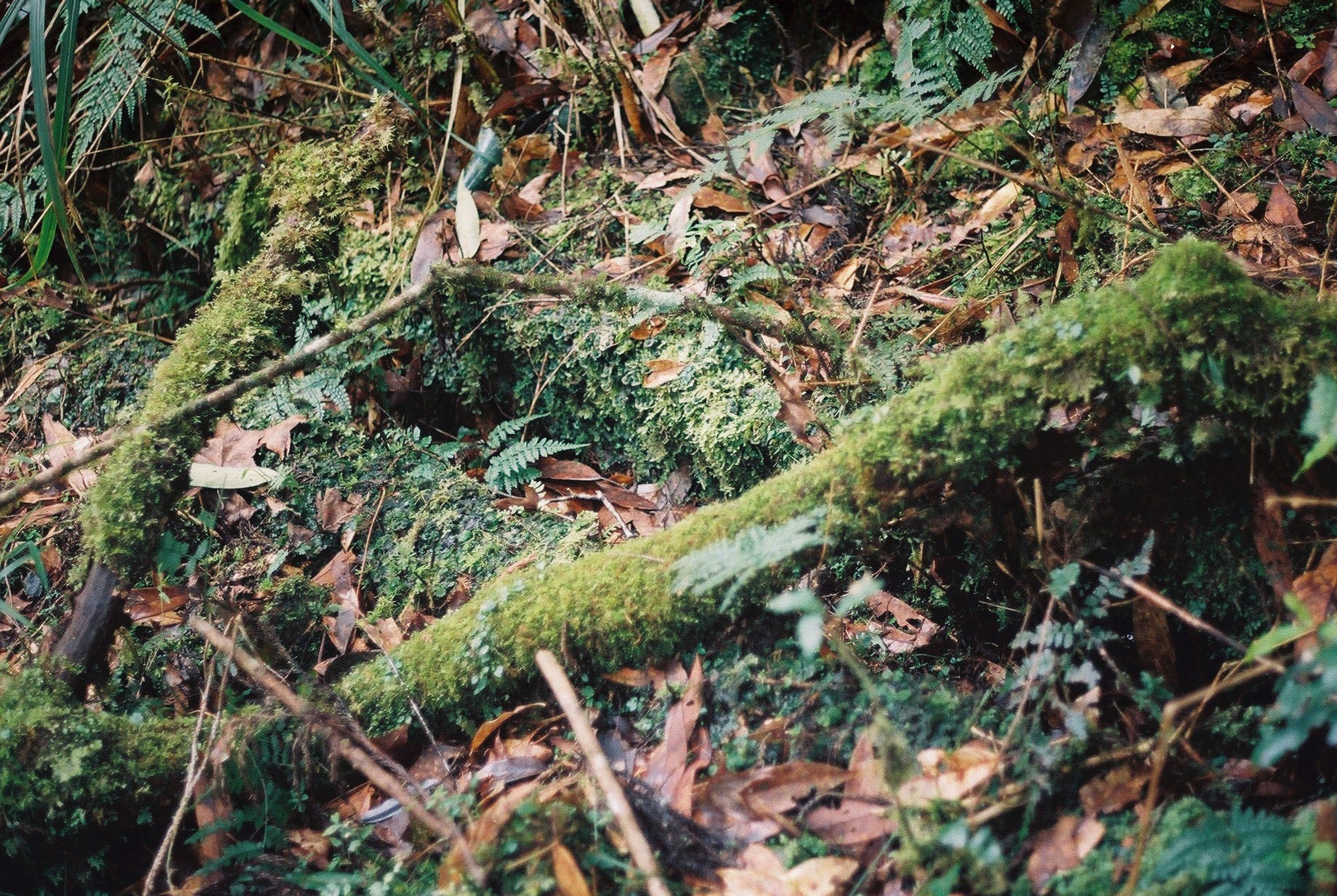 嘉蘭池、給給池支線的布條不多,但路跡大致清楚,路旁除了帶著人為痕跡的筆直樹林外,亦可見到姿態各異的巨木,潮濕的氣候使得大量的蕨類和苔蘚攀附於樹幹之上,環顧四周,像是闖入了一片魔法森林,總覺得會在轉角撞見小精靈;偶爾也會在路上見到被鋸掉一塊的樹木以及鋼索,帶我們窺探曾經昌盛的伐木年代。