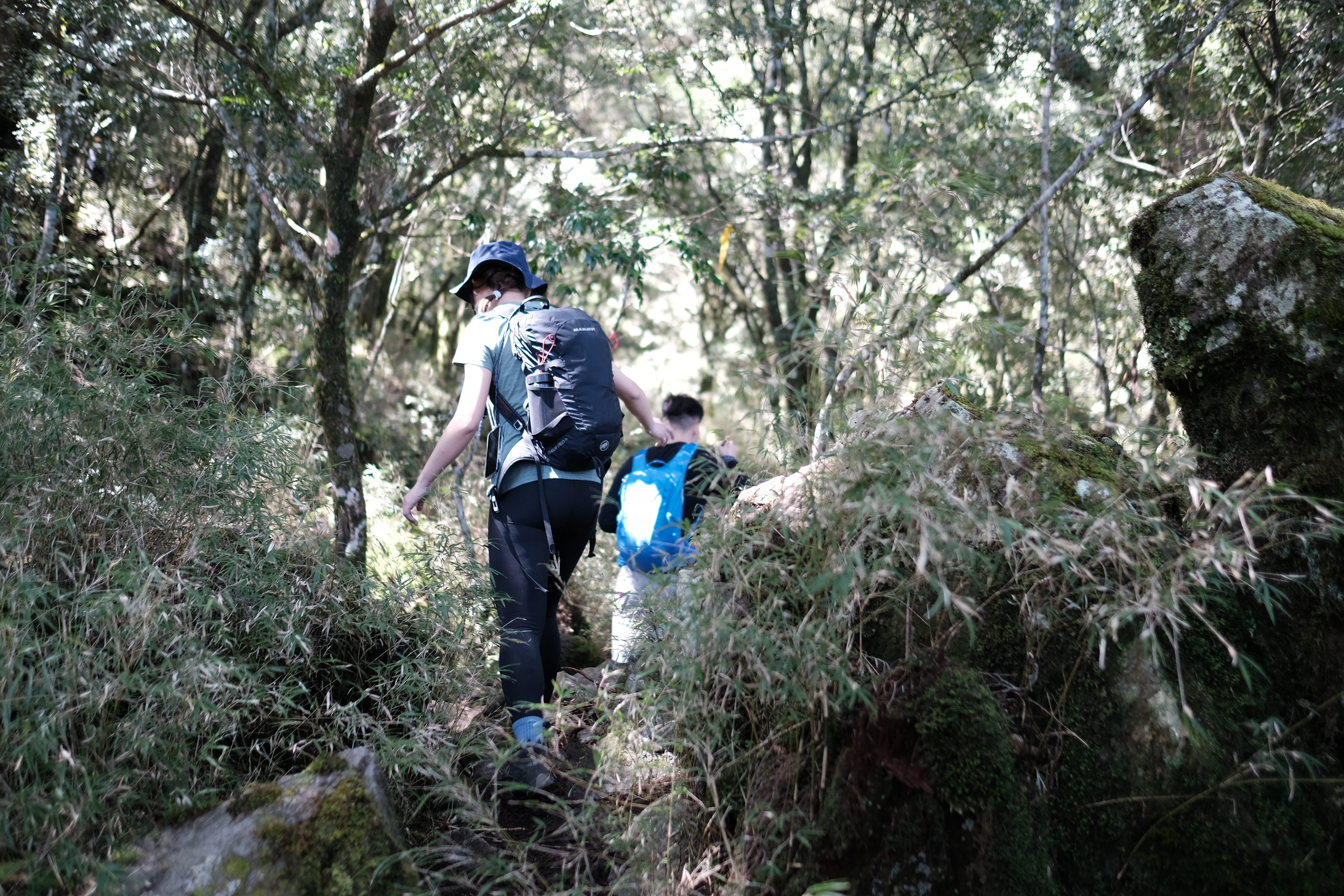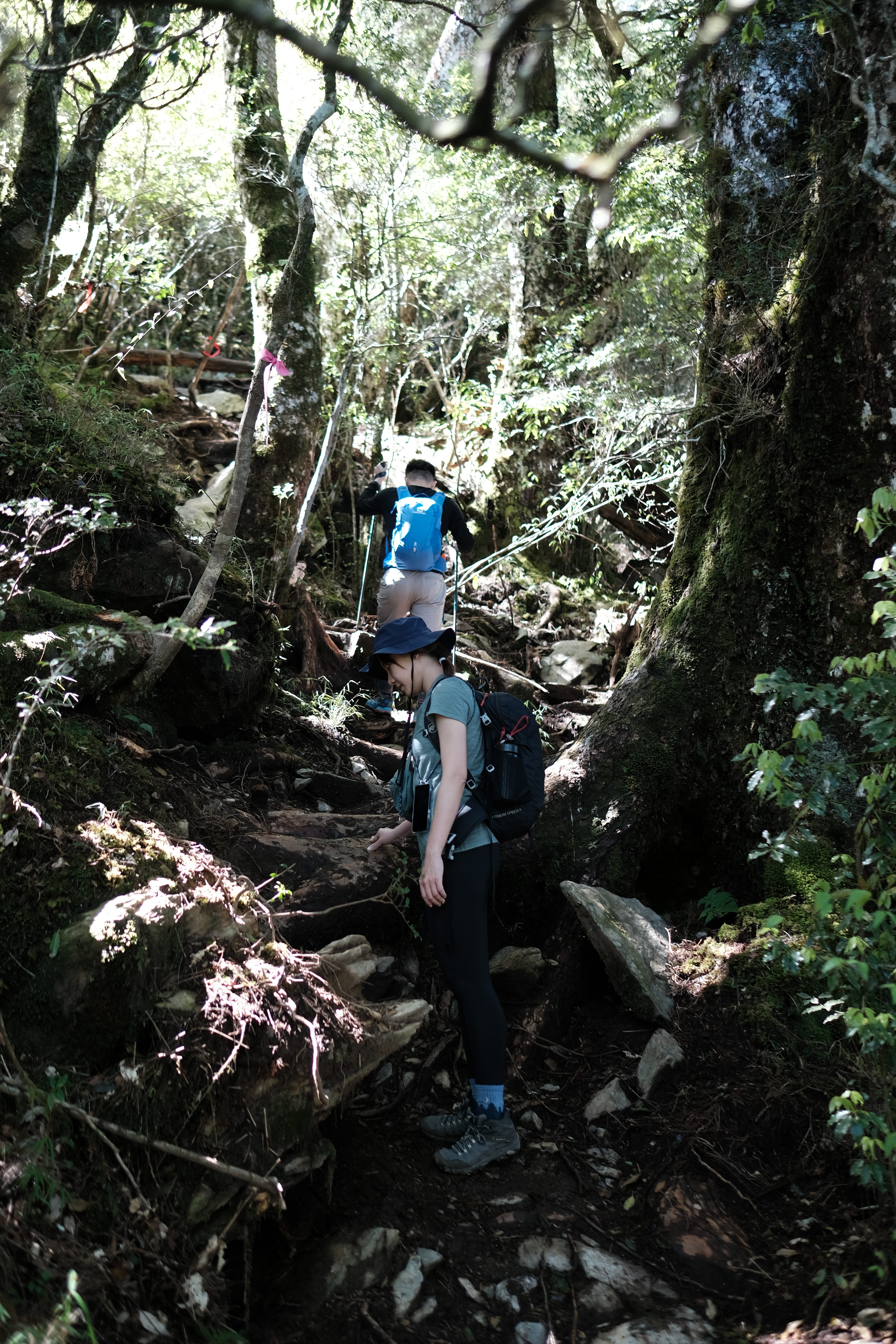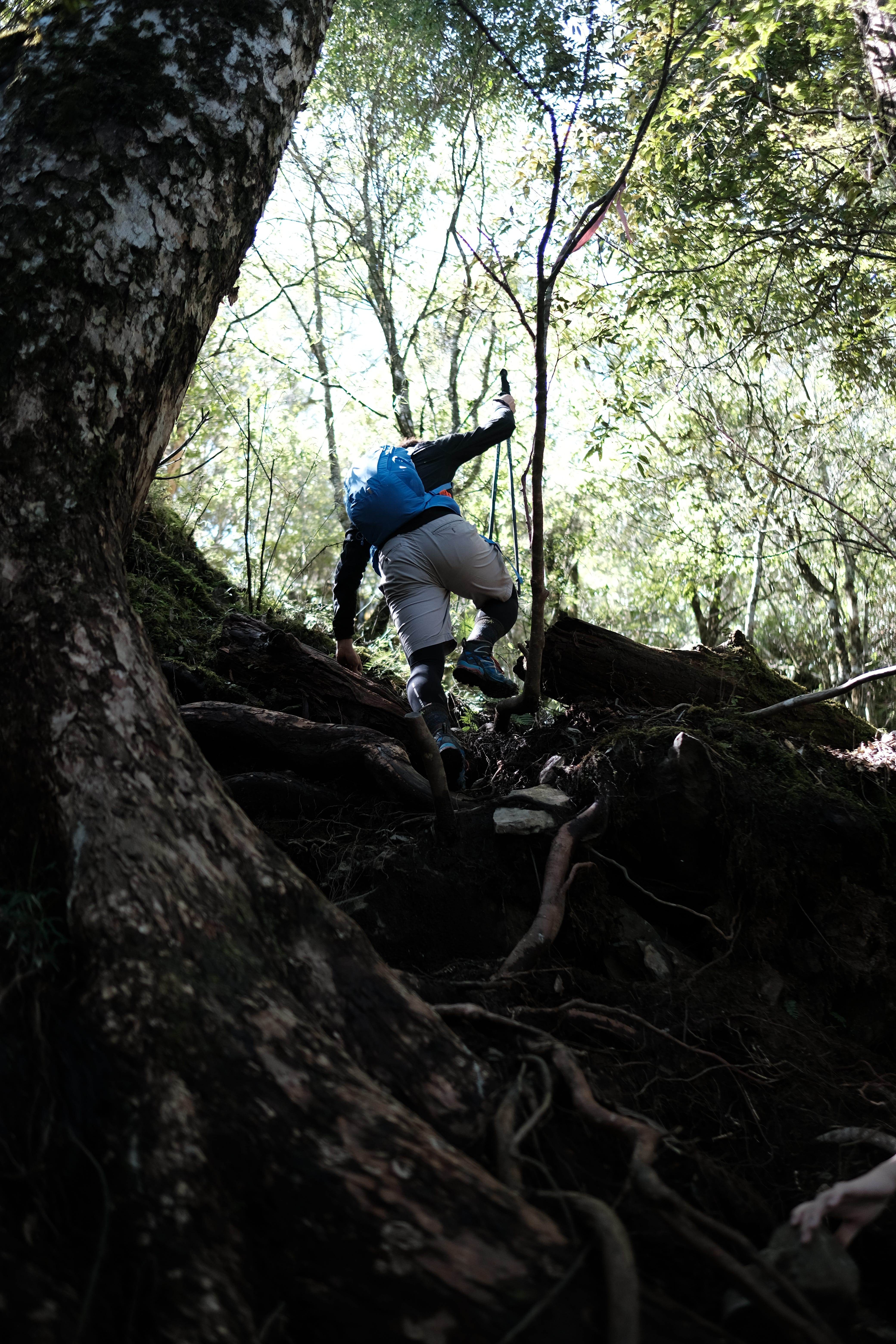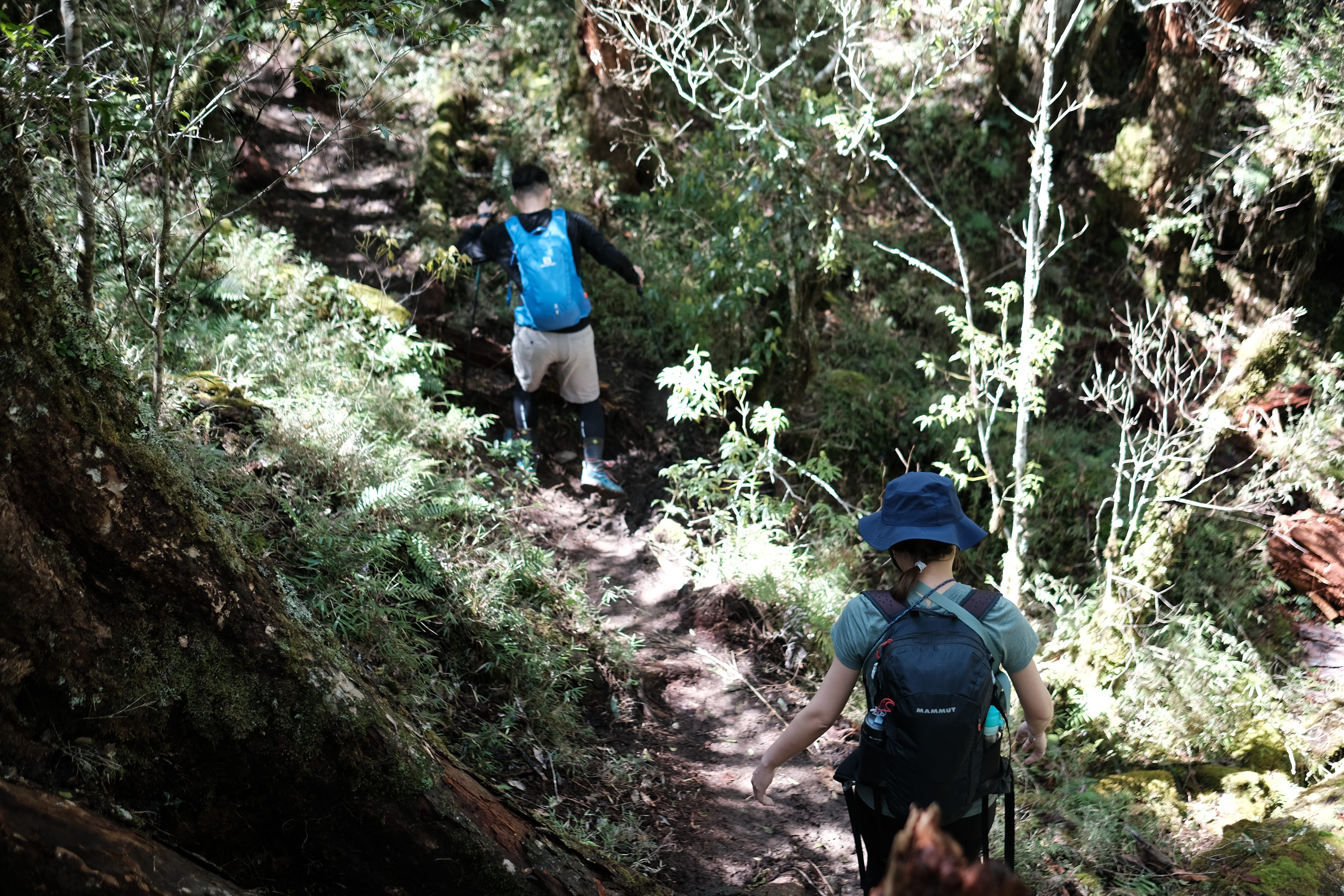 一開始像在中級山裡行走,主要是會沿著樹根爬上,路途中會看到越來越多大鐵杉,他們的枝幹包覆著頭抬的天空,超級美麗。