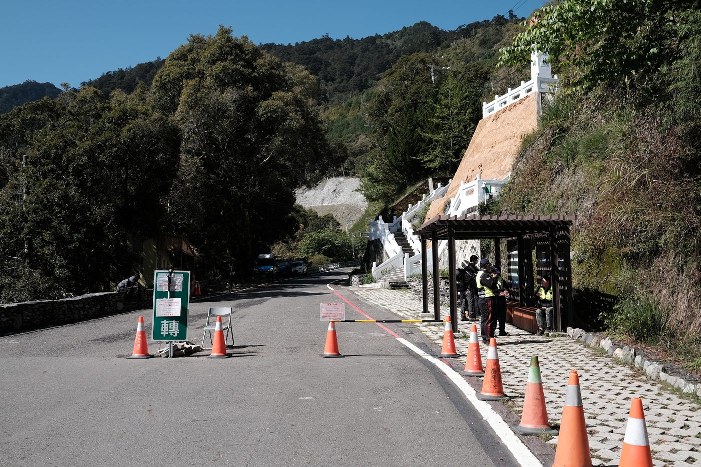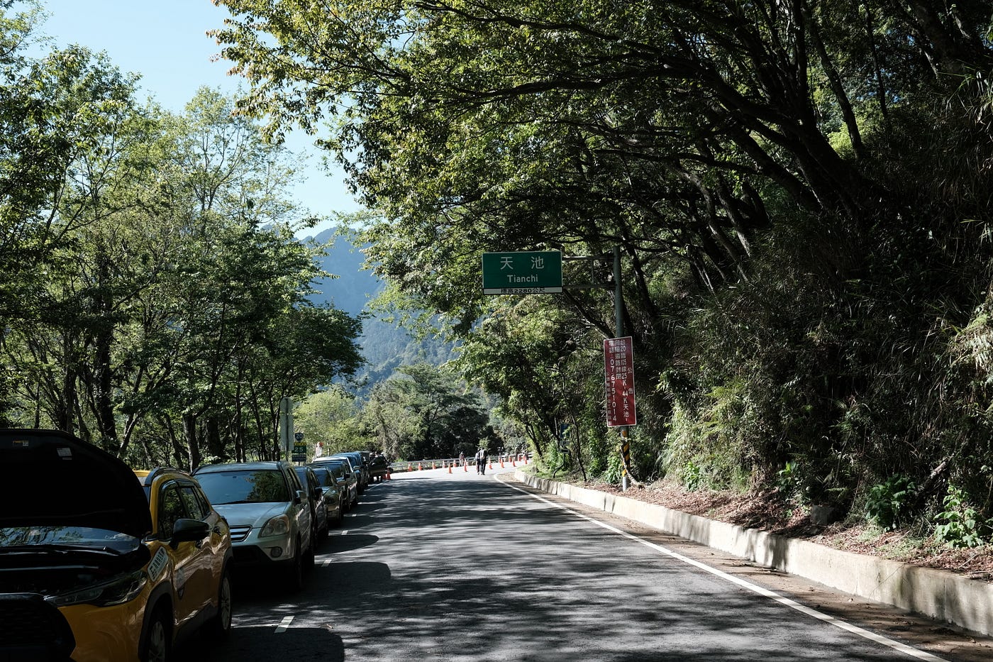 天池路段旁滿滿的車,若要迴轉請開至管制口迴轉