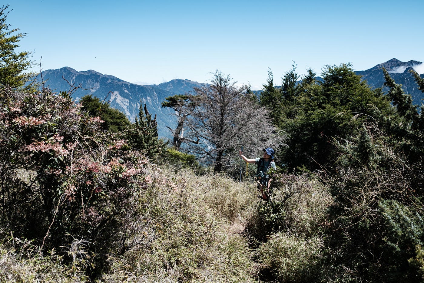 爬升約700m到岔路口後,就是令人心心念念的高山草原風景,兩邊都可以看到遠方的高山,可遠眺玉山主峰、關山大崩壁、也可以沿著稜線一路看到向陽山,還有在山壁中來回穿插的南稜公路。