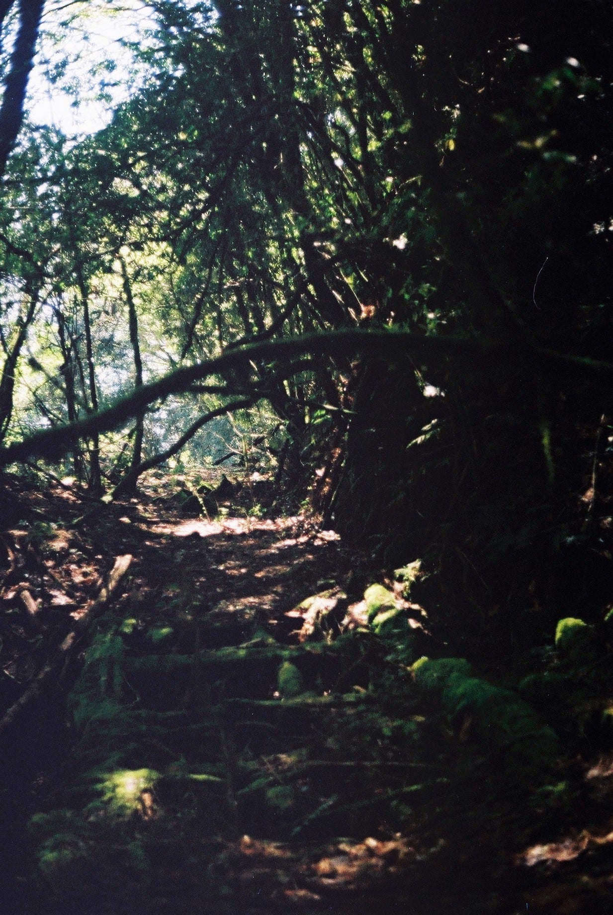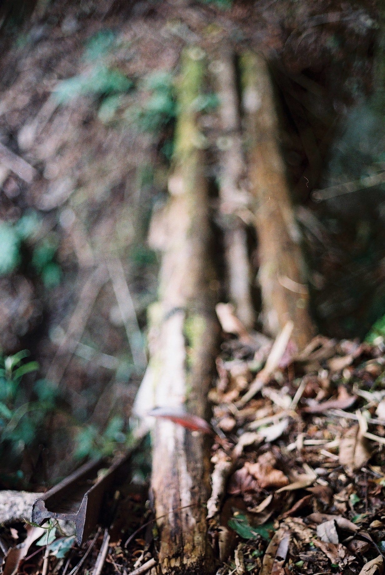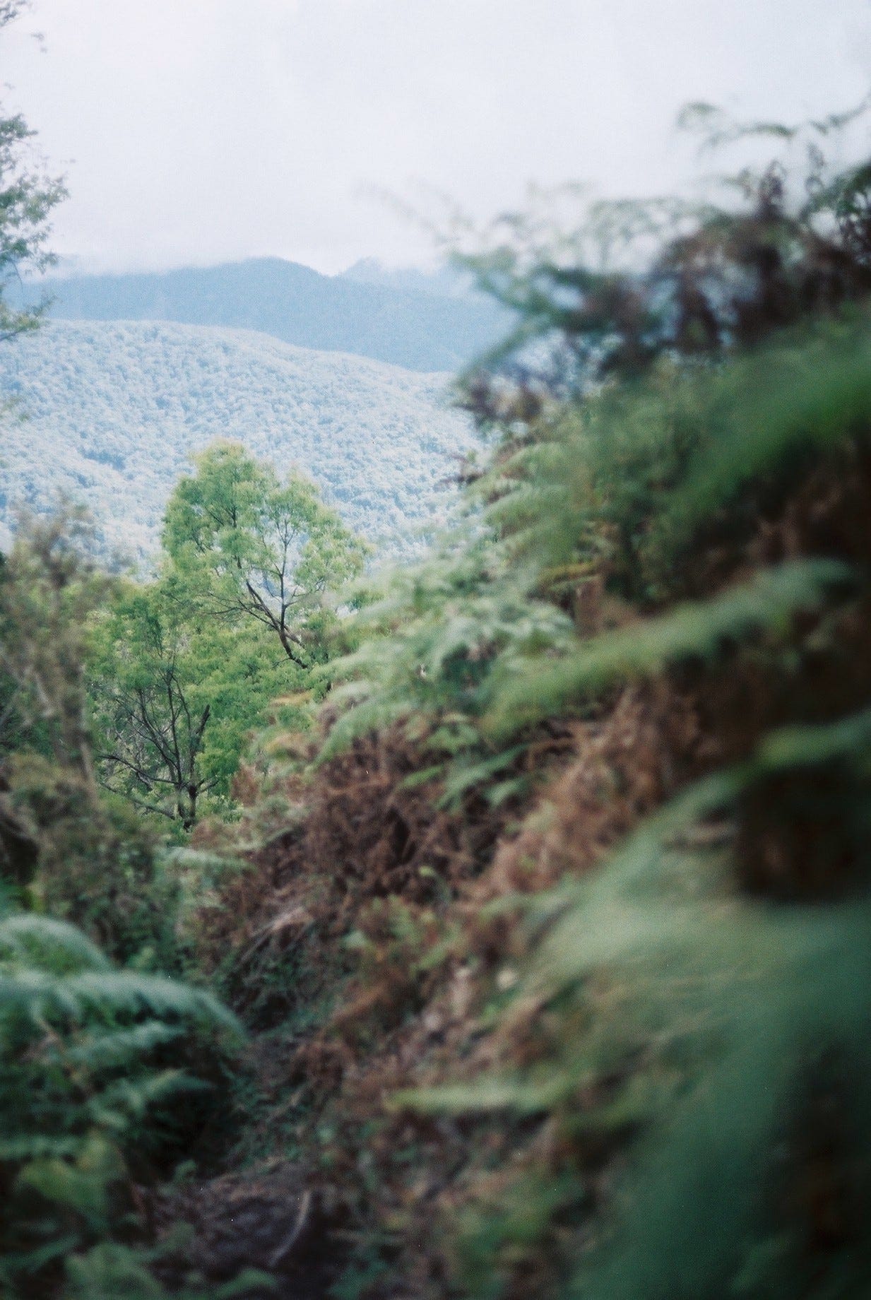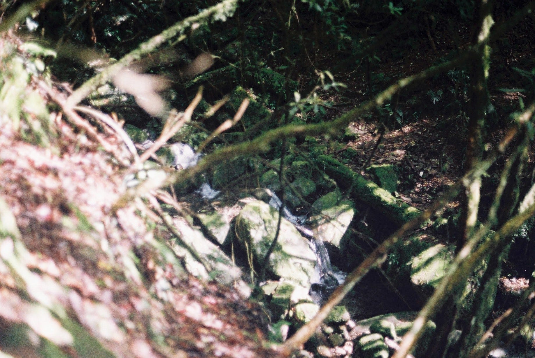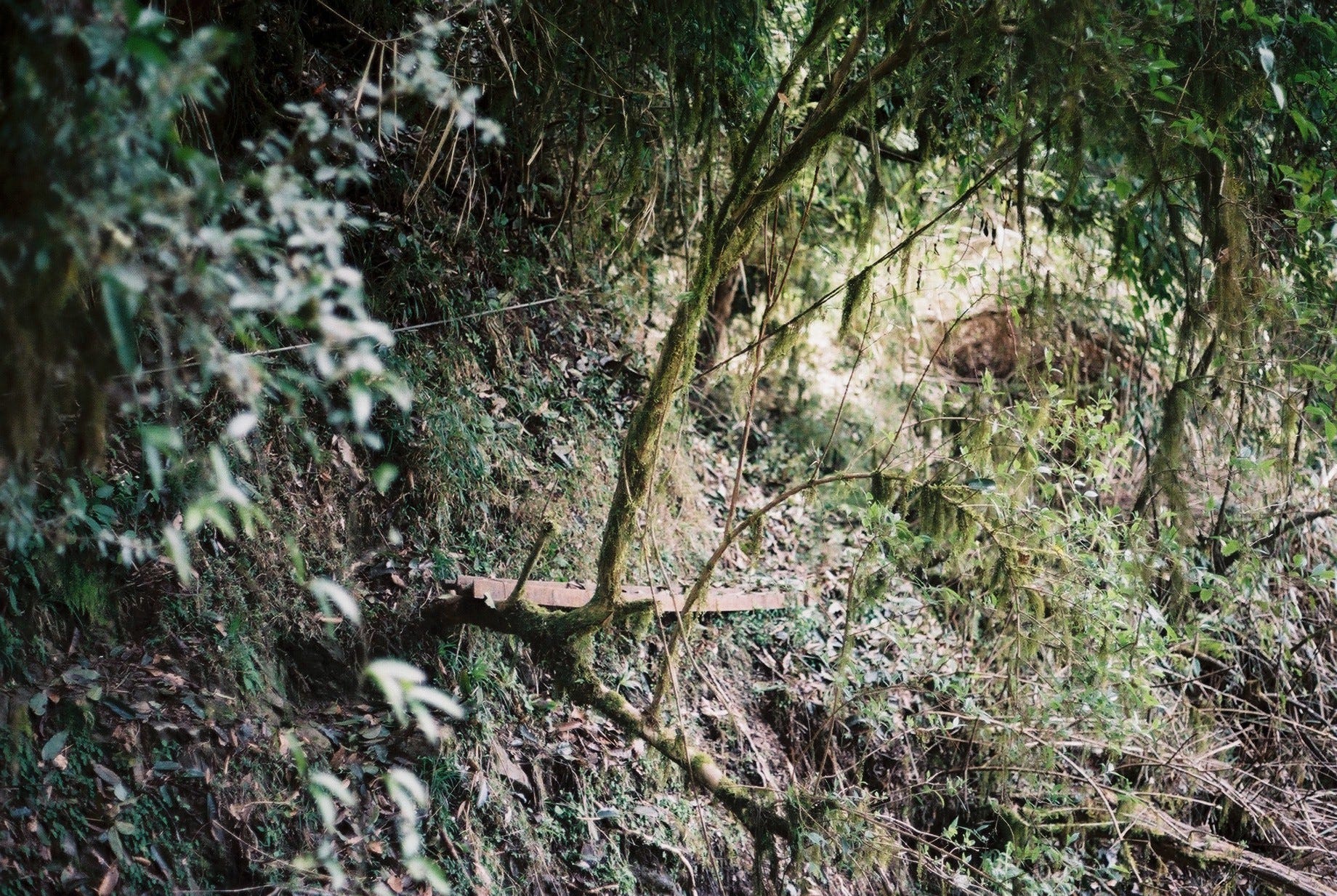 8:25 對自己講了大概10次「再拍最後一張」之後終於甘願整裝出發,往航跡上標註的蕨類陡坡展望點前進。隊友用鐮刀在茂密的植被間硬是開出路來,腳下偶爾可見到似乎是動物行走的痕跡,埋頭走了許久後,一回神打開GPX發現已經超過原本標註的白雪村展望點,有點失望但也不太想再回頭,心想那就算了。