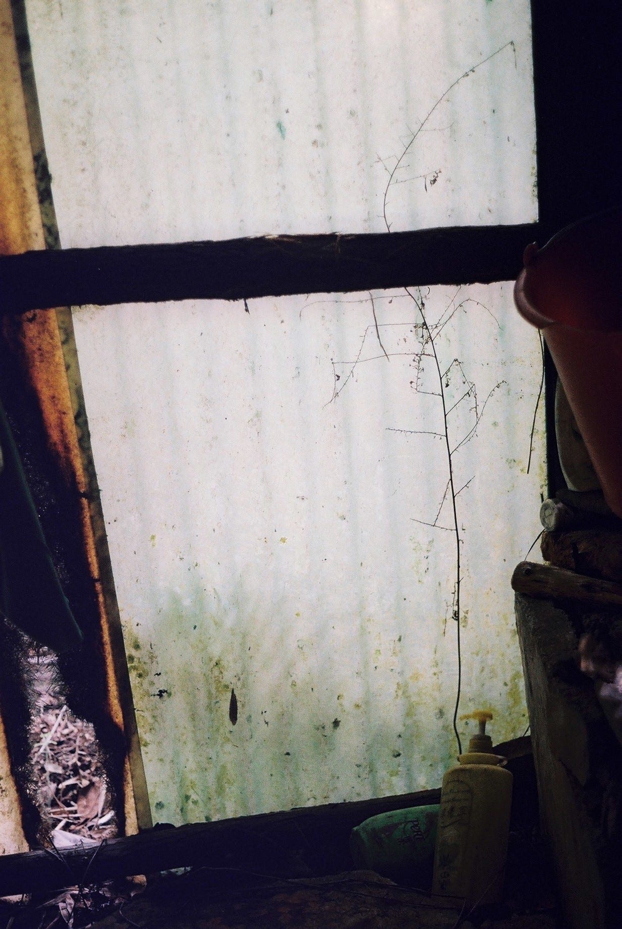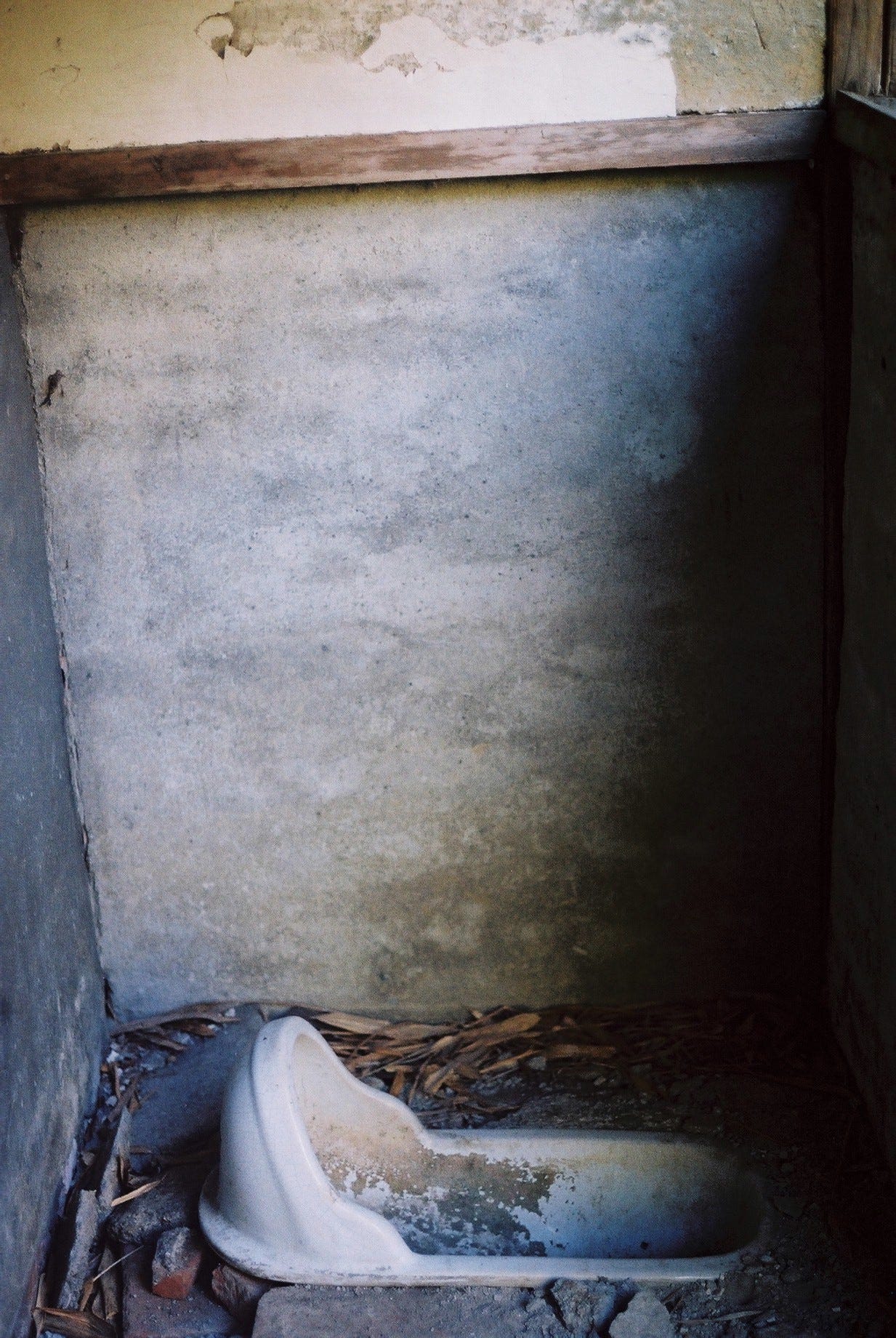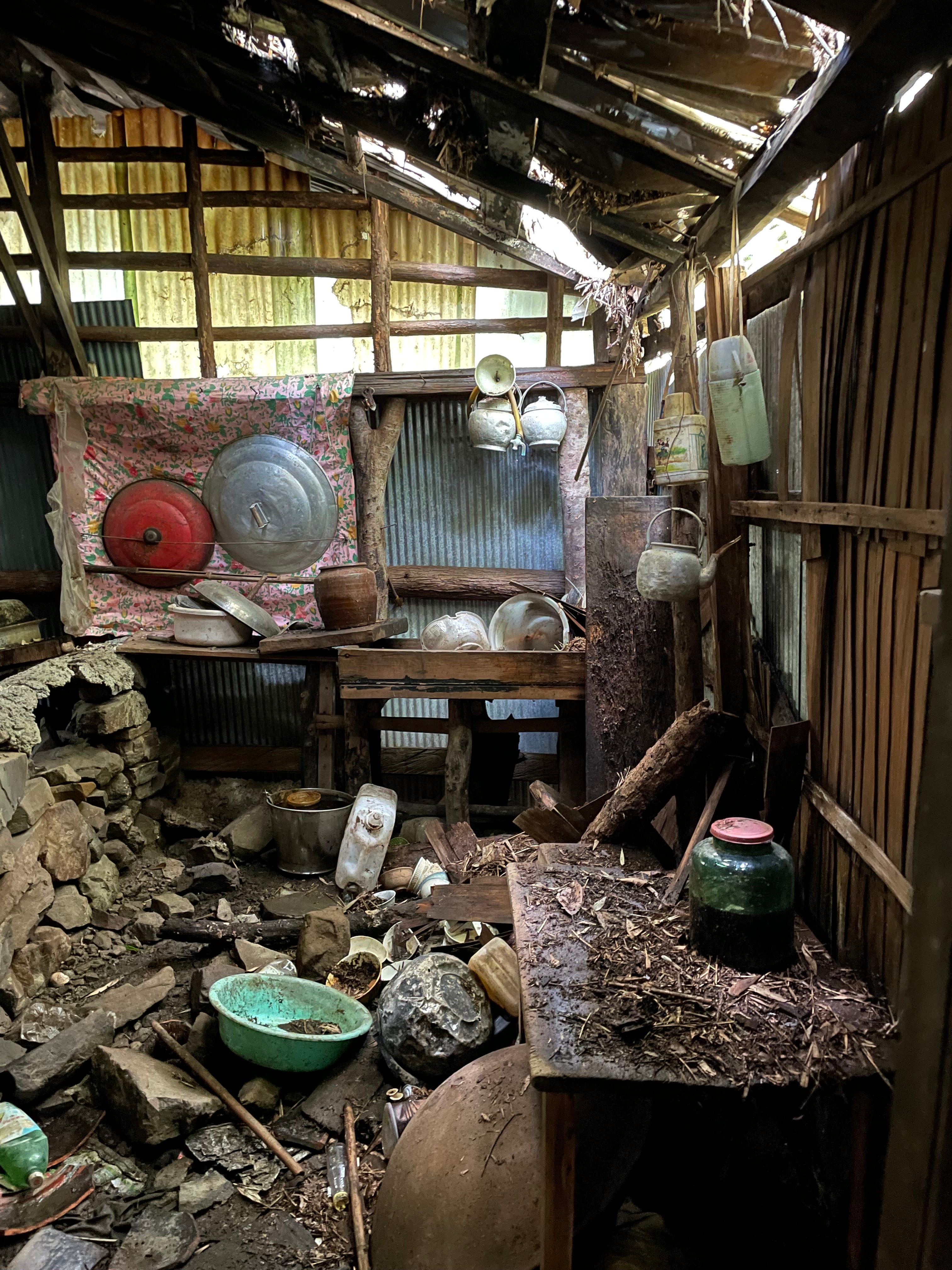 | (中)東側有洗手台,可透過損壞的牆面直接見到宅邸內部/(右)屋旁的地面上擺放著一整排小朋友的鞋子和拖鞋 | ||