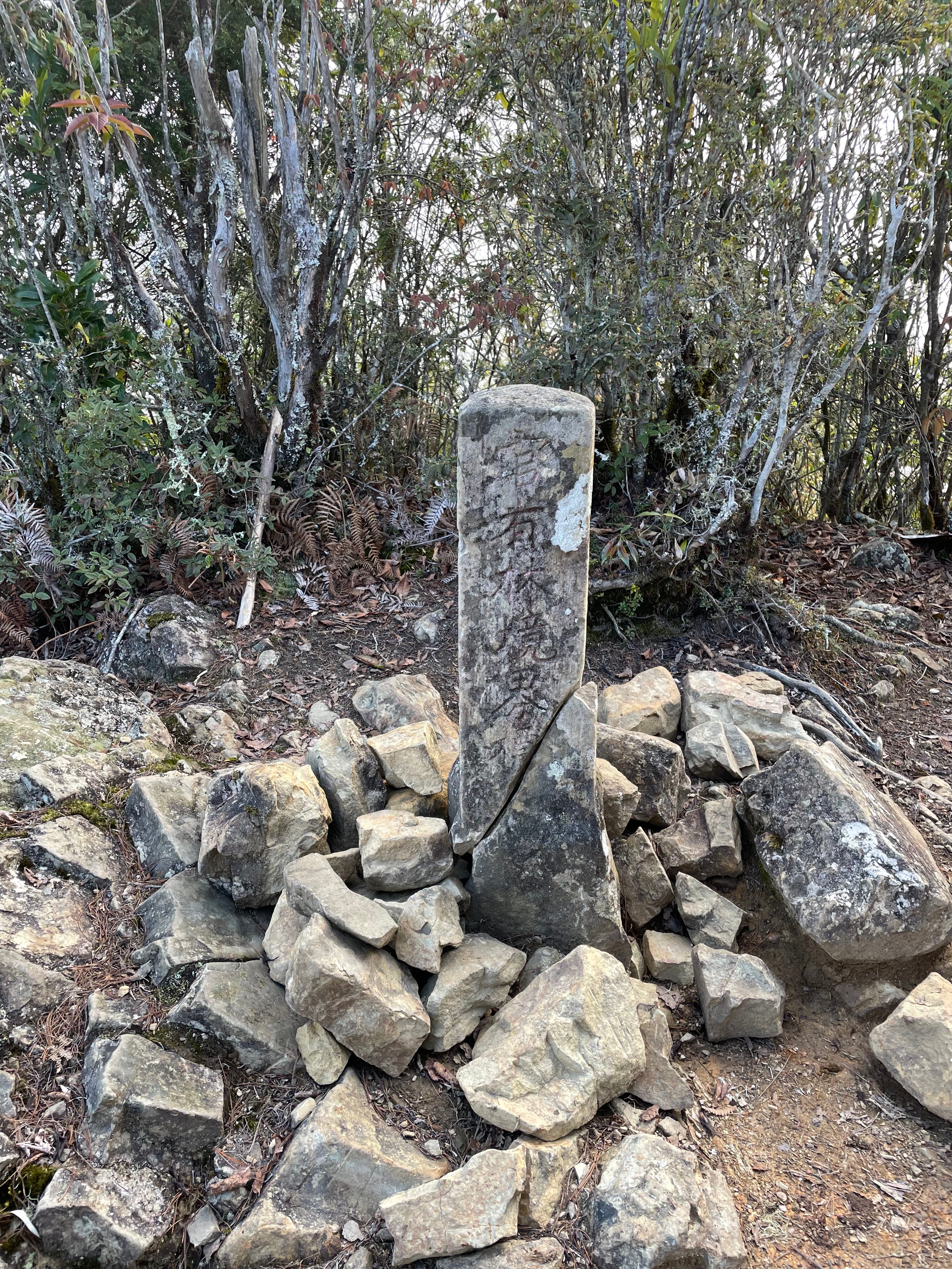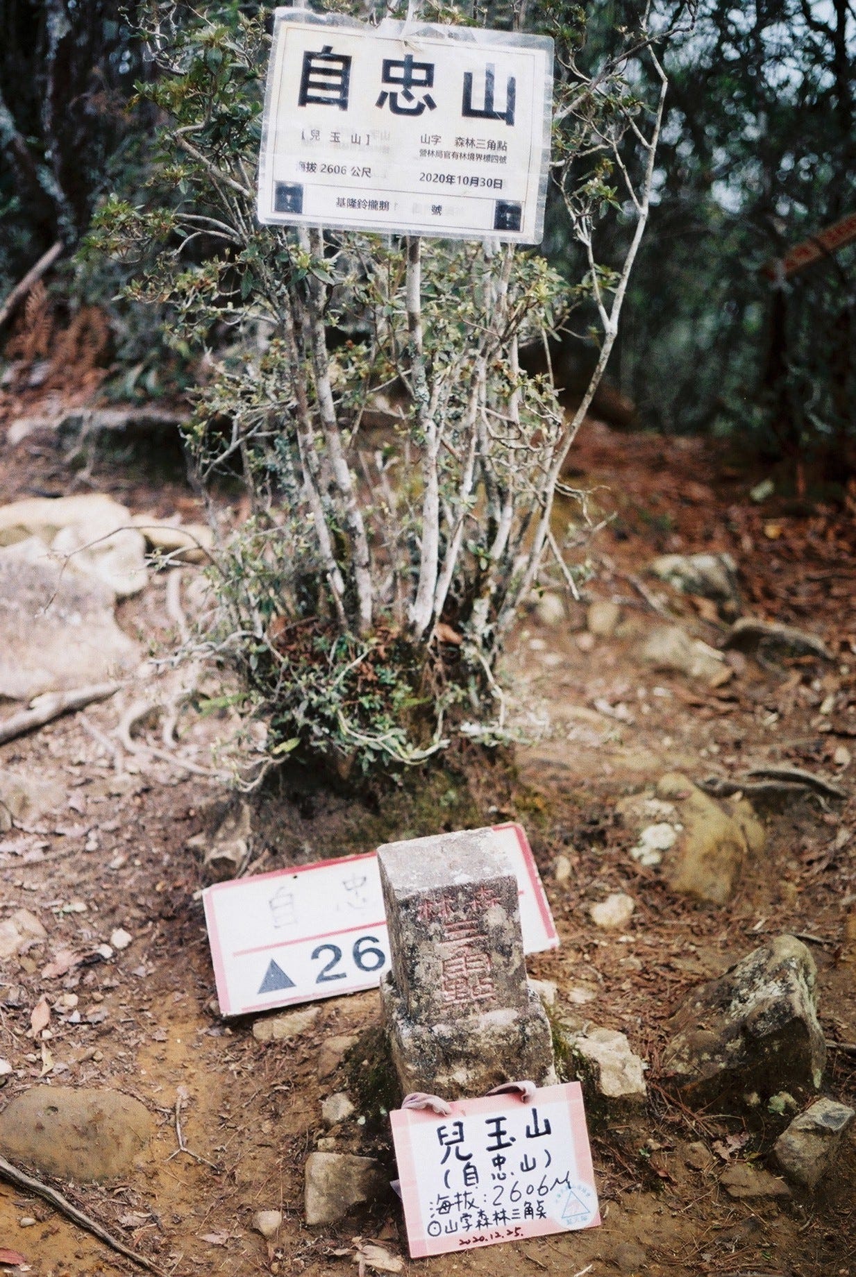 | (左) 自忠山三角點上的「官有林界」石碑 / (中右)登出! | ||