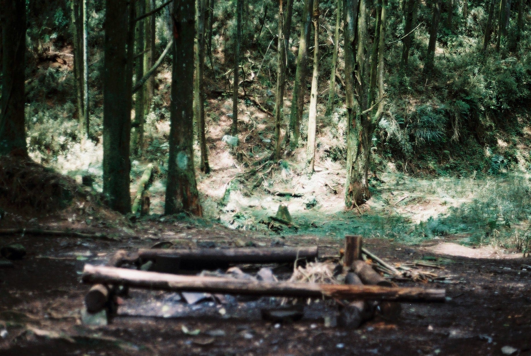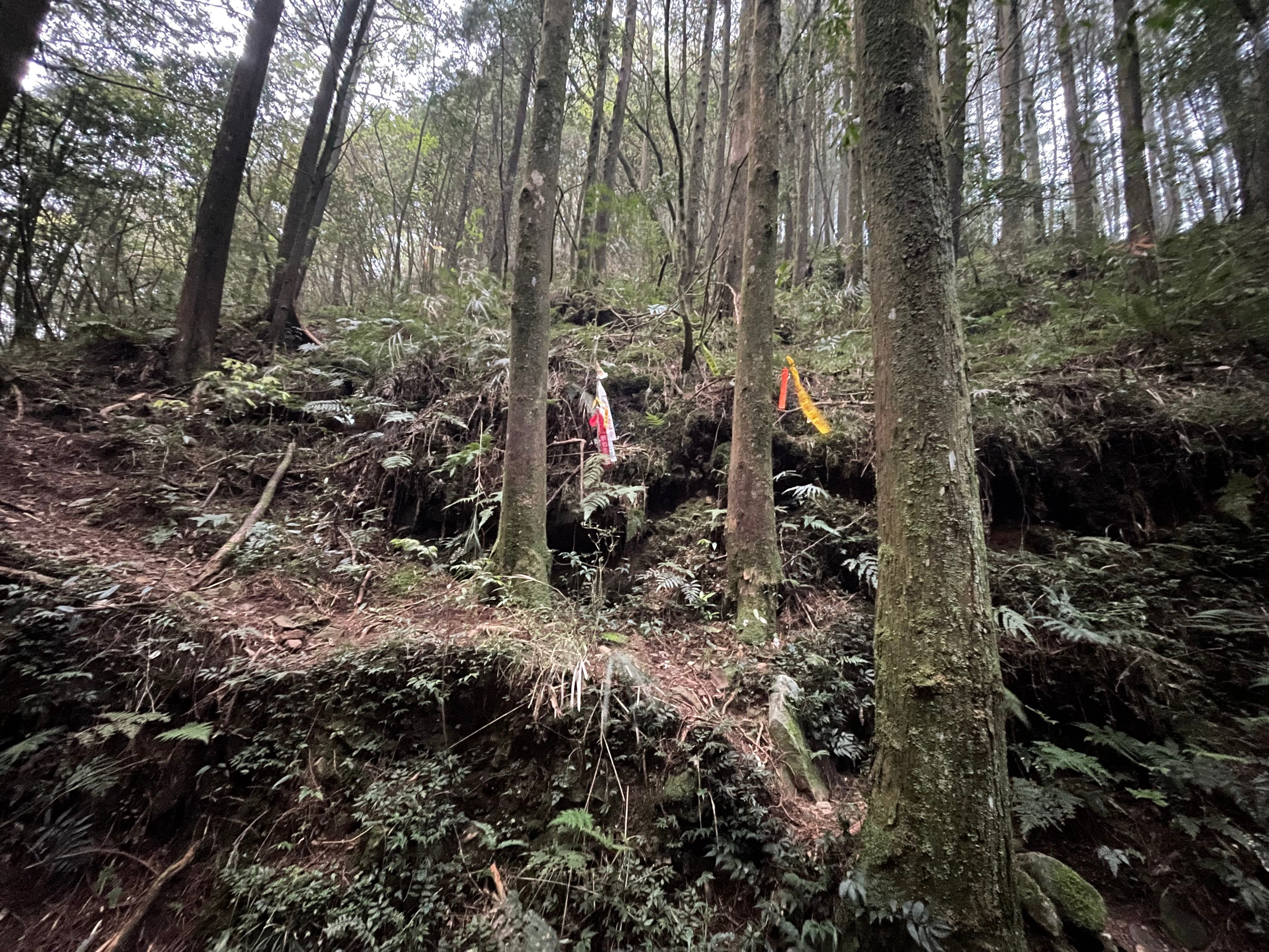 行走至航跡標示「疑似工作站」的位置,會發現左下方出現一大片平坦且鋪滿松針的營地,網路上有紀錄寫說是第14林班工作站遺址。