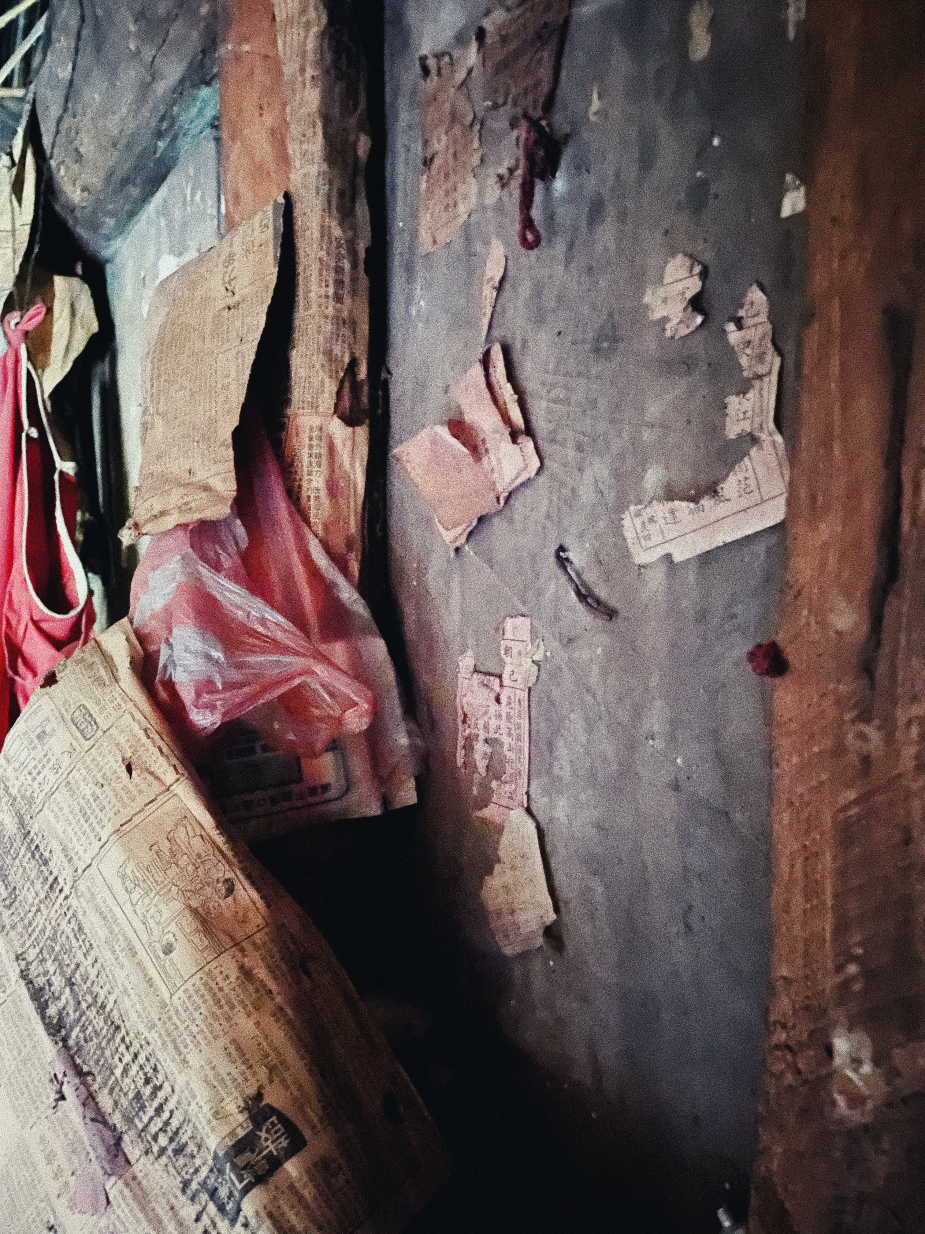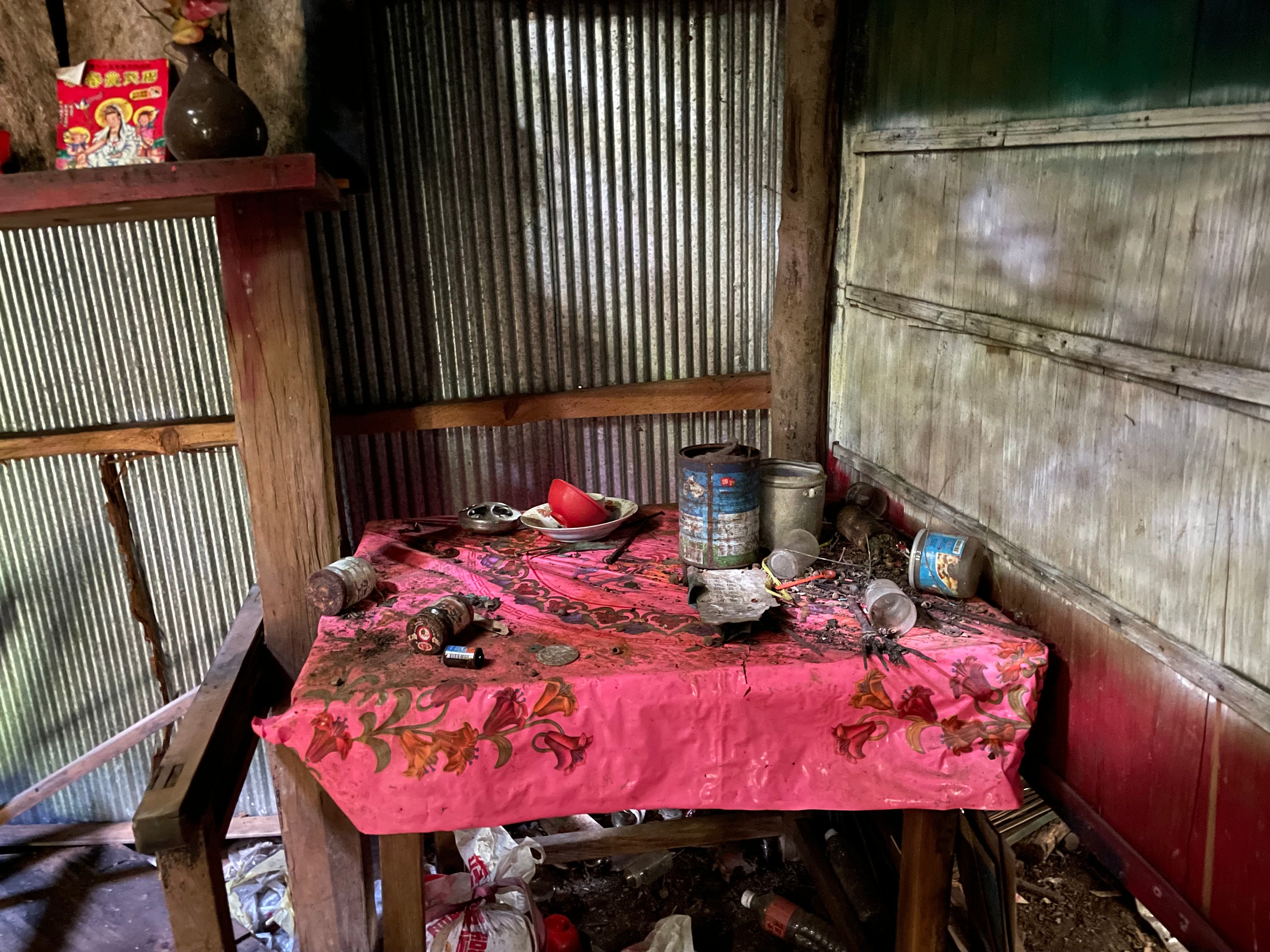| (左)「教宗踏入清真寺」為2001年的新聞,應是廢村後來此的人所貼 / (中右) 一進門便可見到神桌 | ||