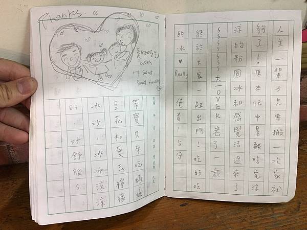 店內走復古風,國小課桌椅,黑板上貼著店家照片,很喜歡這種照片牆,記錄著生活裡的點點滴滴。另外桌上還有國小的作業簿,供顧客留言繪畫,很有趣。