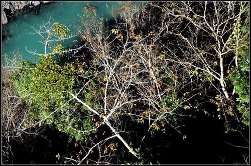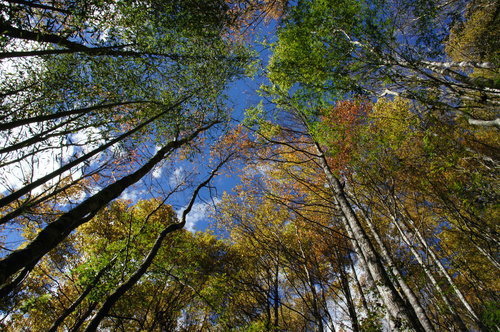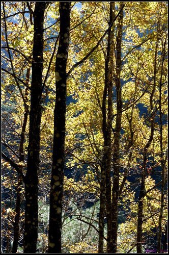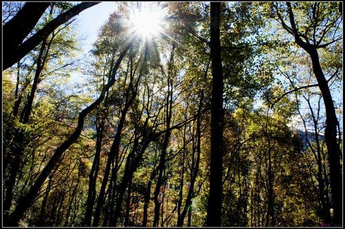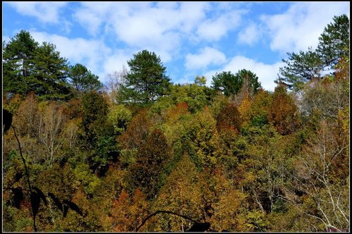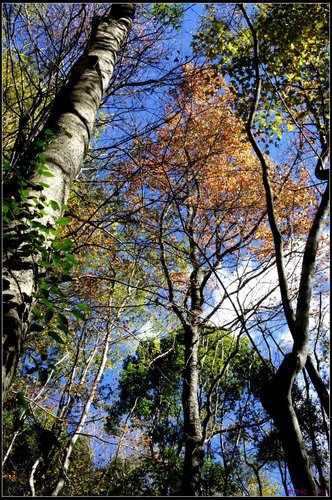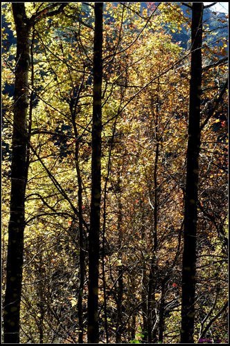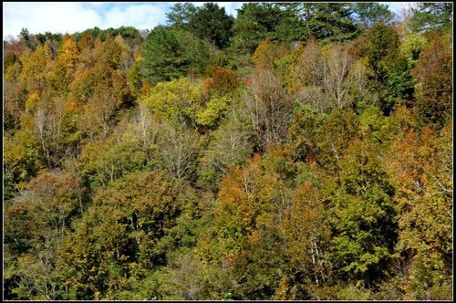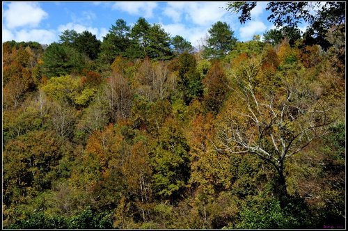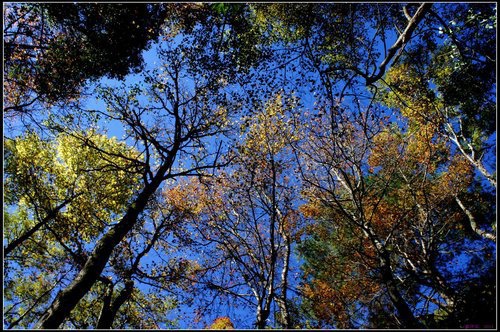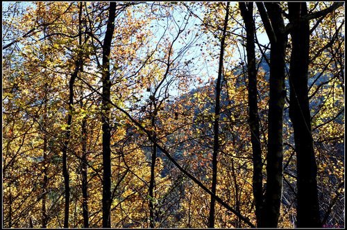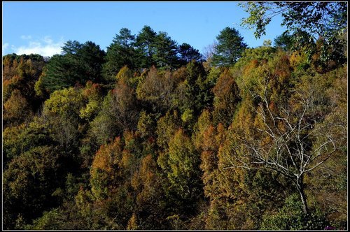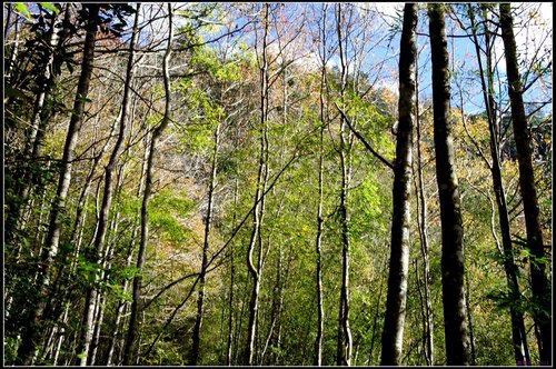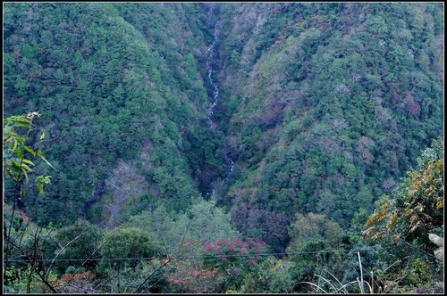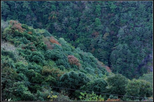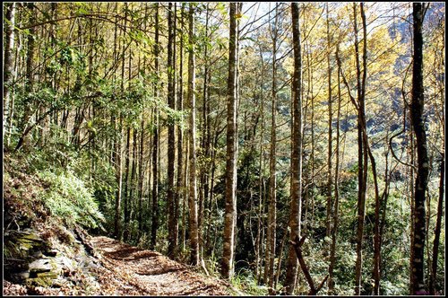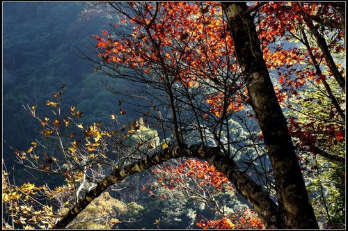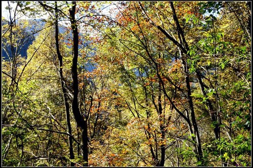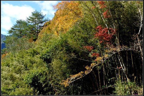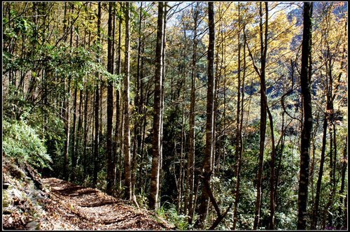 古道旁和對面山巒的~楓、槭、櫸樹正迎著冷風換裝