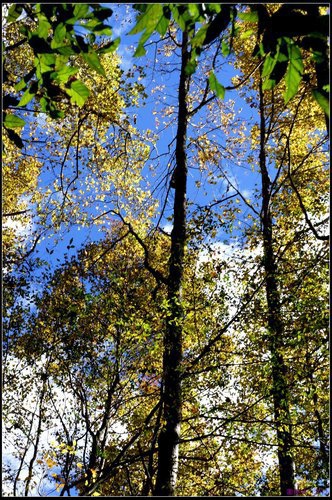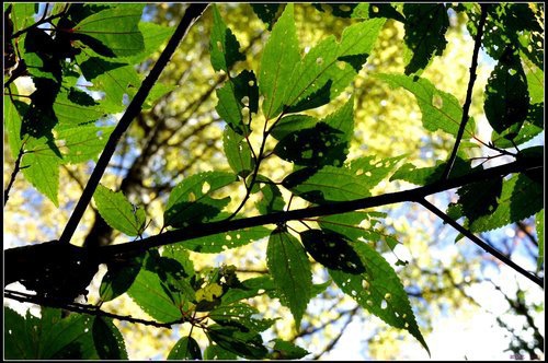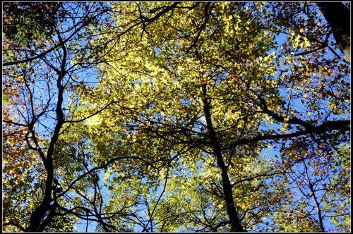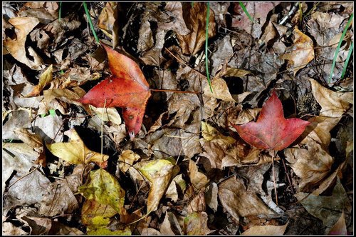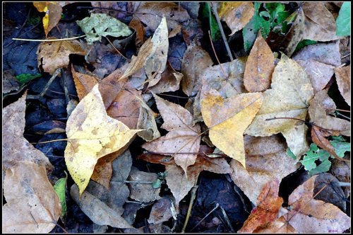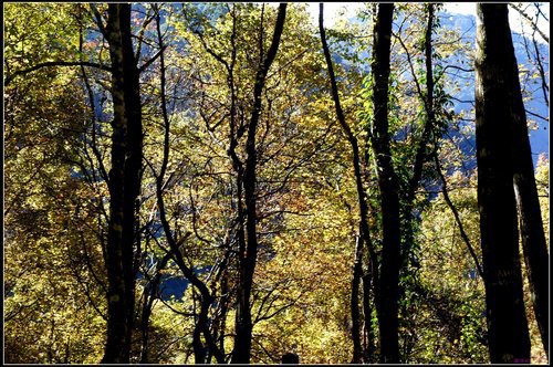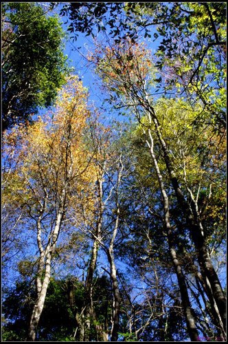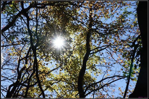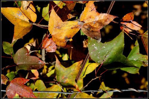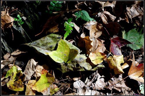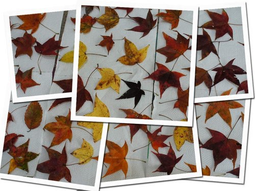 在陽光閃耀中,秋天的黃葉裡,間著或紅或棕,或綠或白