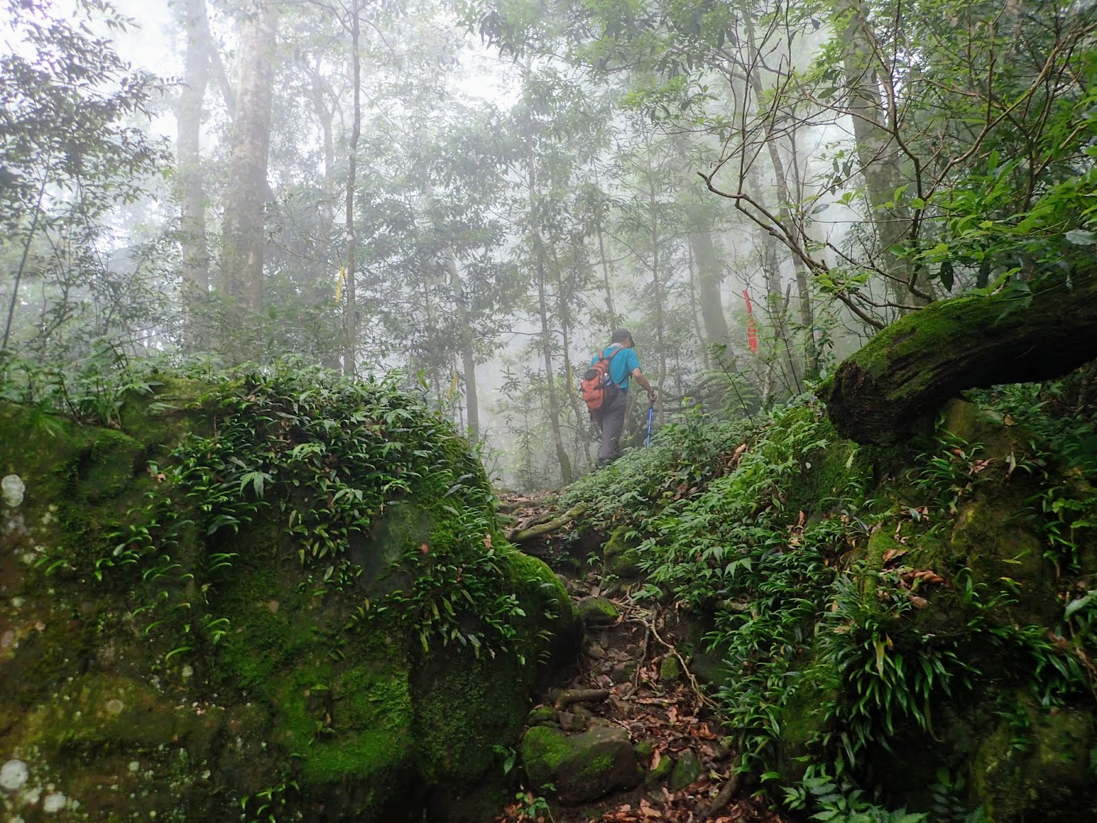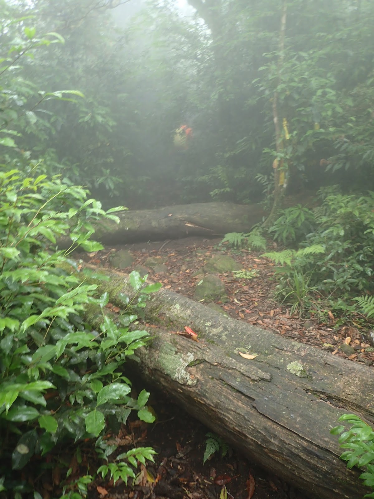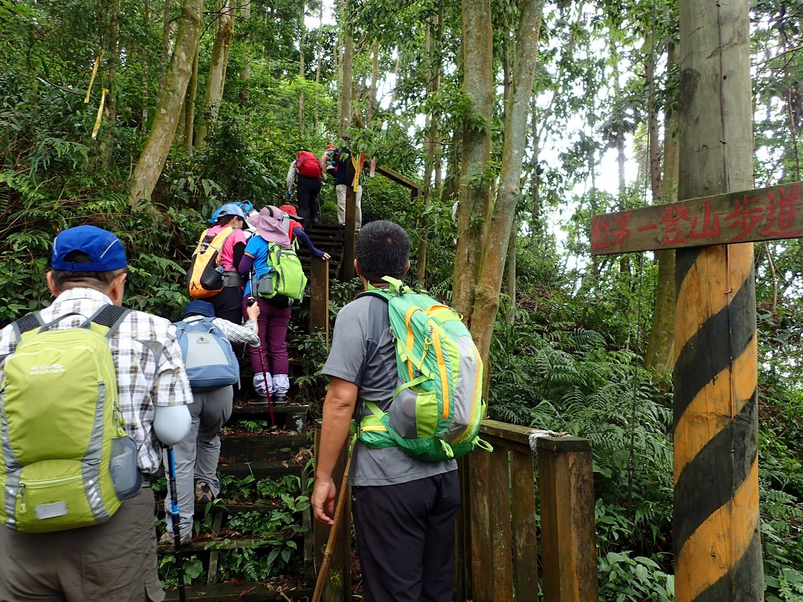 起登的木棧階梯真的是史上第一滑, 好像抹油般站在上面險些滑倒, 根本就不能移動, 捨棄木頭階梯走旁邊山路才好些, 會這麼滑是因為今天沒穿雨鞋改穿登山鞋?