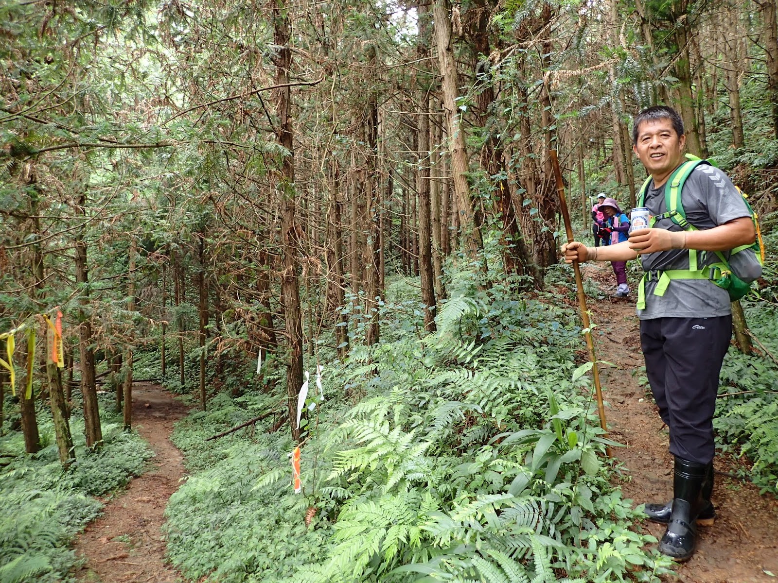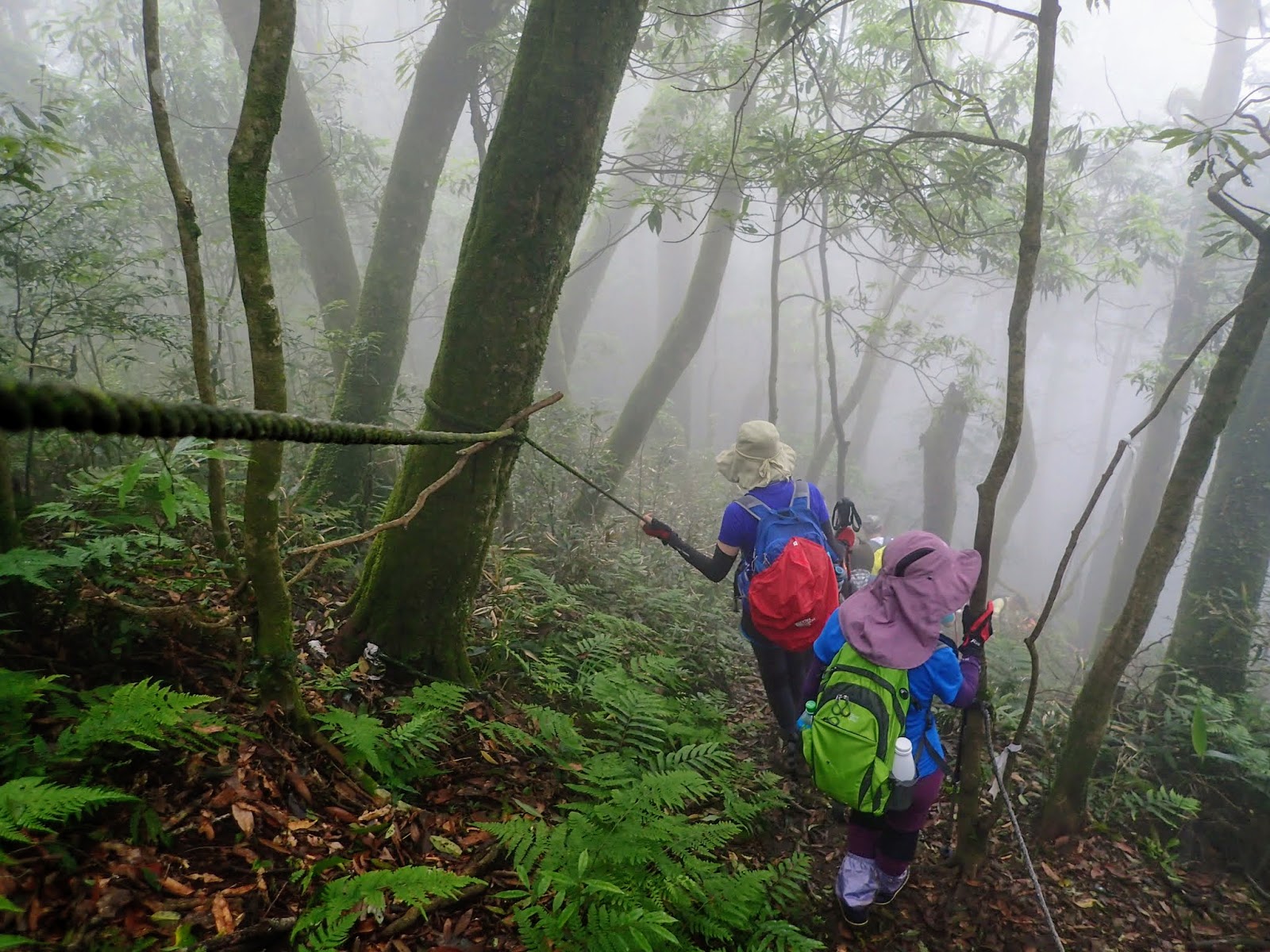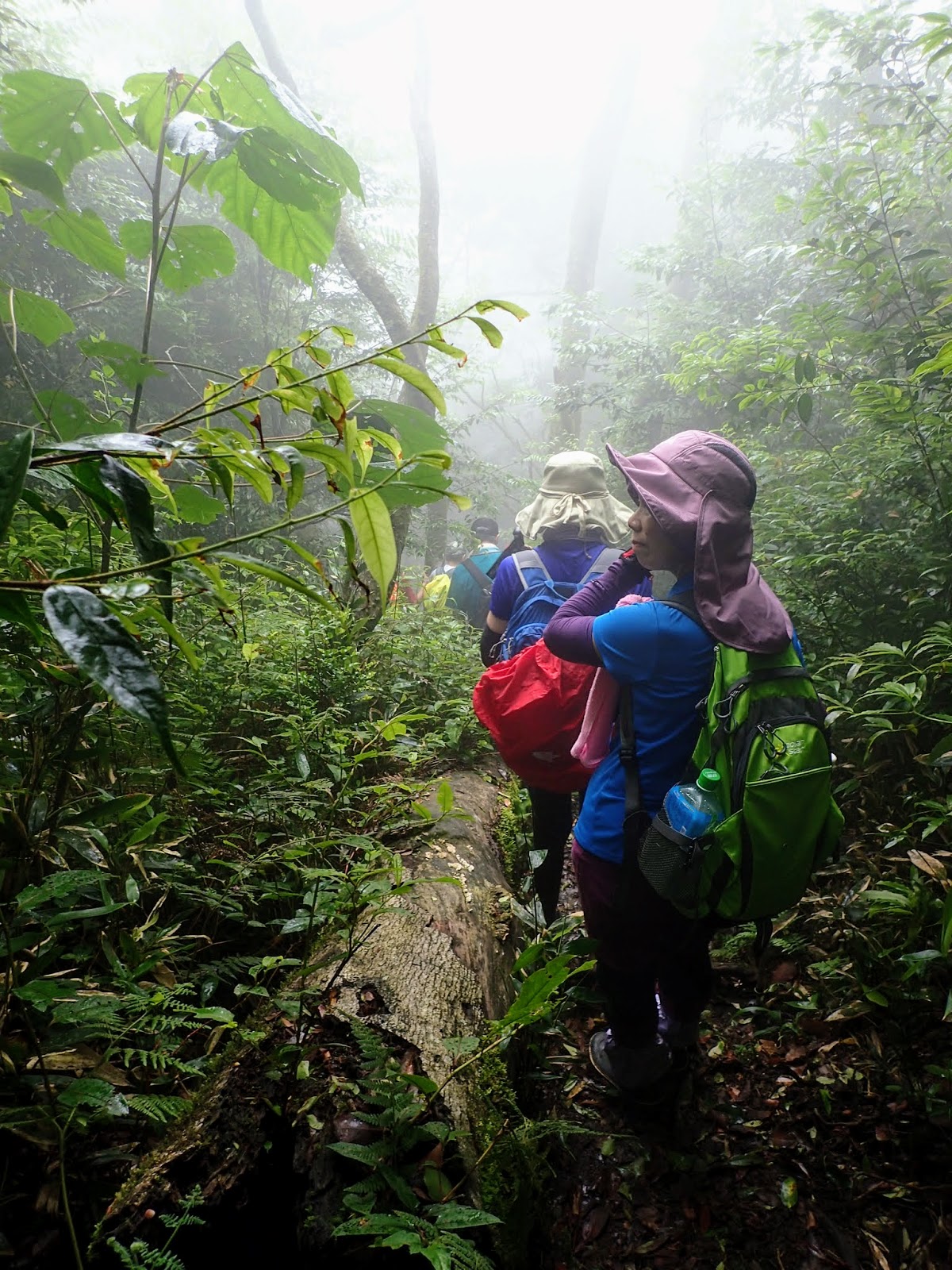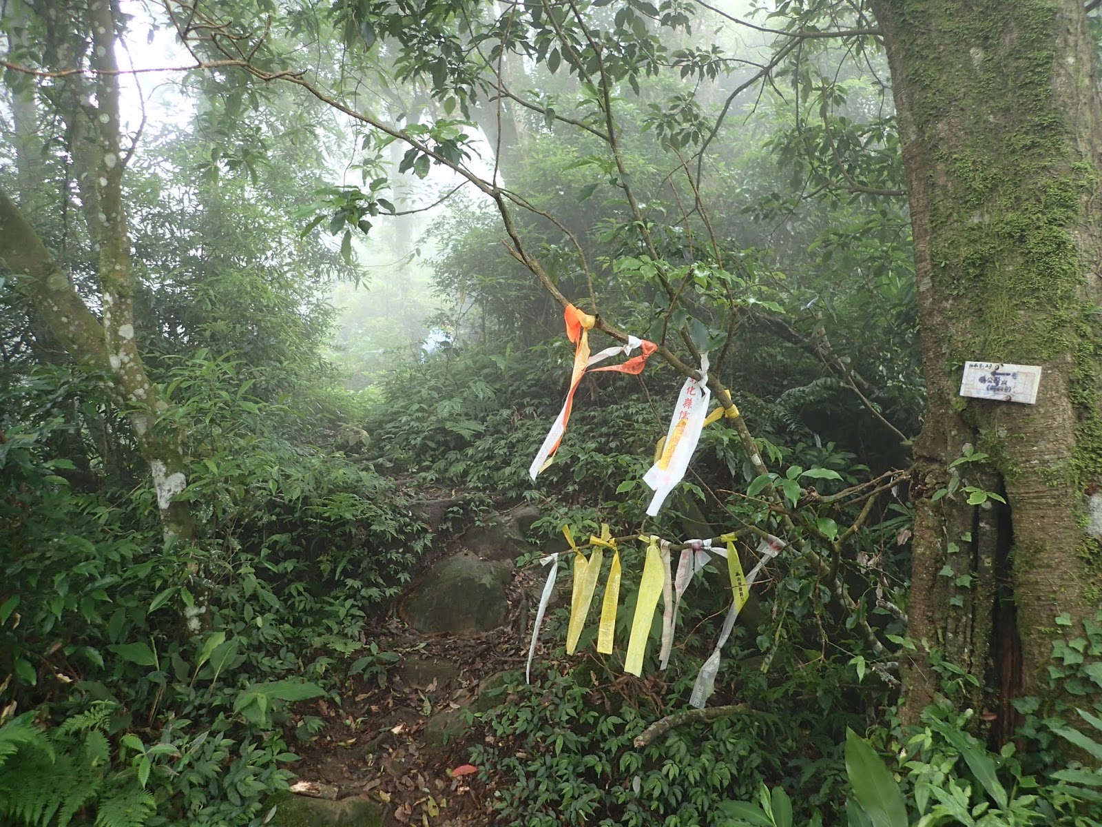起登的木棧階梯真的是史上第一滑, 好像抹油般站在上面險些滑倒, 根本就不能移動, 捨棄木頭階梯走旁邊山路才好些, 會這麼滑是因為今天沒穿雨鞋改穿登山鞋?