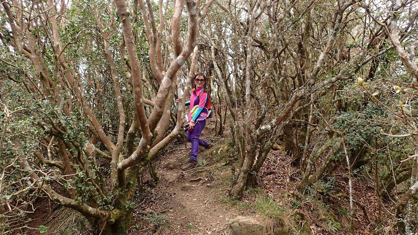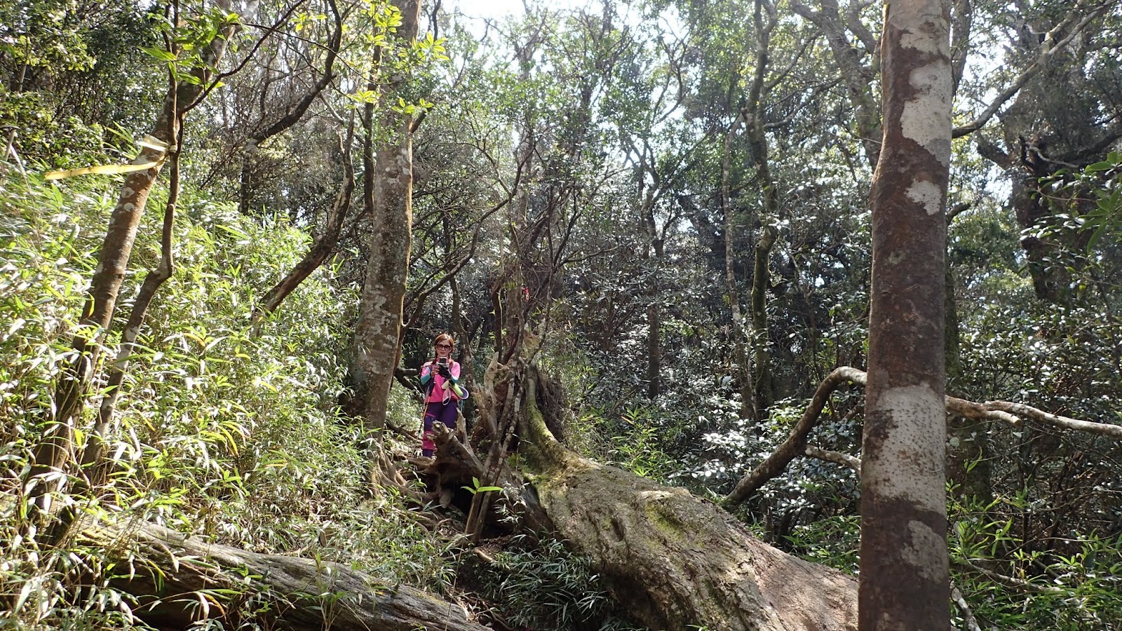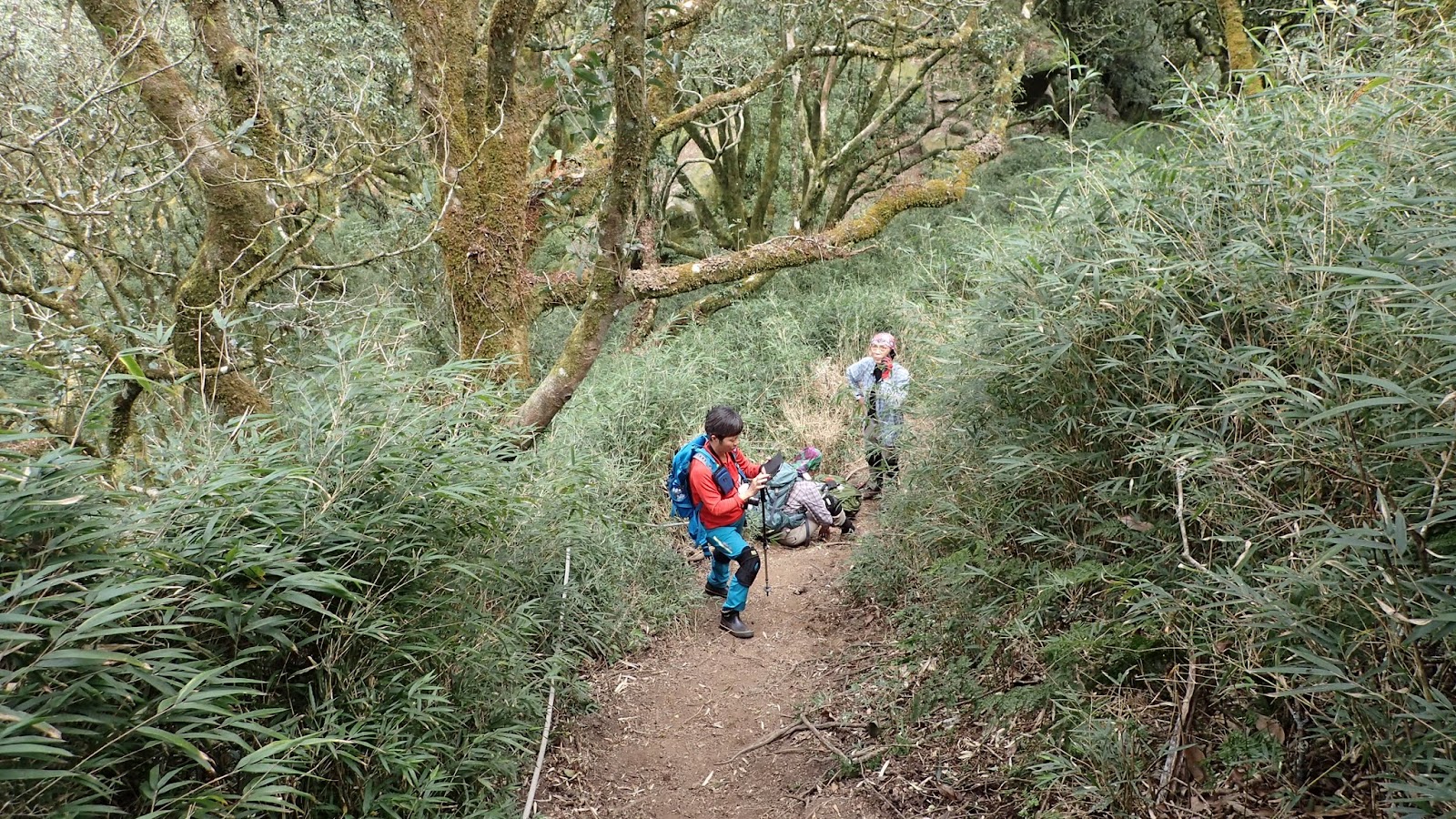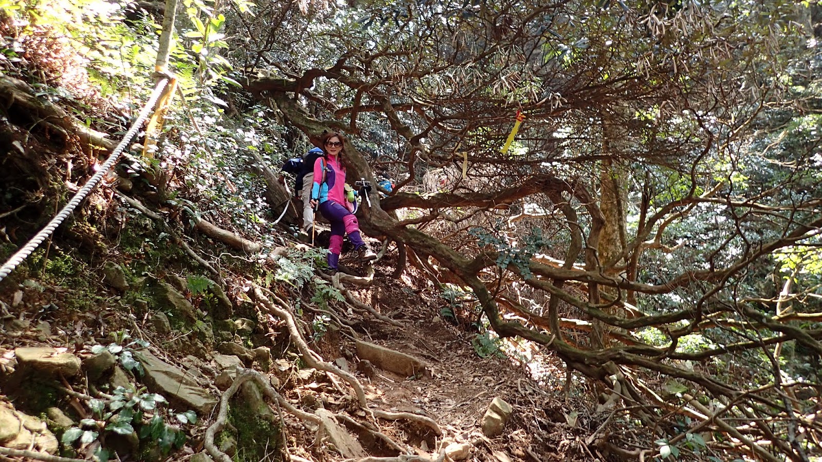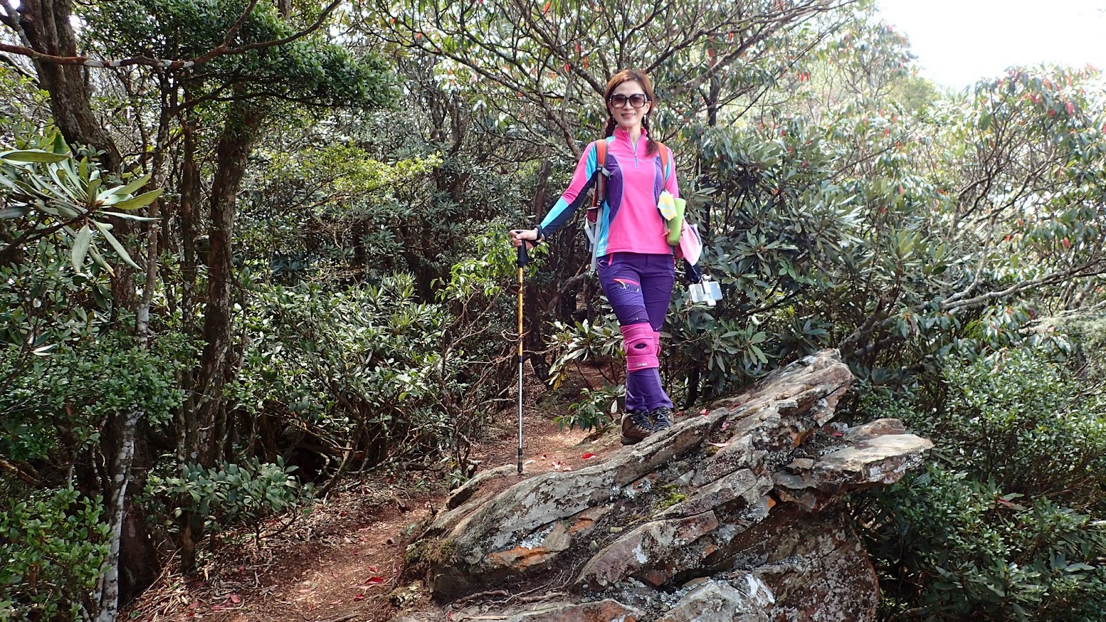 走在杜鵑林內, 一路上景致迷人充滿驚喜, 九段要我們繼續走, 說後面的人如果太晚到可能不讓他們上去了, 歐耶, 取得上加里山的通行證, 新認識的紅衣服姐姐也很喜歡拍照, 沿途幫我們拍好多照片, 瞧那拍照架勢, 專業認真