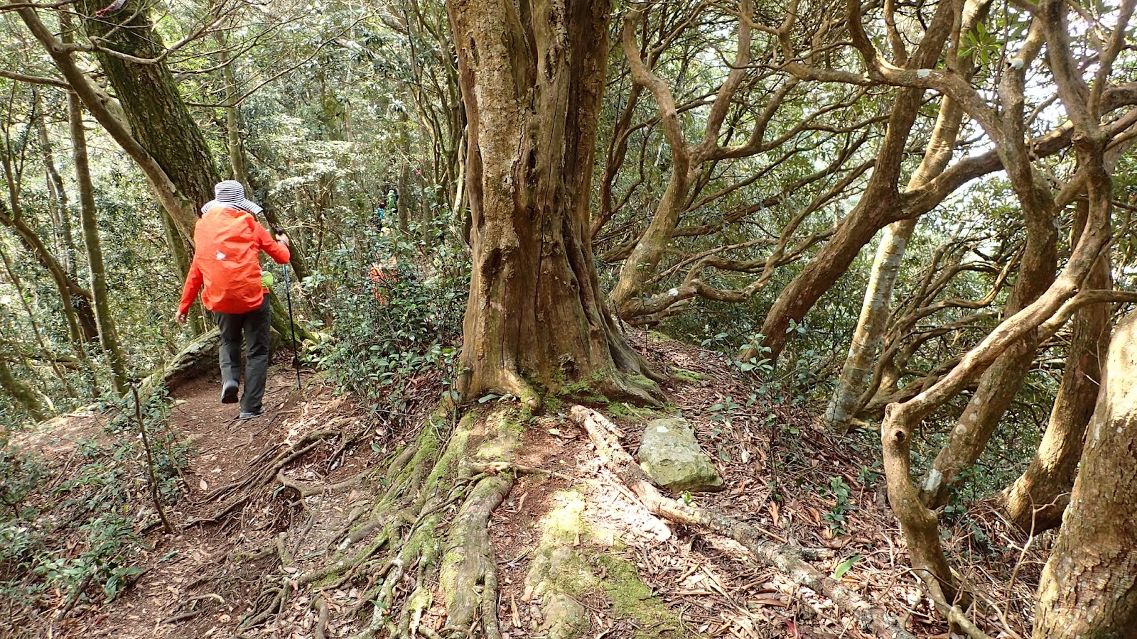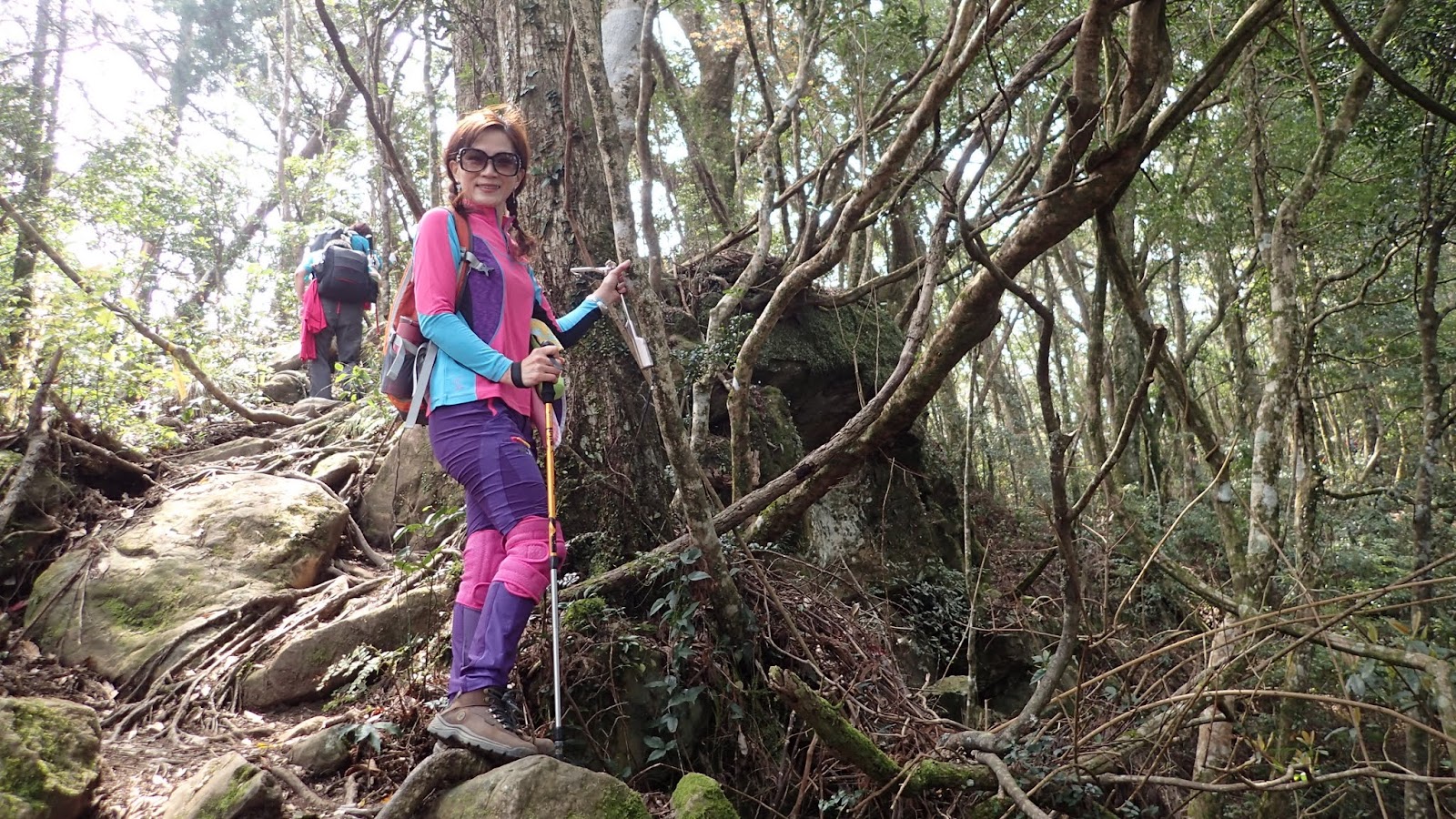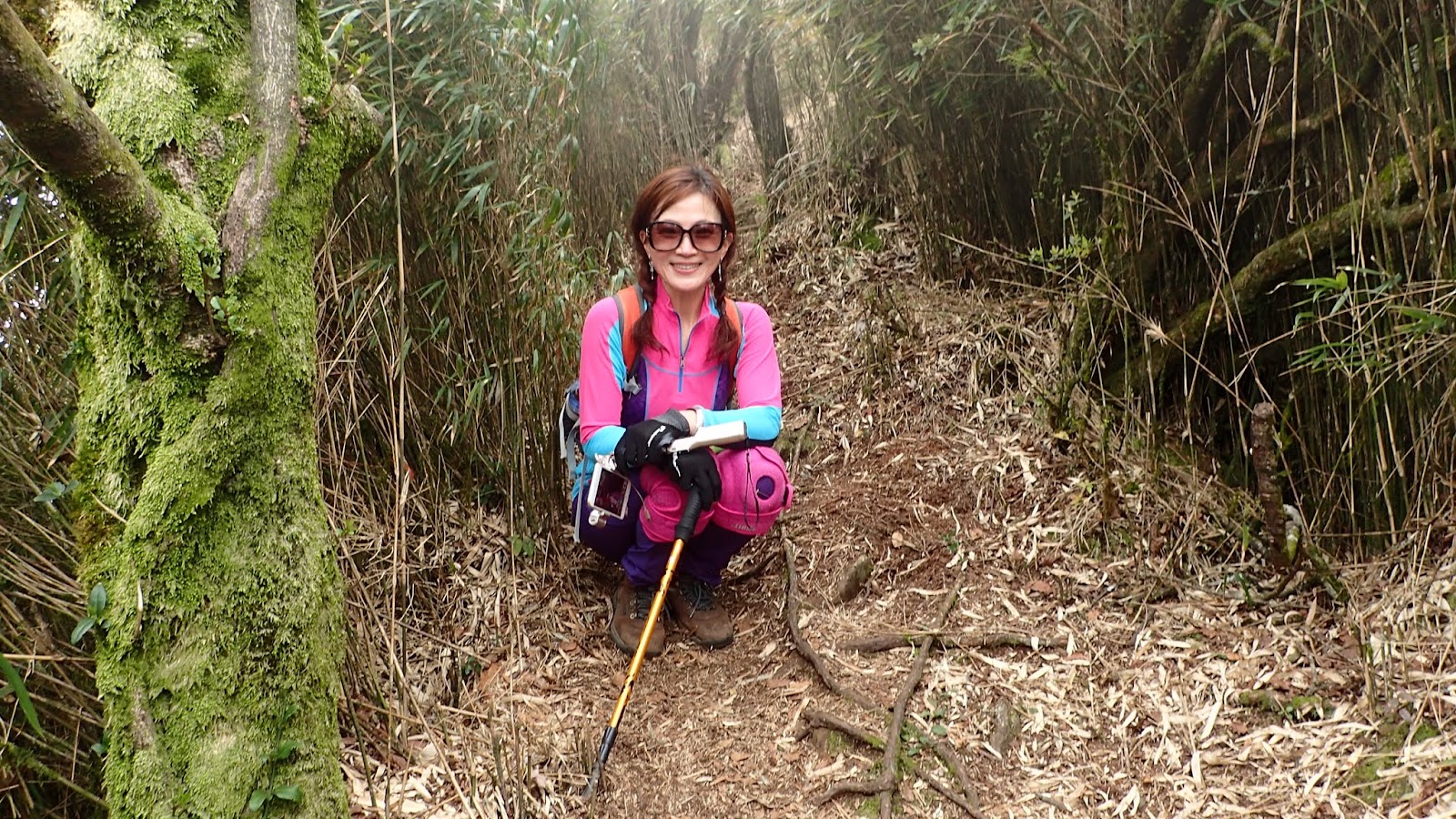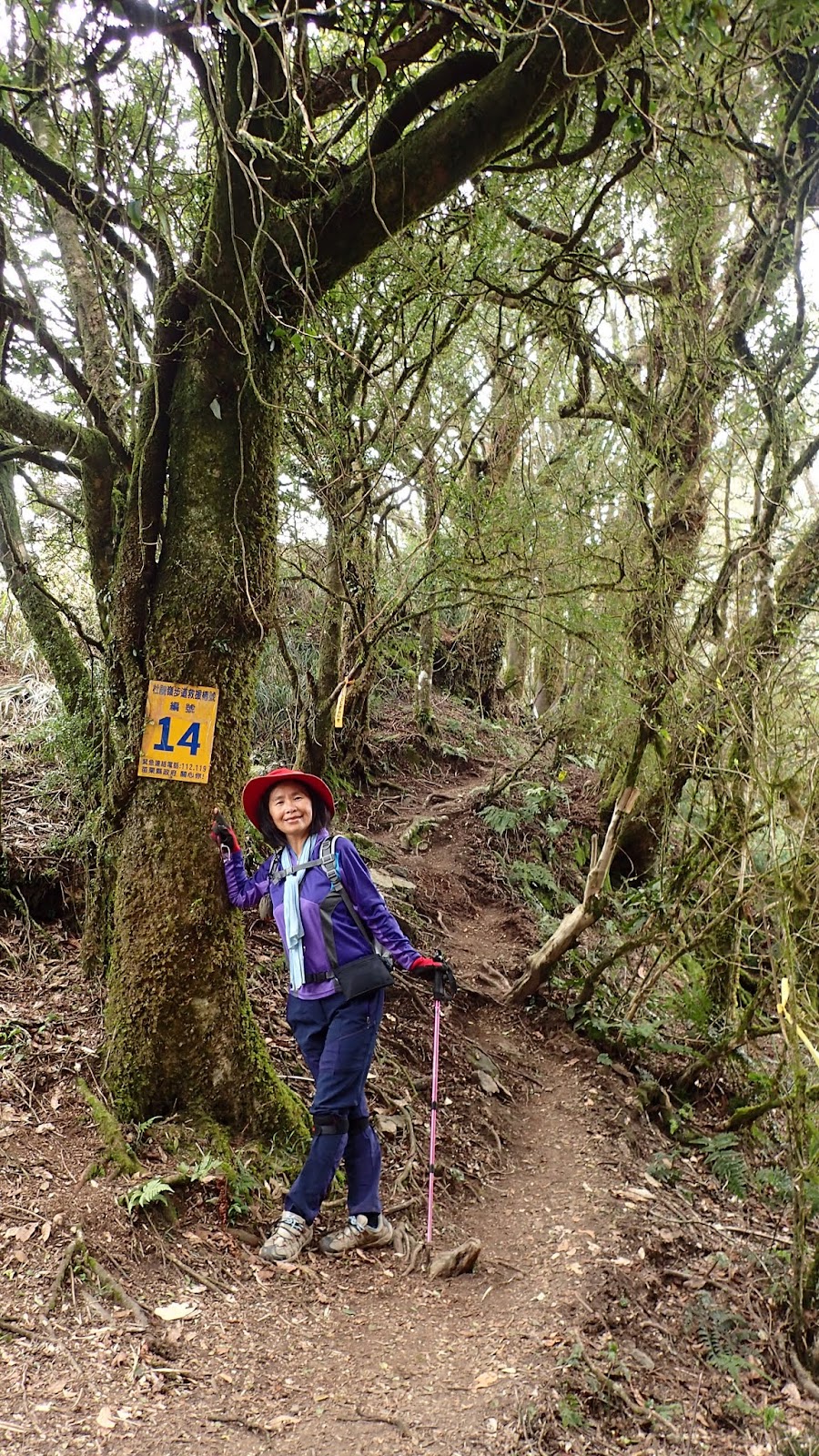 走在杜鵑林內, 一路上景致迷人充滿驚喜, 九段要我們繼續走, 說後面的人如果太晚到可能不讓他們上去了, 歐耶, 取得上加里山的通行證, 新認識的紅衣服姐姐也很喜歡拍照, 沿途幫我們拍好多照片, 瞧那拍照架勢, 專業認真