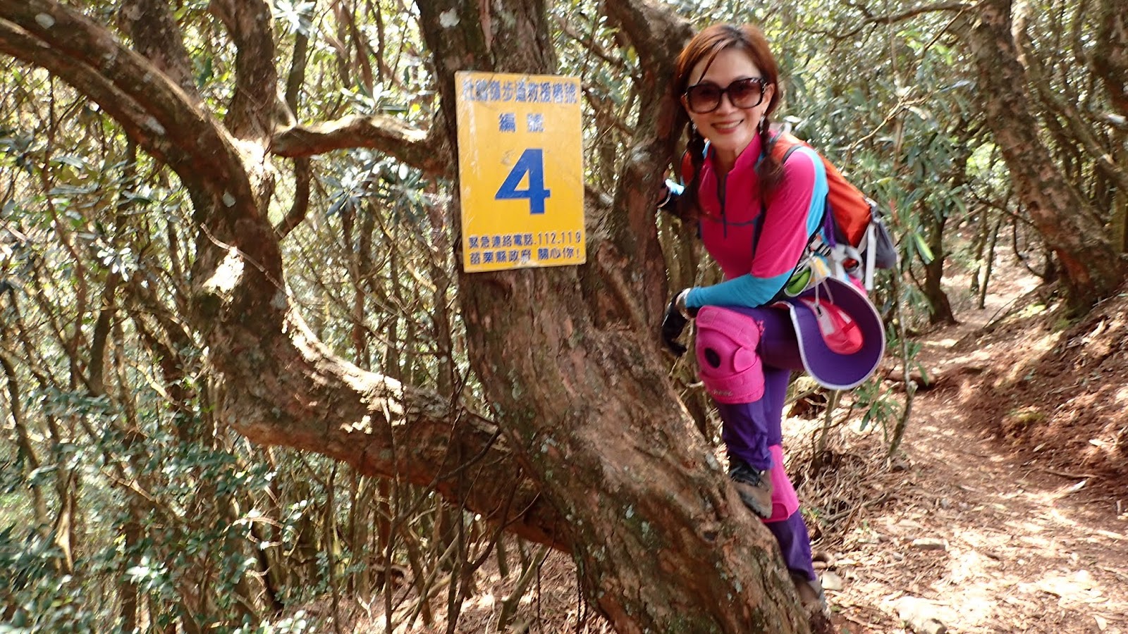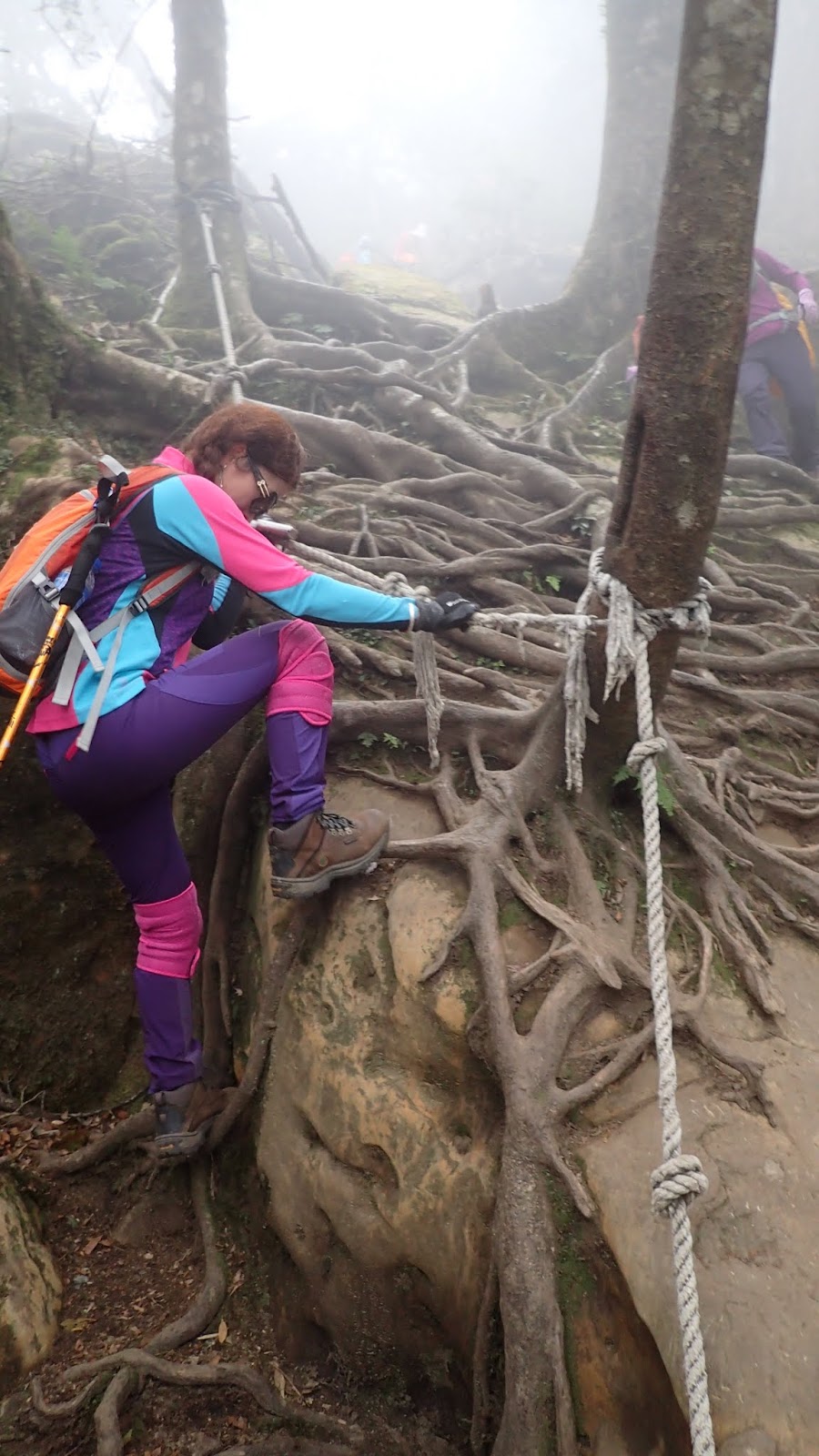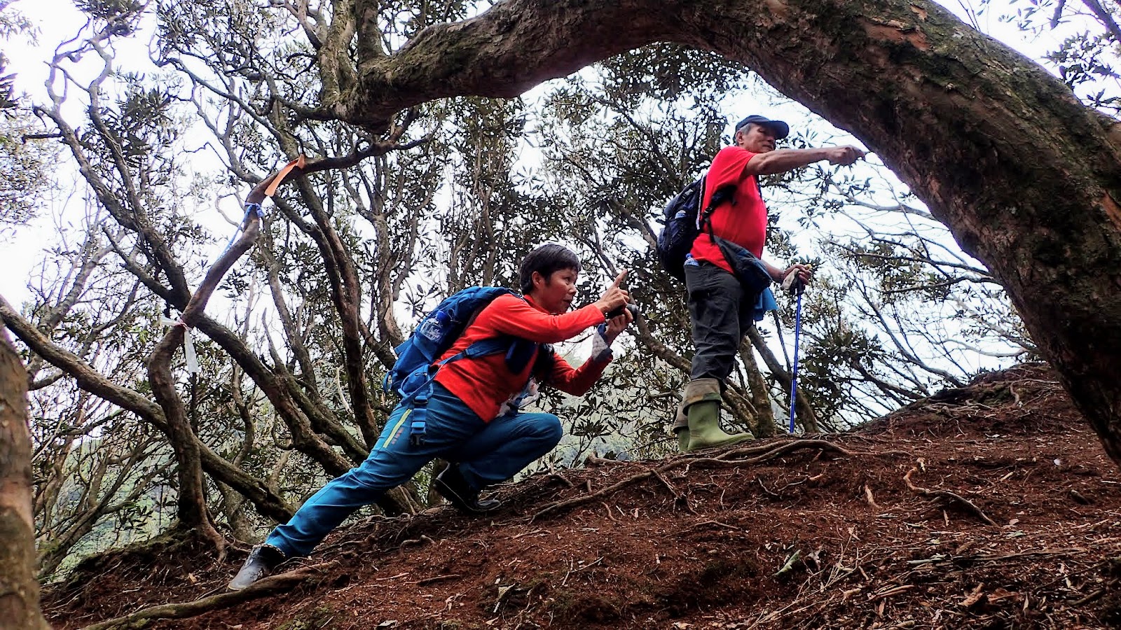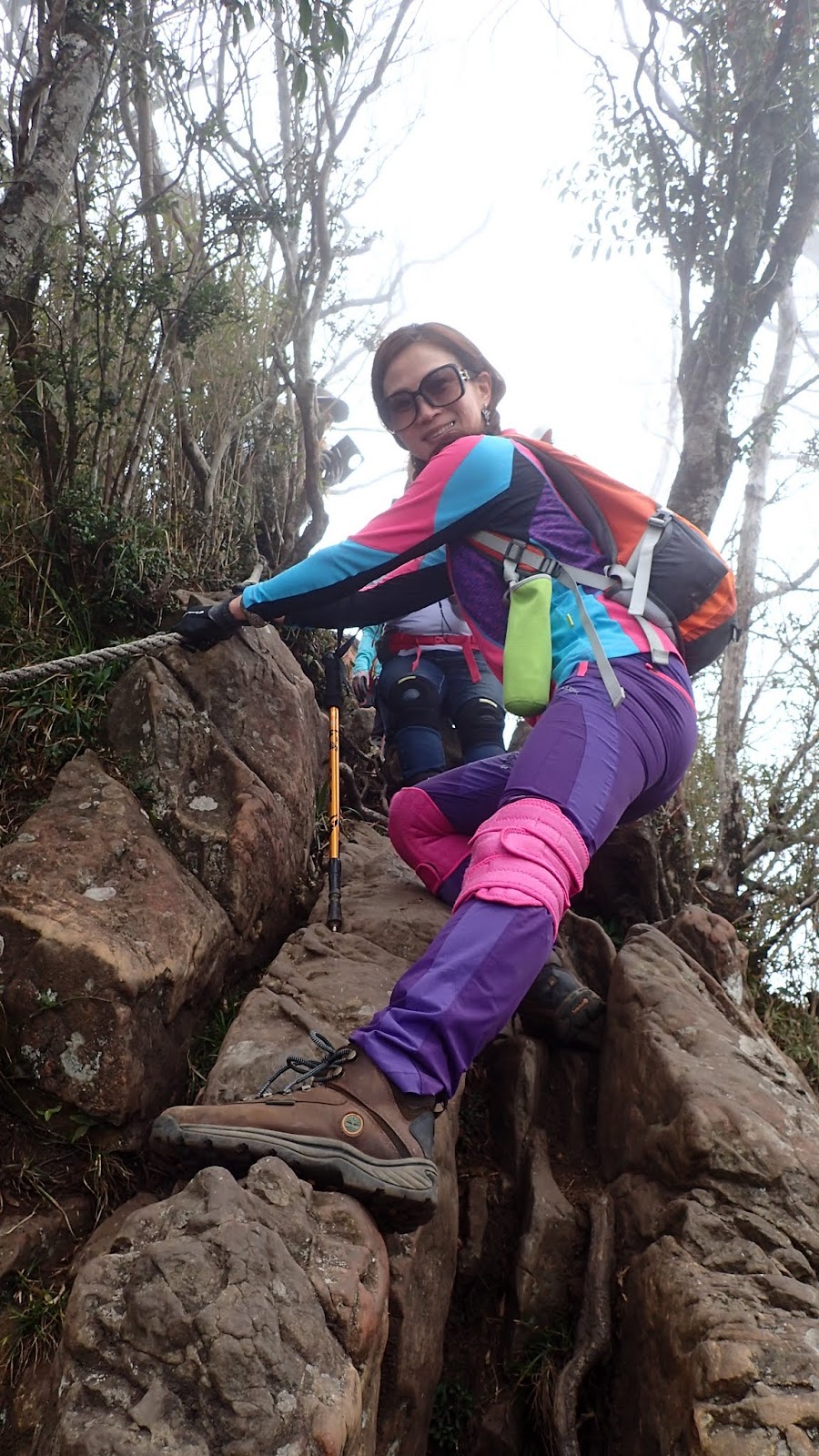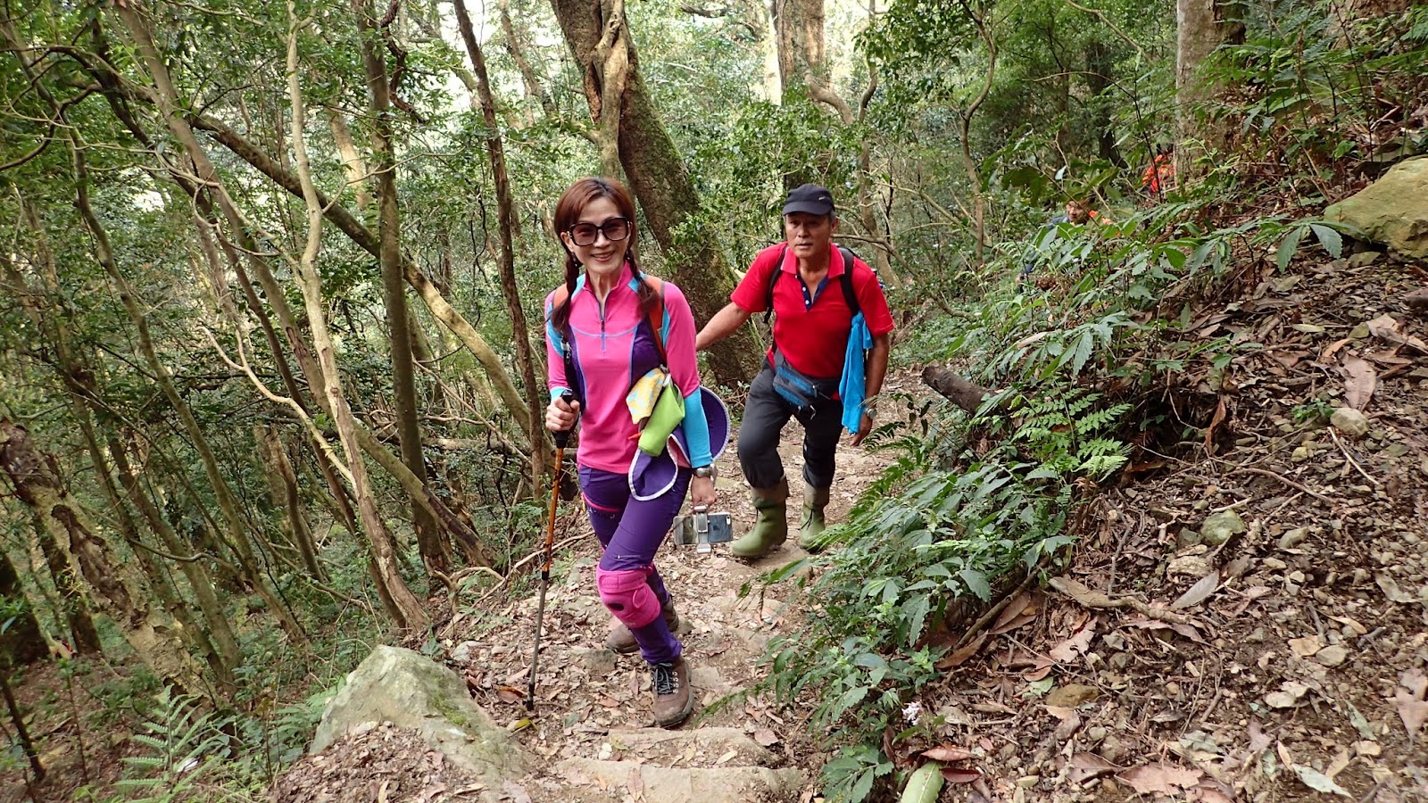 走在杜鵑林內, 一路上景致迷人充滿驚喜, 九段要我們繼續走, 說後面的人如果太晚到可能不讓他們上去了, 歐耶, 取得上加里山的通行證, 新認識的紅衣服姐姐也很喜歡拍照, 沿途幫我們拍好多照片, 瞧那拍照架勢, 專業認真