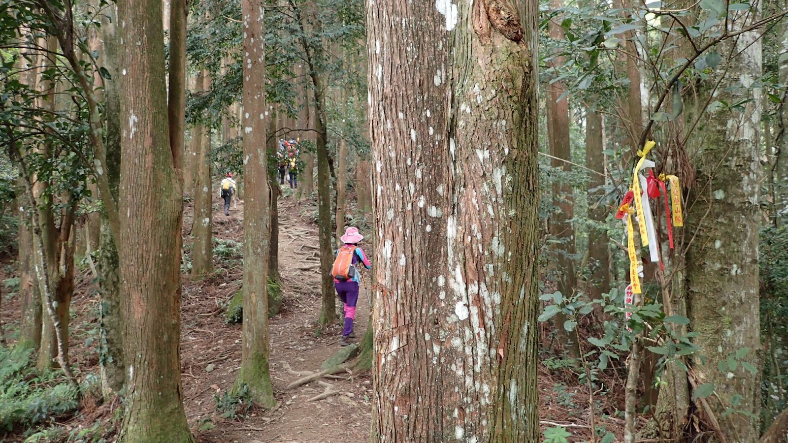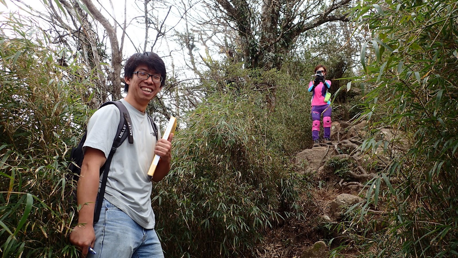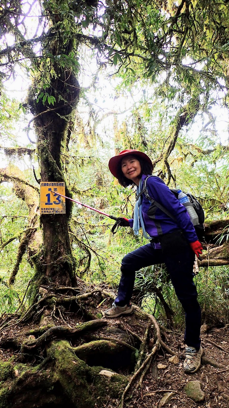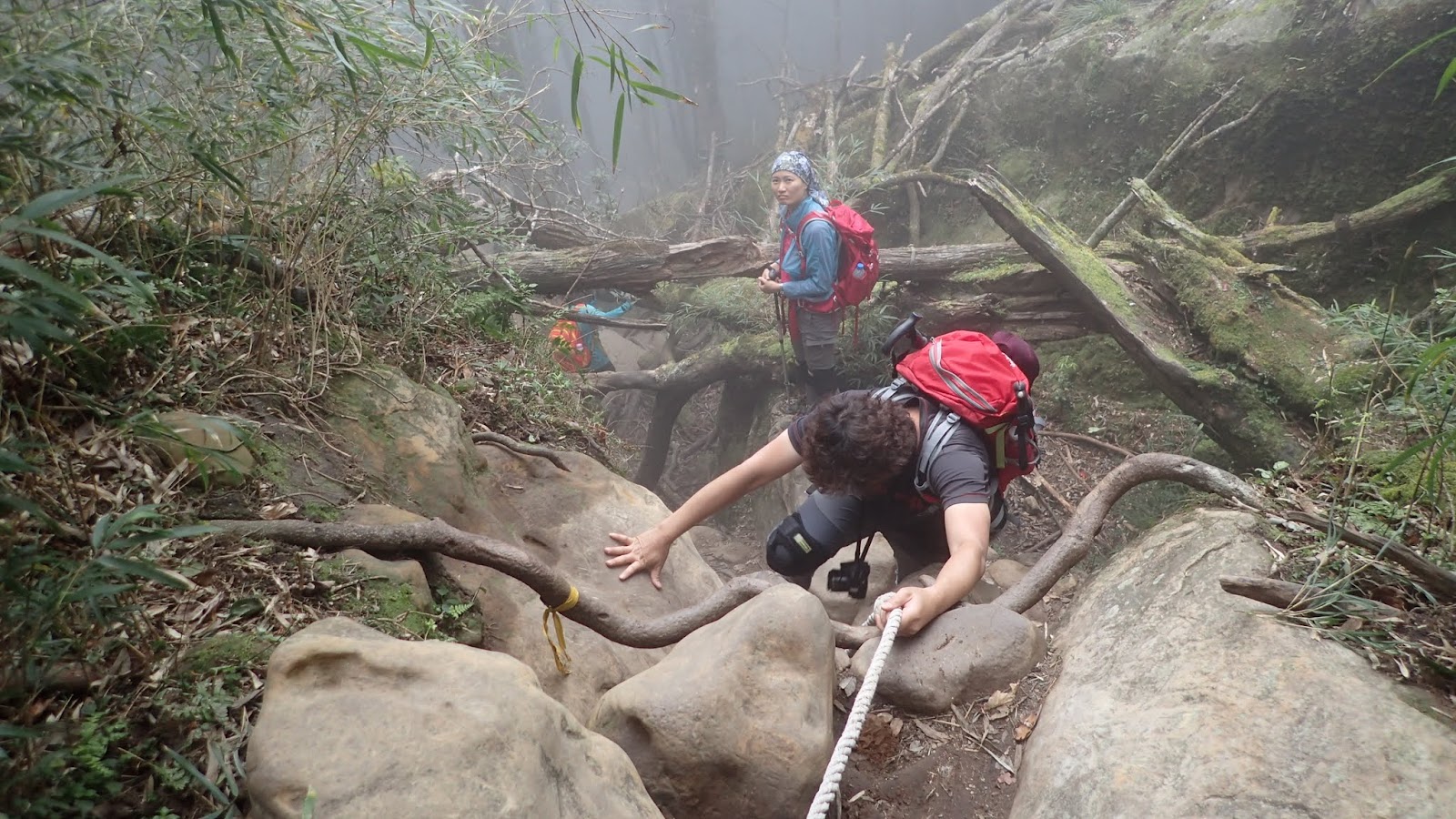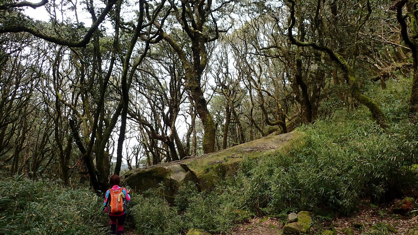 走在杜鵑林內, 一路上景致迷人充滿驚喜, 九段要我們繼續走, 說後面的人如果太晚到可能不讓他們上去了, 歐耶, 取得上加里山的通行證, 新認識的紅衣服姐姐也很喜歡拍照, 沿途幫我們拍好多照片, 瞧那拍照架勢, 專業認真