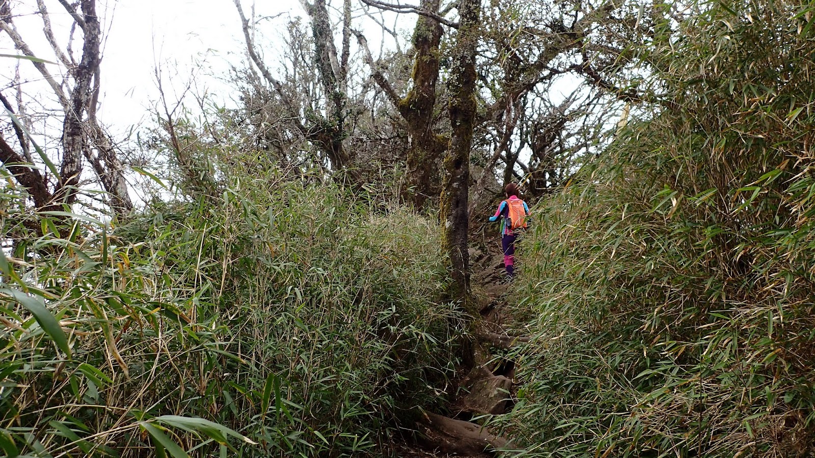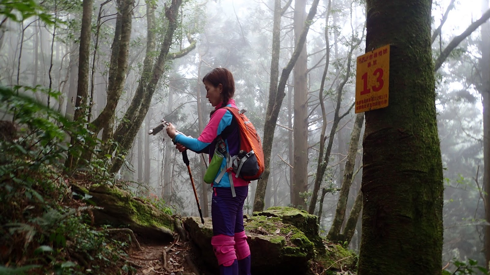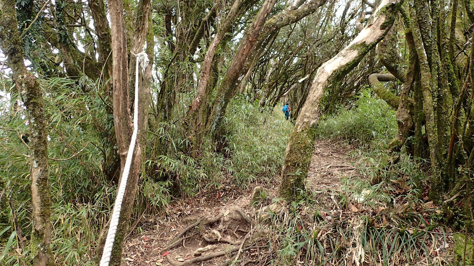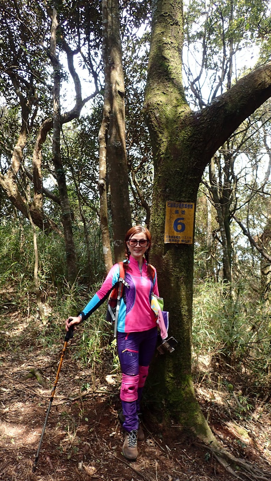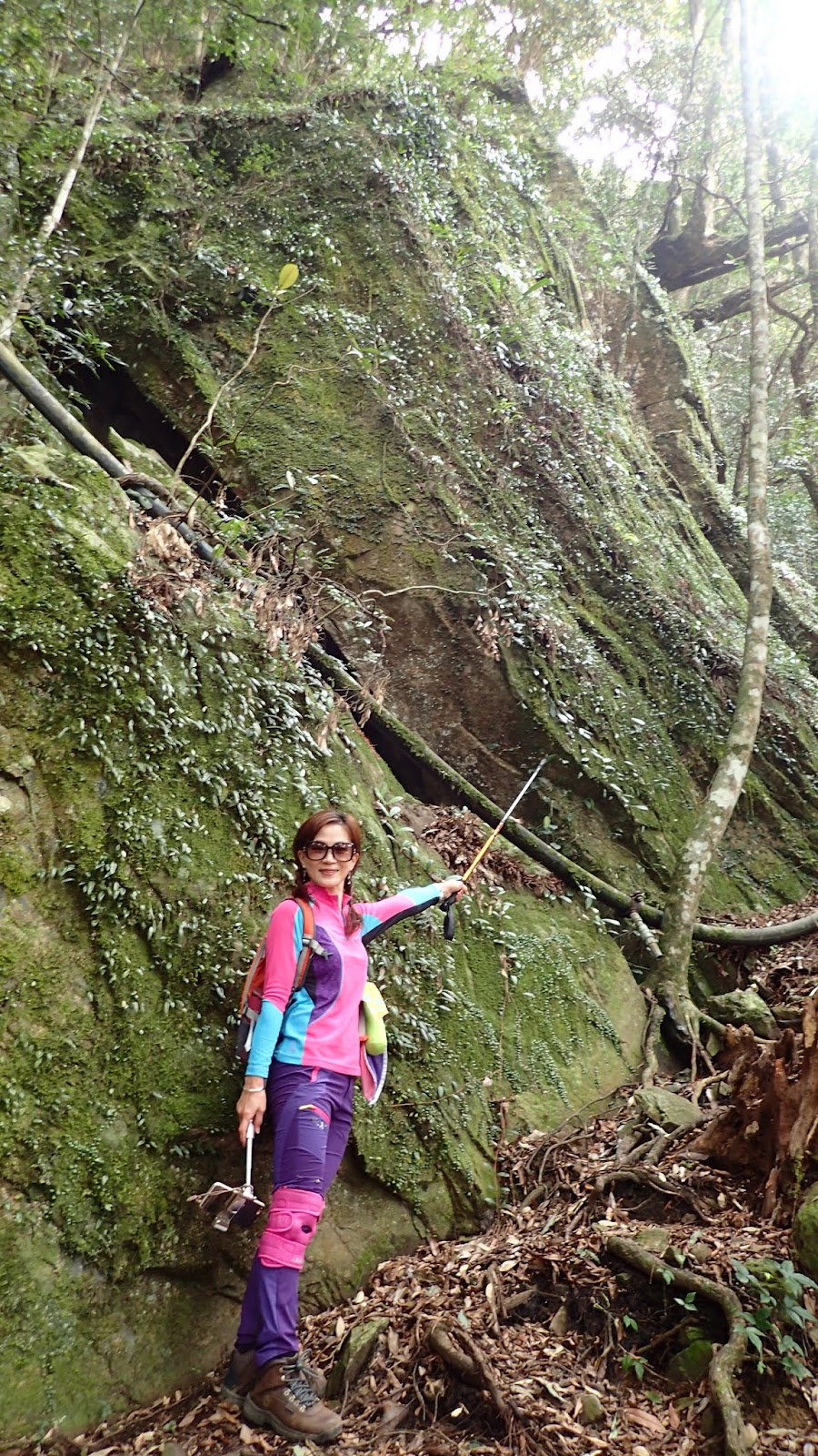 走在杜鵑林內, 一路上景致迷人充滿驚喜, 九段要我們繼續走, 說後面的人如果太晚到可能不讓他們上去了, 歐耶, 取得上加里山的通行證, 新認識的紅衣服姐姐也很喜歡拍照, 沿途幫我們拍好多照片, 瞧那拍照架勢, 專業認真