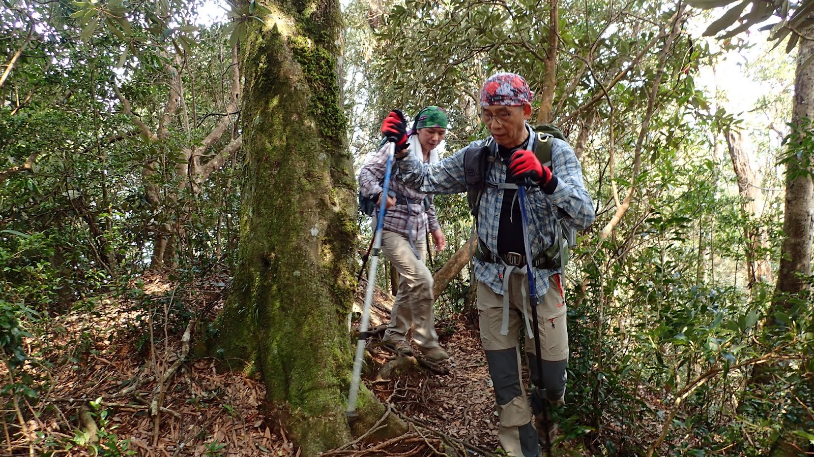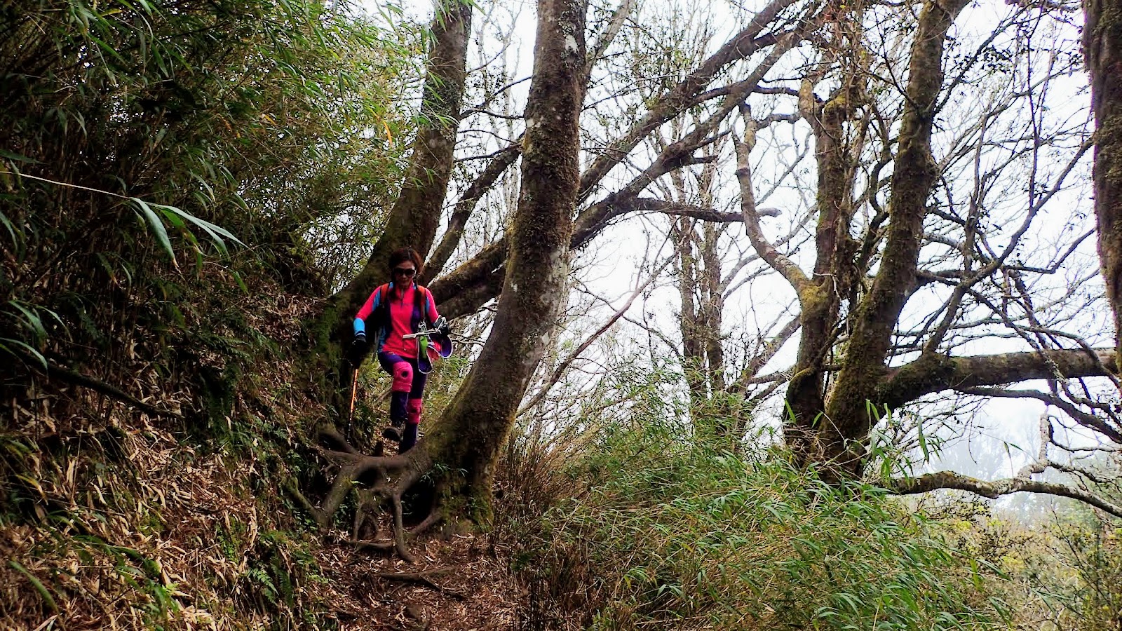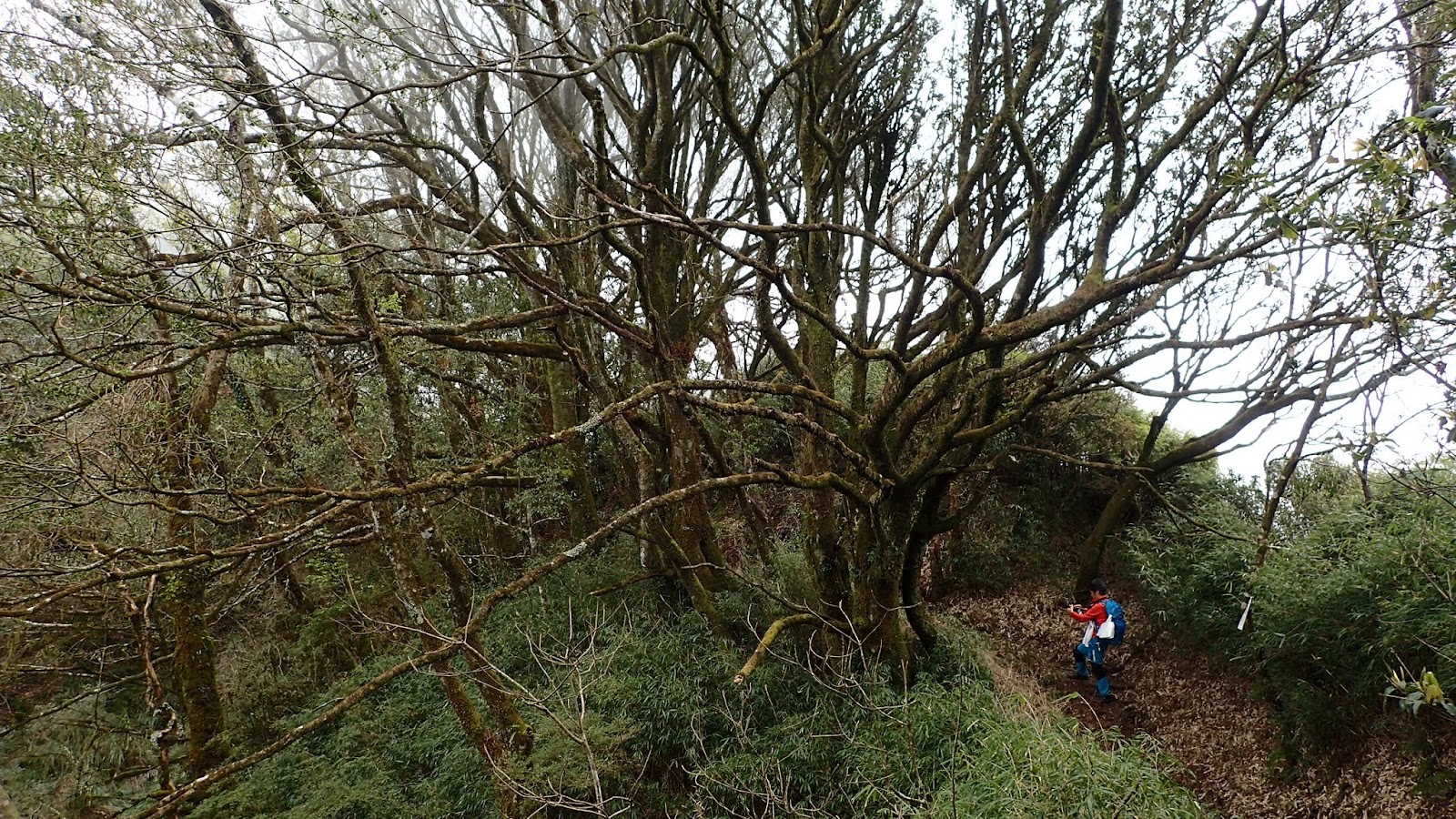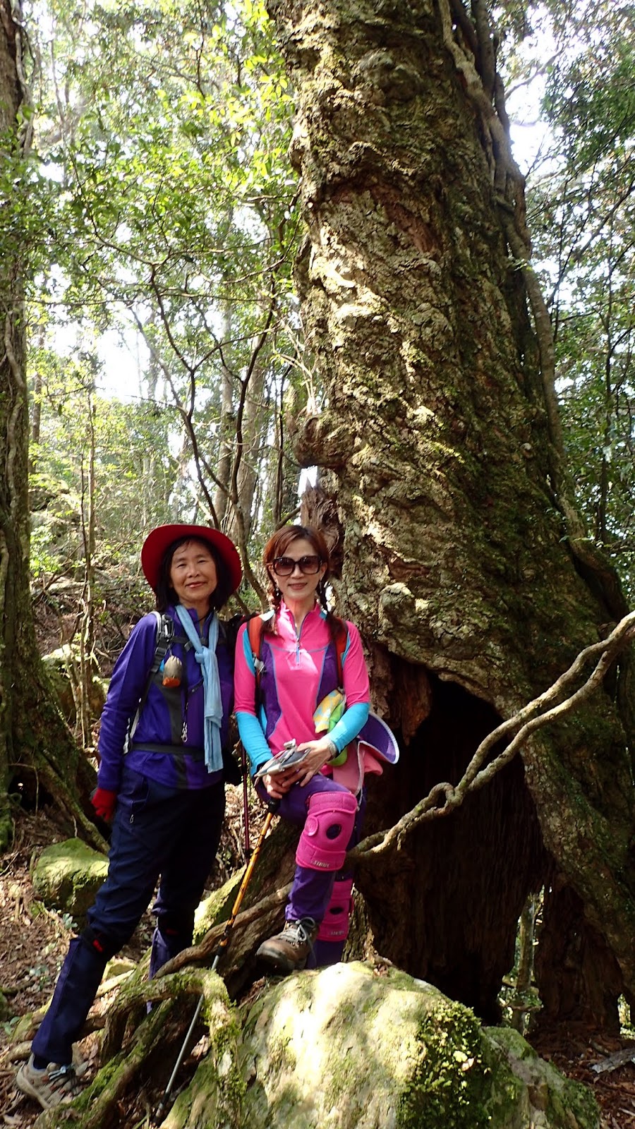 走在杜鵑林內, 一路上景致迷人充滿驚喜, 九段要我們繼續走, 說後面的人如果太晚到可能不讓他們上去了, 歐耶, 取得上加里山的通行證, 新認識的紅衣服姐姐也很喜歡拍照, 沿途幫我們拍好多照片, 瞧那拍照架勢, 專業認真