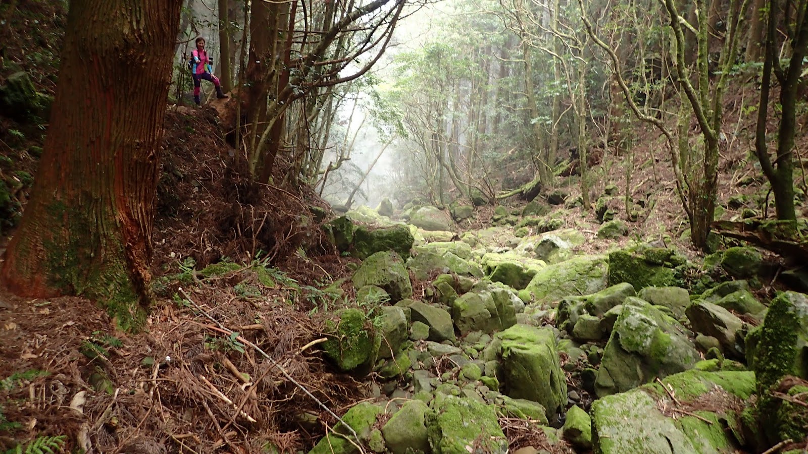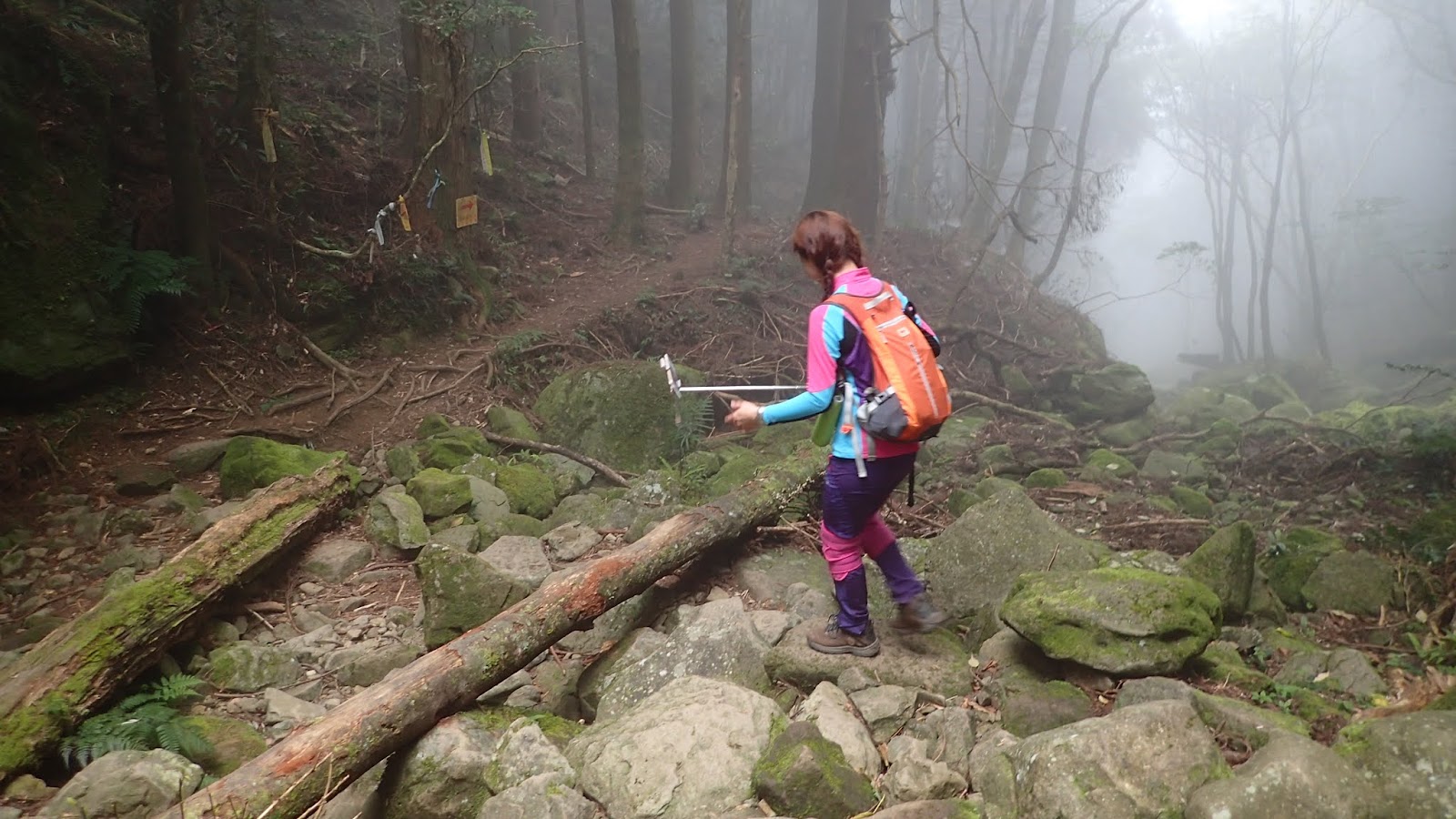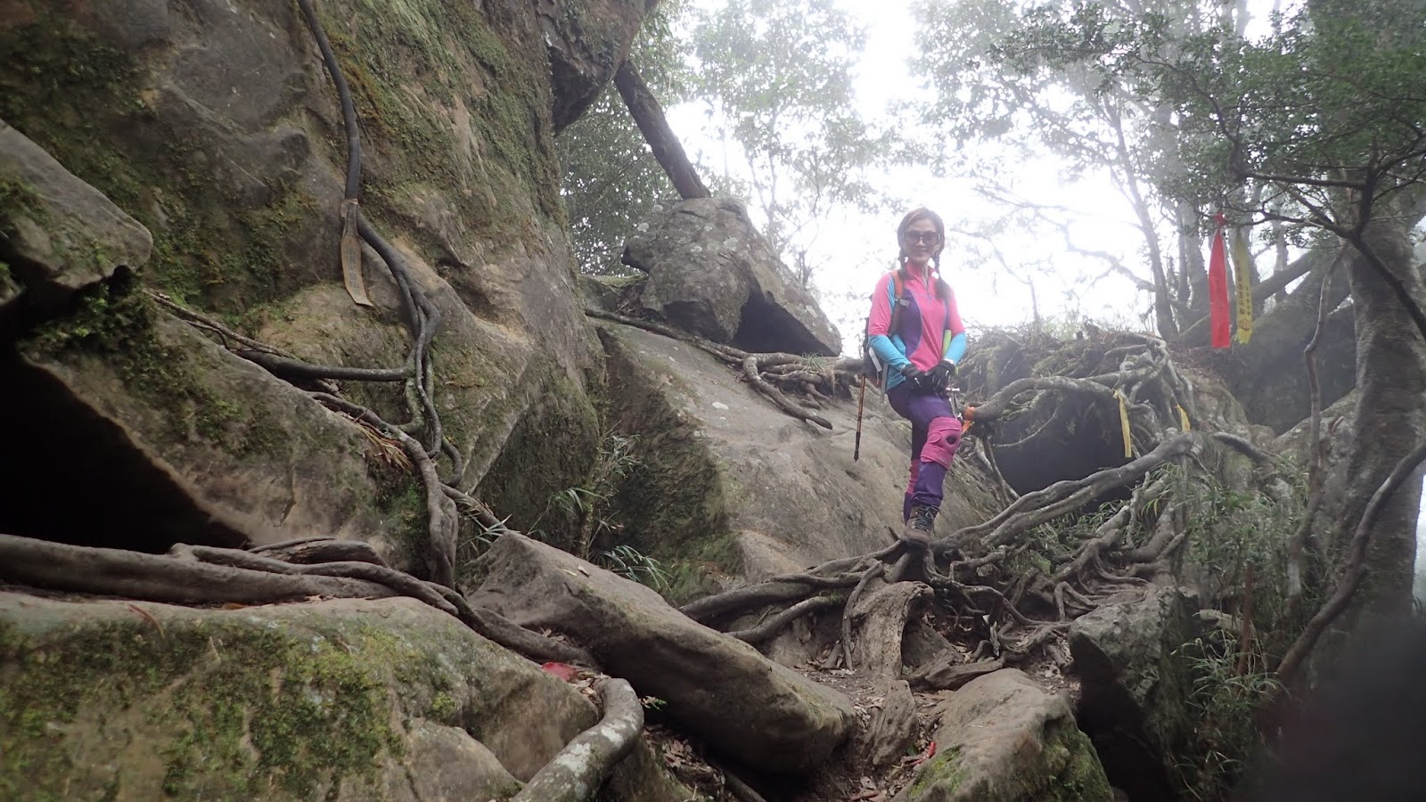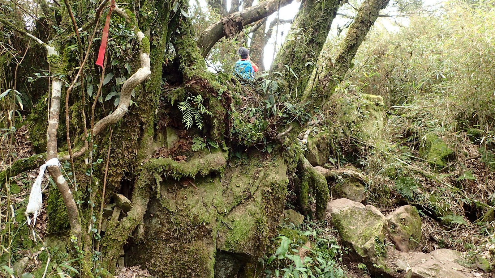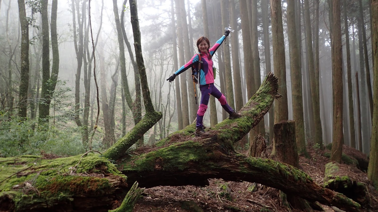 走在杜鵑林內, 一路上景致迷人充滿驚喜, 九段要我們繼續走, 說後面的人如果太晚到可能不讓他們上去了, 歐耶, 取得上加里山的通行證, 新認識的紅衣服姐姐也很喜歡拍照, 沿途幫我們拍好多照片, 瞧那拍照架勢, 專業認真