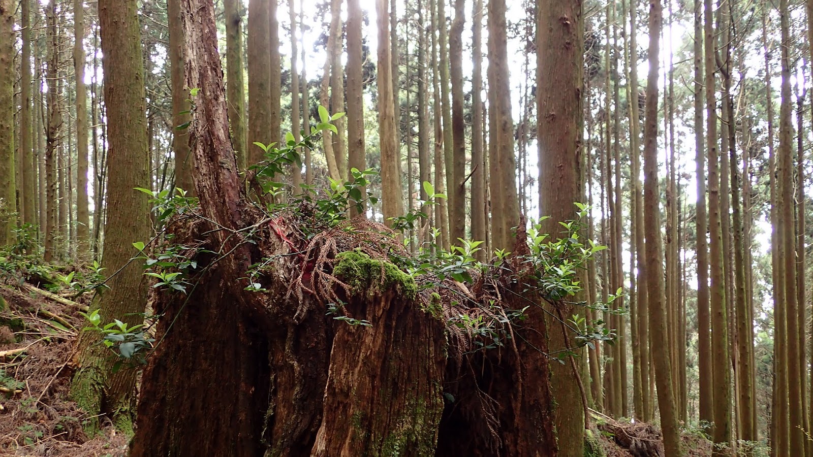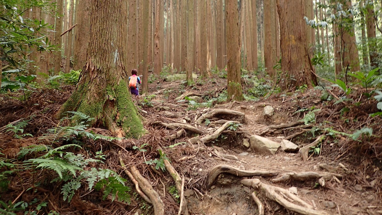 高大筆直的柳杉林內涼爽舒服極了, 步道氣根纏繞盤根錯節, 泥土路鬆軟如同走紅地毯, 沿途景色優美, 歡快的鳥鳴聲不絕於耳吟唱, 如同置身於大自然的聖殿
